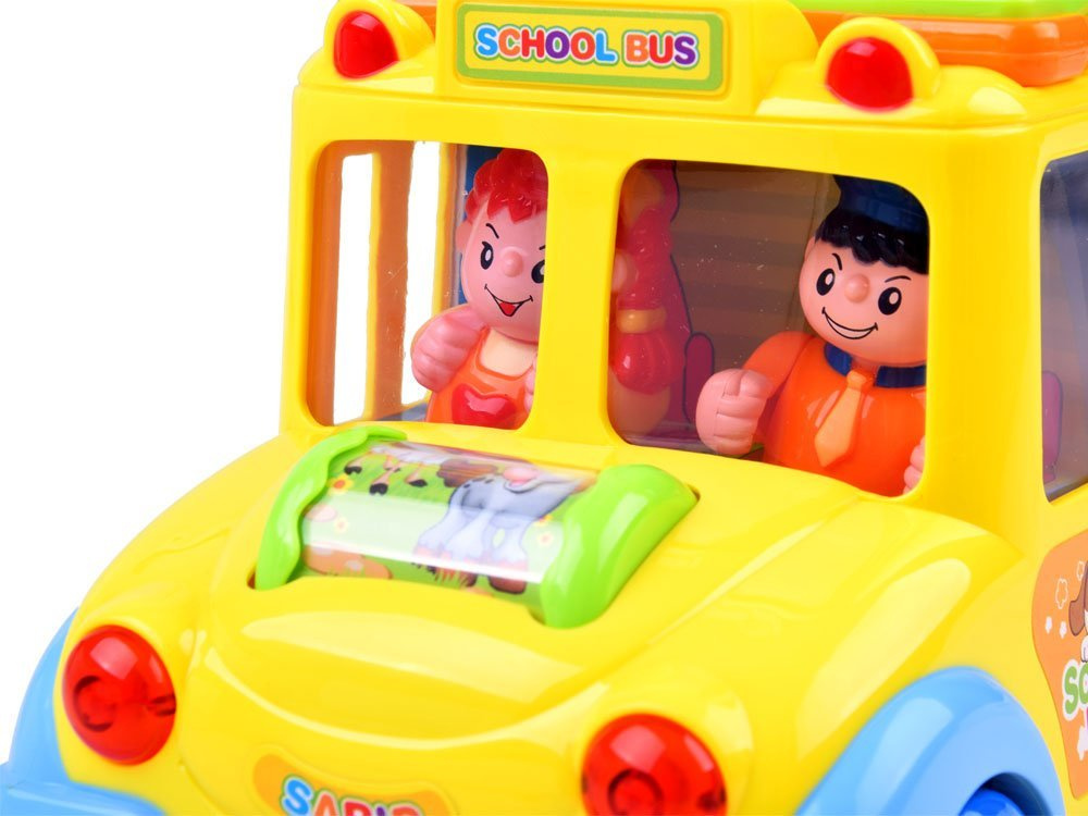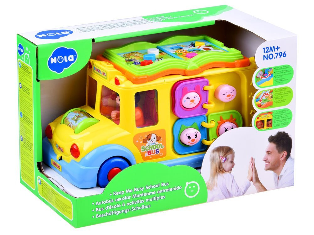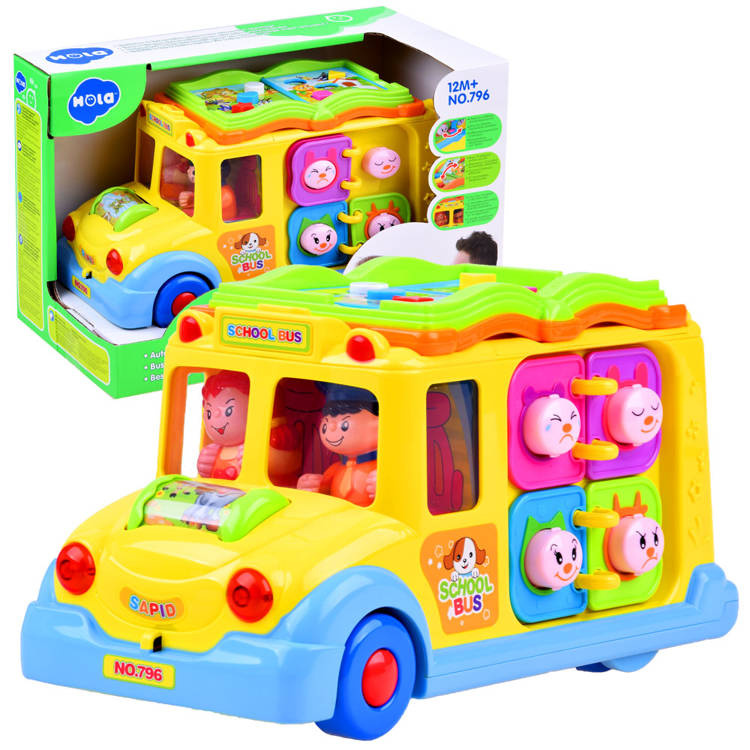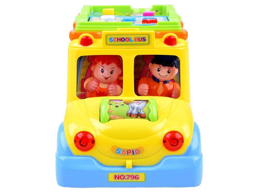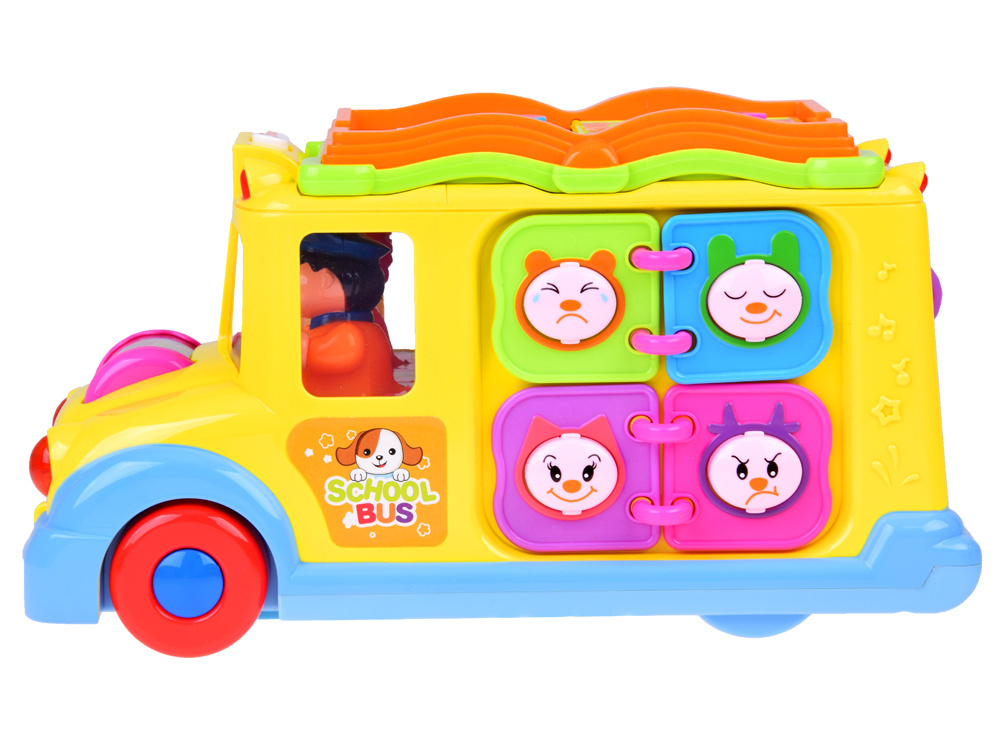 Jucăria poate merge singură și își poate schimba direcția de mers de fiecare dată când întâlnește un obstacol, dar copilul o poate conduce și independent. În timpul călătoriei, muzica veselă cântă și farurile din față clipesc. În partea din față a autobuzului se află un cilindru rotativ colorat cu animăluțe, care, după ce este rotit, declanșează sunete de copil râzând și o melodie. Pe acoperișul jucăriei se află o broșură colorată cu nasturi de diferite culori și forme. Apăsarea butoanelor va declanșa sunetele animalelor care sunt în imagine. Butonul declanșează, de asemenea, sunete de claxon, pornirea motorului și melodii. Pe partea laterală a mașinii sunt 4 emoticoane cu expresii diferite, de la vesel la trist. Emoticoanele sunt înconjurate de rame colorate, care sunt aranjate ca paginile unei cărți. Pe cealaltă parte a vehiculului sunt 4 roți dințate cu o manivelă care poate fi rotită. Pe partea din spate a jucăriei sunt uși cu un clopoțel care scoate sunet. În spatele ușilor sunt imagini colorate care se schimbă după ce întorci cheia.