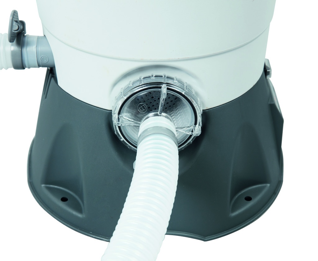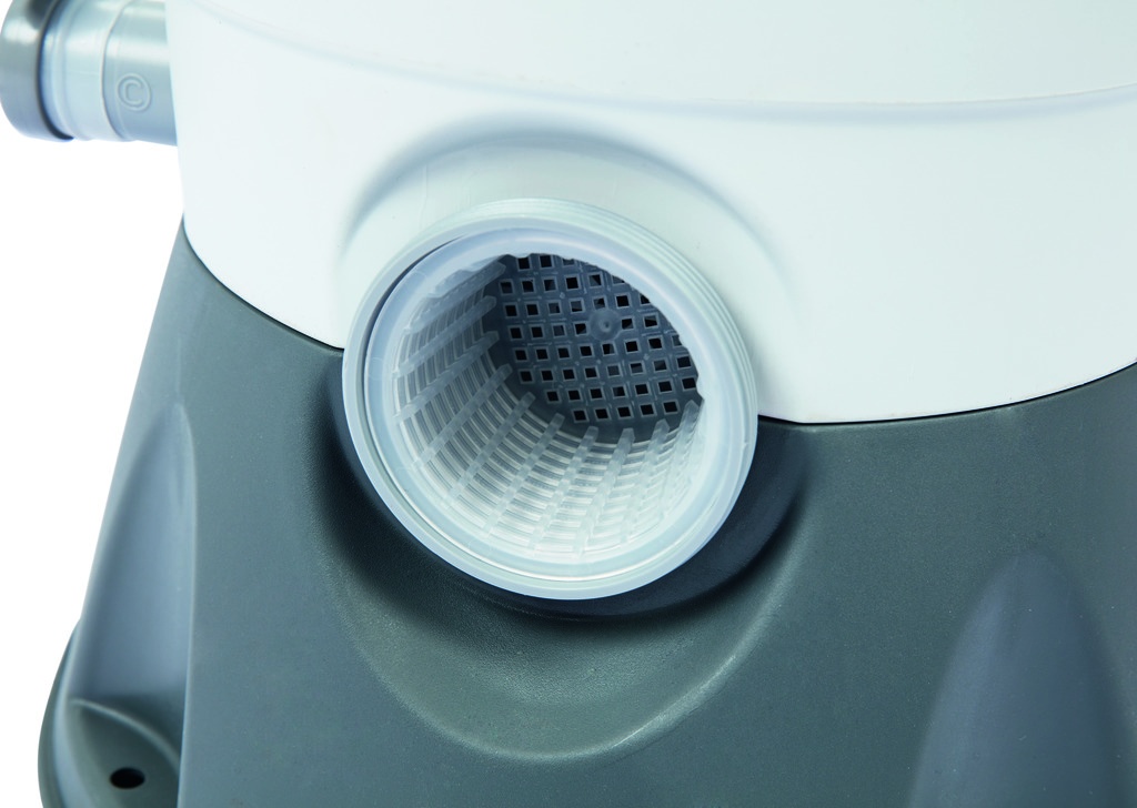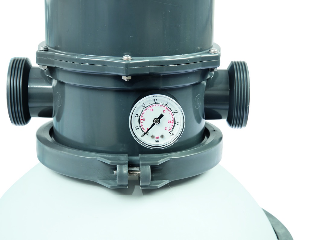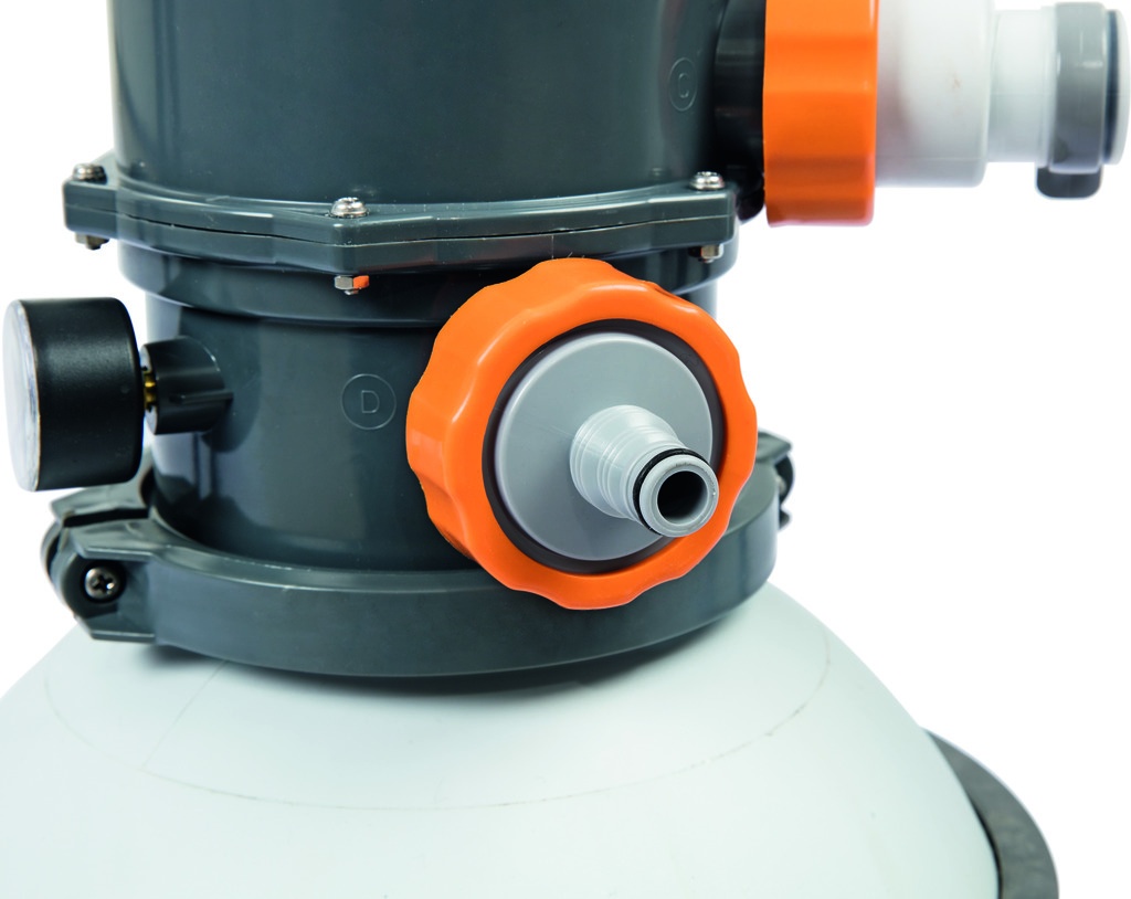 Dispozitivul de filtrare cu nisip de la firma Bestway este compus dintr-o bază de plastic, un recipient de filtrare din polipropilenă cu o supapă superioară cu 6 căi, un manometru și o pompă cu un prefiltru pentru impurități grosiere.