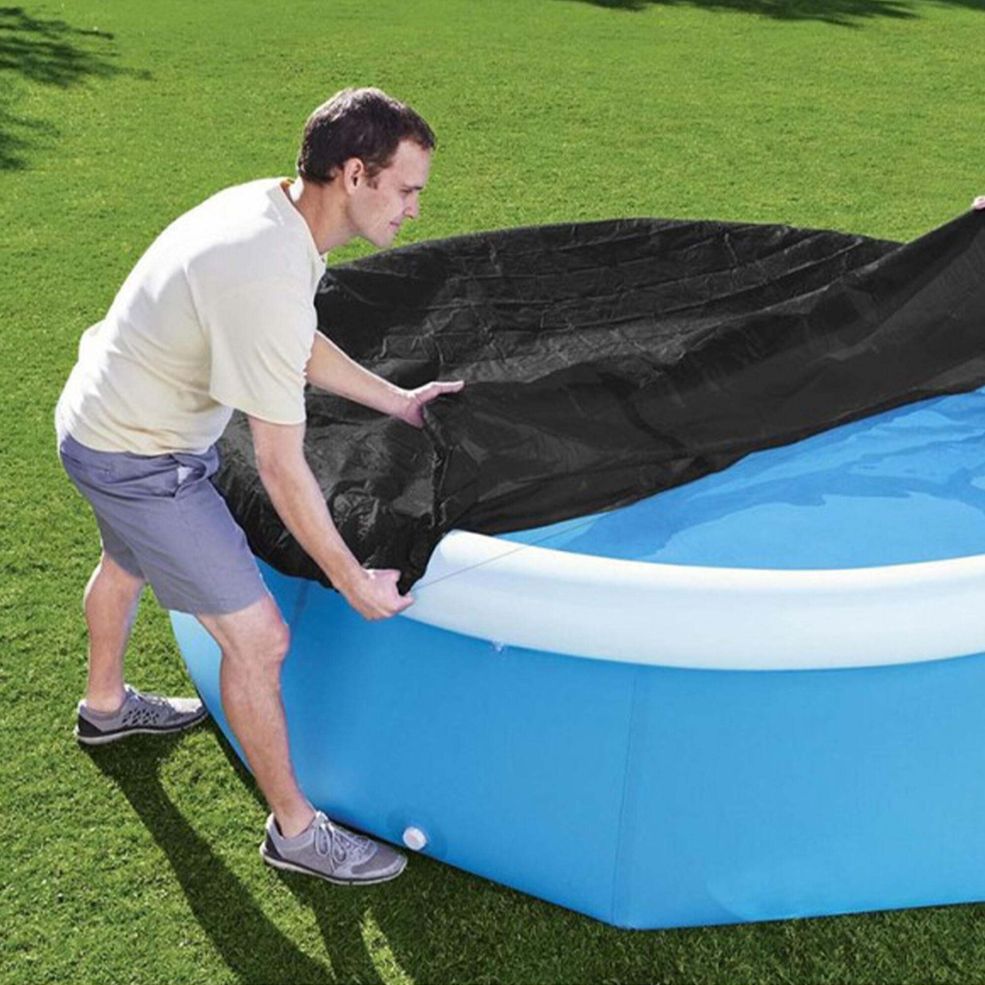Prelată de acoperire pentru piscine Bestway cu dimensiunea de 244 cm, oferă o protecție excelentă împotriva ploii și a căderii de impurități în piscina dumneavoastră atunci când piscina nu este utilizată.