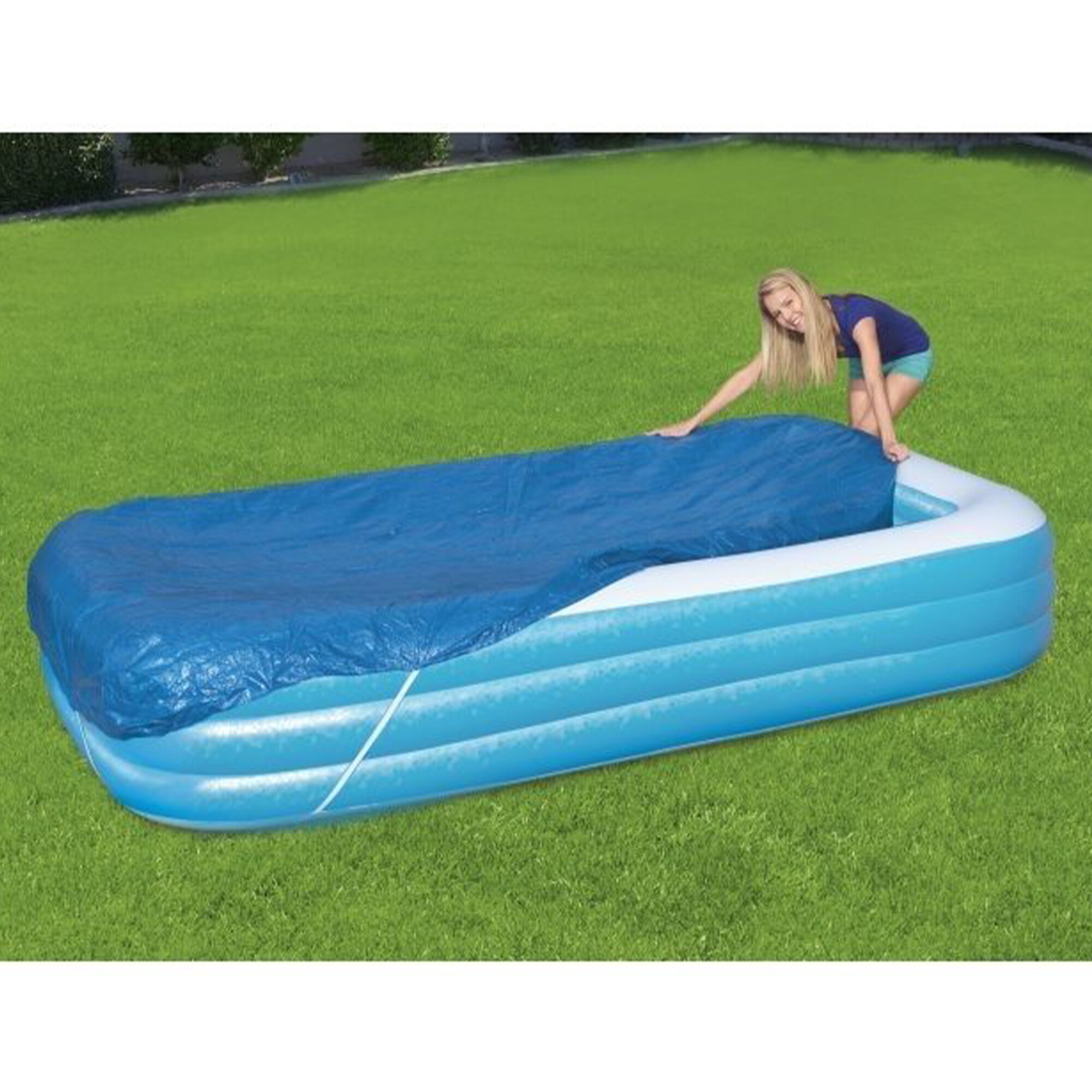 Prelată de acoperire pentru piscine Bestway cu dimensiunea de 305x183x56 cm, oferă o protecție excelentă împotriva ploii și a căderii de impurități în piscina dumneavoastră atunci când piscina nu este utilizată.