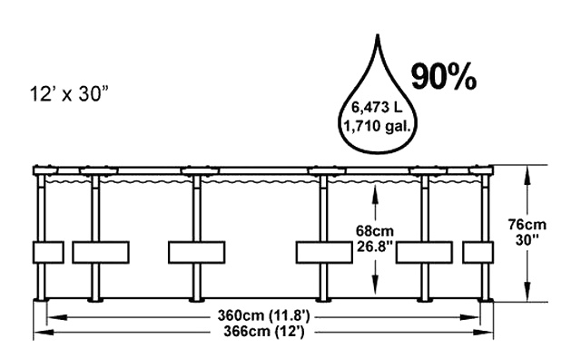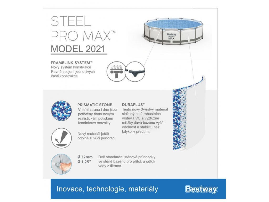 Pereții extrem de rezistenți ai acestei piscine sunt construiți din materialul Dura Plus™, care este un material armat cu 3 straturi, având o plasă de poliester plasată între două straturi de PVC de înaltă rezistență. Grosimea totală a peretelui este de 0,40 până la 0,80 mm, în funcție de dimensiunea piscinei. Oferă o rezistență și durabilitate extraordinară.