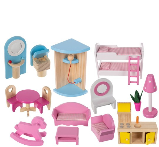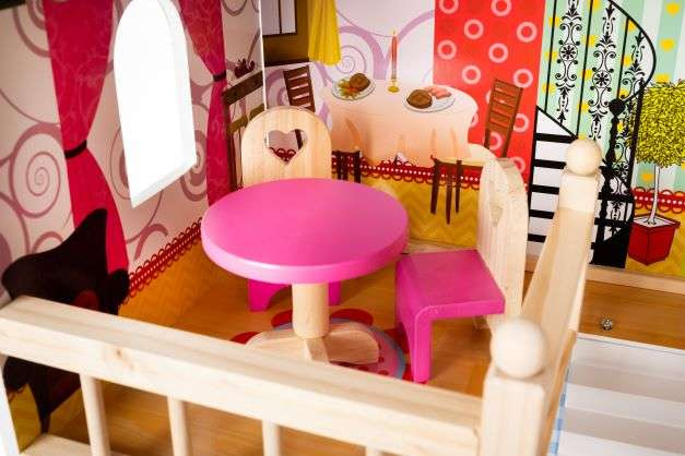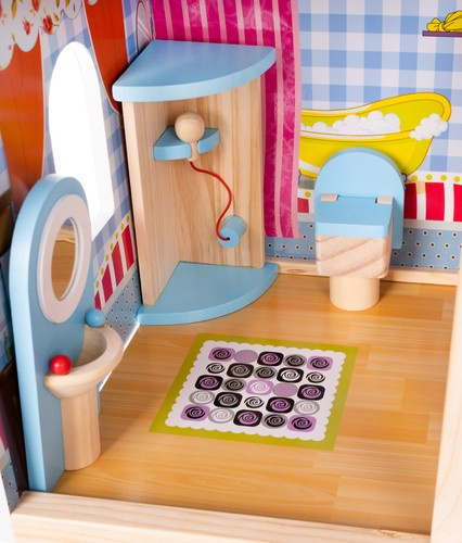 SPECIFICAȚII - culoare: multicolor; material: lemn; număr de elemente în set: 15 + căsuță; dimensiuni (lungime / lățime / înălțime): 29/59 / 90cm; număr de niveluri: 3; număr de camere: 5 + balcon; greutate: 10 kg; greutate în ambalaj: 11,25 kg