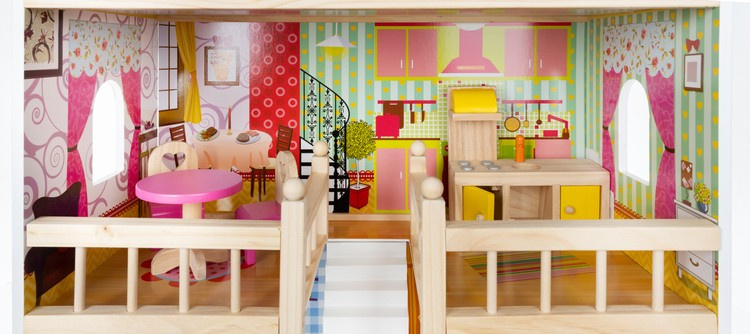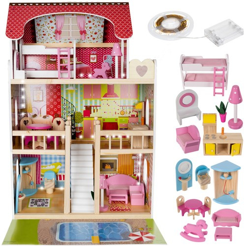 SPAȚIOS - căsuța de păpuși din lemn este destinată unei familii de păpuși de 4 membri. Are 3 niveluri, care sunt interconectate prin scări albe frumoase, până la 5 camere și un balcon. Fiecare păpușă visează la o casă atât de mare!