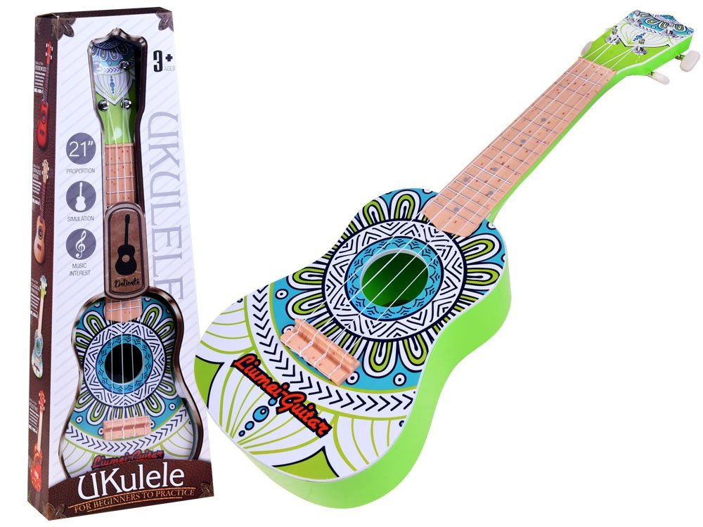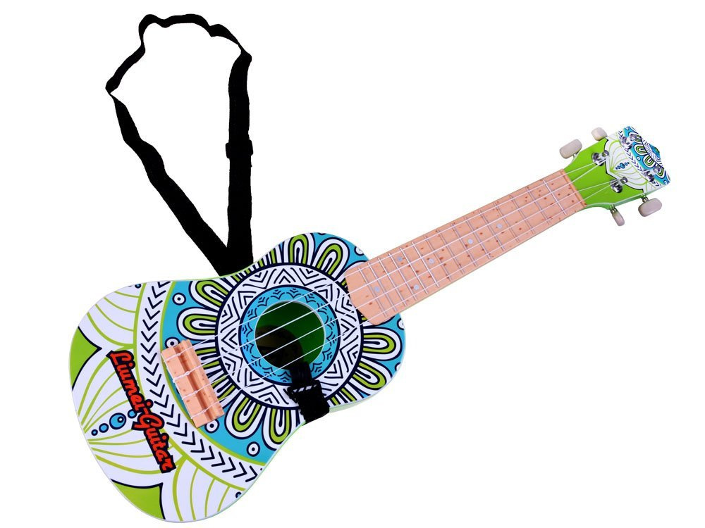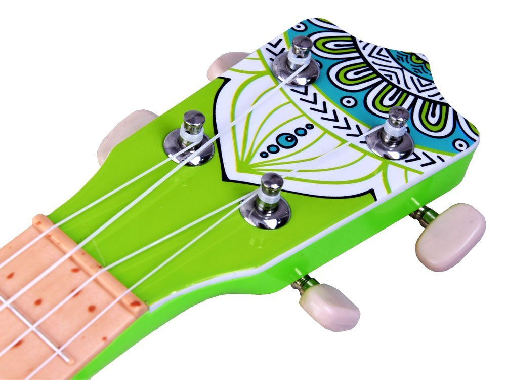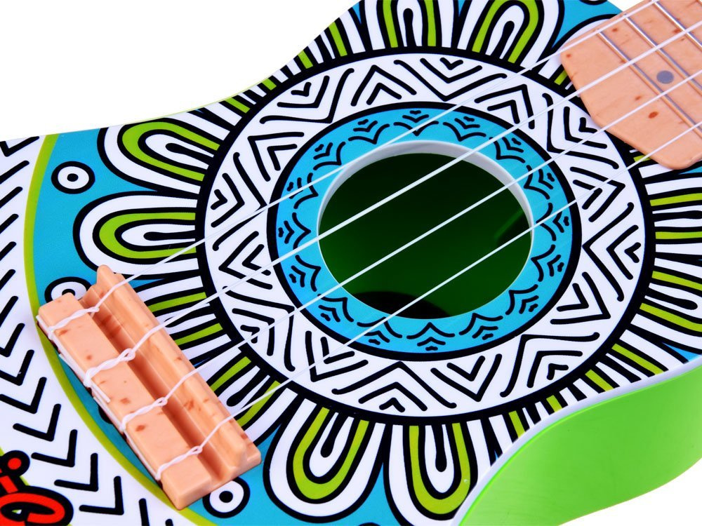 Dimensiunea chitarei este proiectată având în vedere cei mai mici copii.Chitara este fabricată în întregime din plastic, într-un design inovator de culoare și creează o impresie uimitoare.