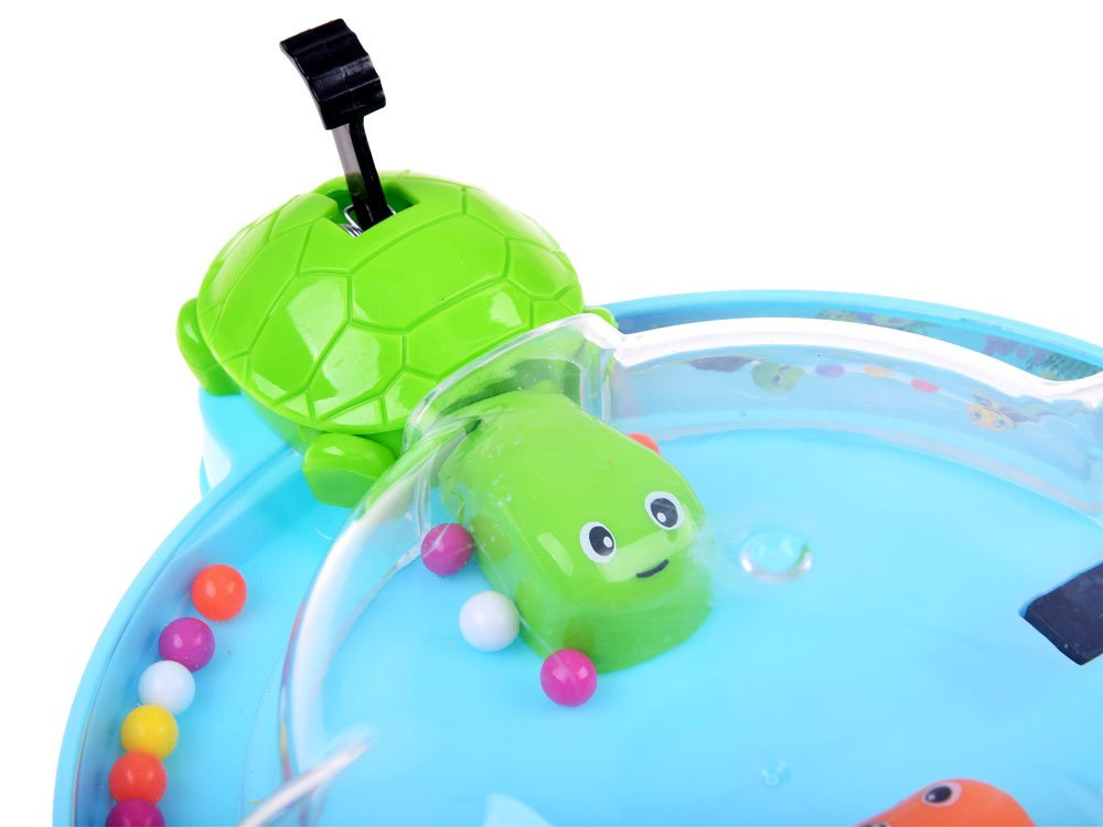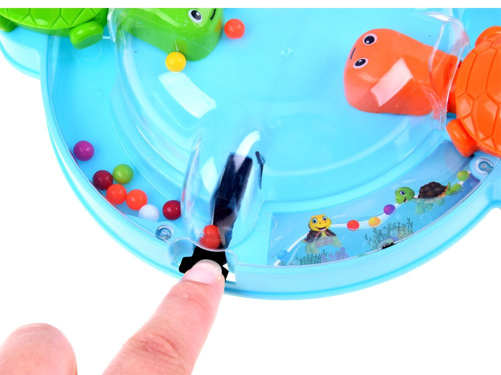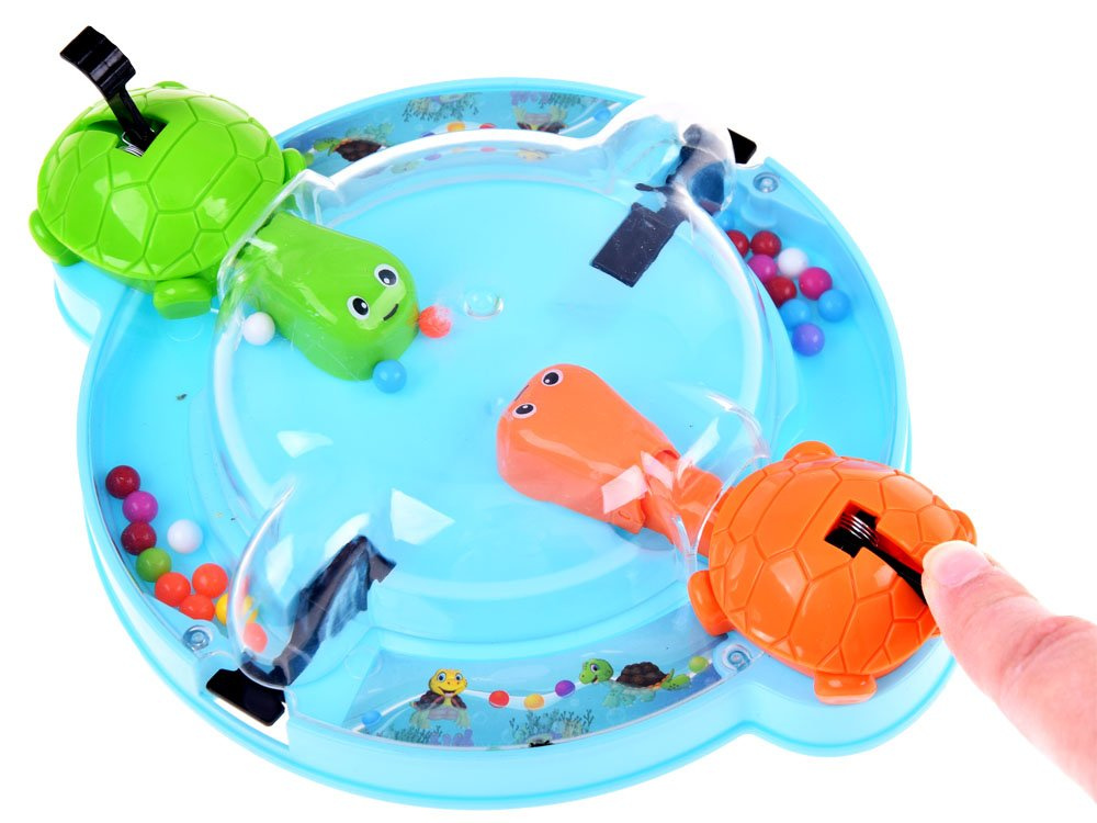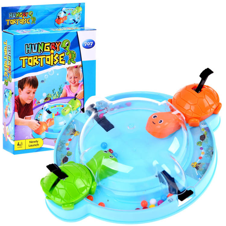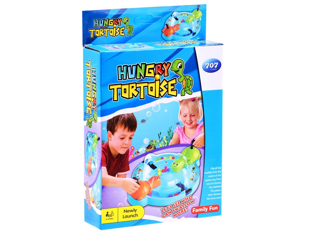Joc de îndemânare Țestoasele flămânde este o distracție veselă pentru două persoane. Broaștele țestoase adoră să mănânce, iar cea care mănâncă cele mai multe bile câștigă. Un nou mod de a depozita bilele și țestoasele face ca curățenia după joacă să dureze doar un moment. Țestoasele flămânde sunt o distracție grozavă atât pentru copii, cât și pentru părinți. Ne așezăm confortabil și hrănim animalele flămânde. Pe baza rotundă veți găsi 2 țestoase, cărora le este suficient să apăsați pe cozi pentru a-și deschide gurile. Alegeți-vă câte un animal și încercați să prindeți cu el cât mai multe bile care se rostogolesc pe tablă. Când țestoasele voastre au mâncat deja toate bilele, numărați-le și vedeți cine a câștigat. Și, desigur, câștigă cel care a reușit să mănânce cel mai mult.