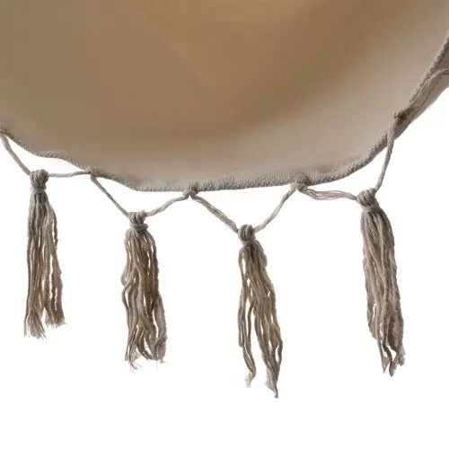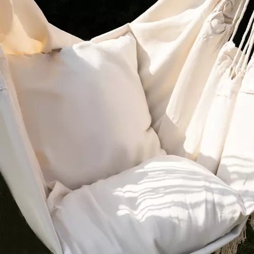 MATERIAL DURABIL - 65% bumbac asigură o ventilație corespunzătoare, ceea ce influențează confortul utilizării scaunului suspendat chiar și în zilele fierbinți. Pentru fermitatea șezutului este responsabil un adaos de 35% poliester. Roata de montaj fixă este conectată la frânghii rezistente, distribuite uniform pe părțile laterale ale hamacului printr-o bară de lemn. Această construcție formează un întreg ușor de agățat și hamacul este bine echilibrat și stabil.