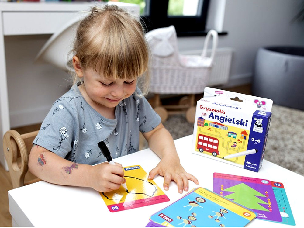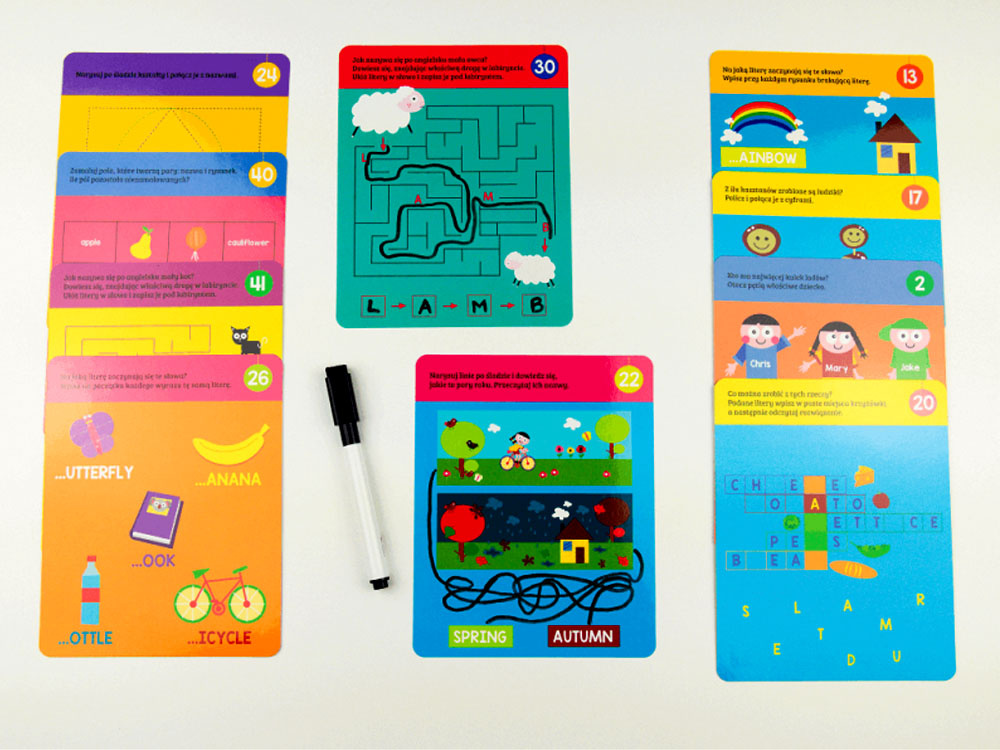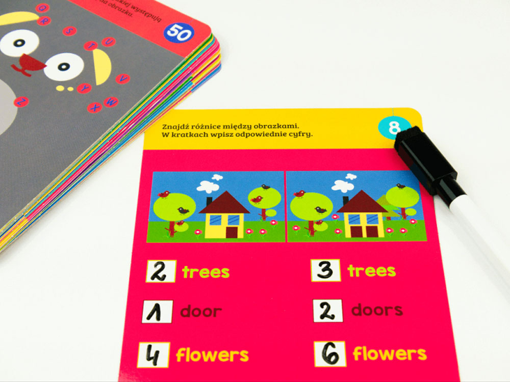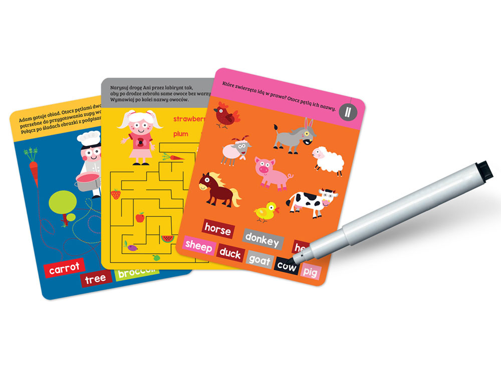 Ilustrațiile colorate și sarcinile variate încurajează numărarea, rezolvarea cuvintelor încrucișate și a ghicitorilor, găsirea cuvintelor ascunse, asocierea imaginilor cu descrieri și aranjarea poveștilor ilustrate în ordinea corectă. Datorită diferitelor jocuri, copiii învață culorile, numerele, denumirile animalelor, magazinelor, fructelor și legumelor, precum și jucăriile. Datorită markerului inclus, care este uscat-ștergător, exercițiile pot fi rezolvate de mai multe ori.