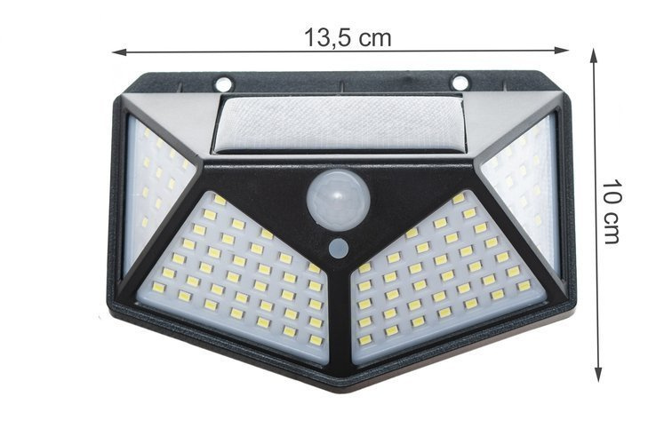 SPECIFICAȚII - Culoare: negru; material: ABS + PC; număr LED: 100; panou solar: monocristalin; baterie: litiu 3,7V; putere de ieșire: 7W; timp de încărcare: 6 ore la soare; Unghi de detectare PIR: 120 de grade; unghi de lumină: 270 de grade; distanța de detectare: 8-10m; impermeabil: IP65; dimensiuni (lățime / înălțime): 13,5 / 10 cm, greutate: 0,15 kg; greutate în ambalaj: 0,20 kg.