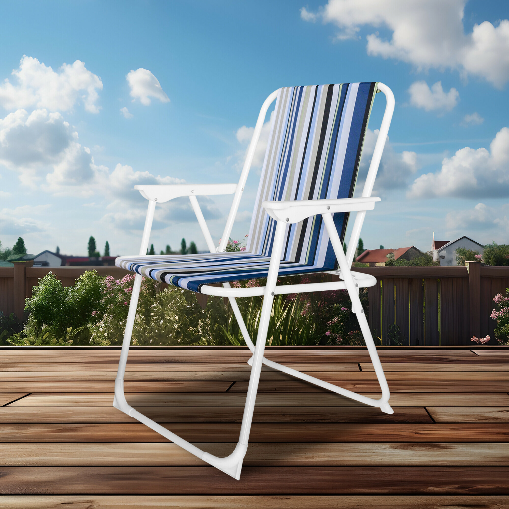 Scaun de grădină pliabil cu cotiere confortabile, ideal pentru camping, dar cu siguranță își va găsi utilizarea și la pescari, modelatori, proprietari de cabane și case de vacanță.