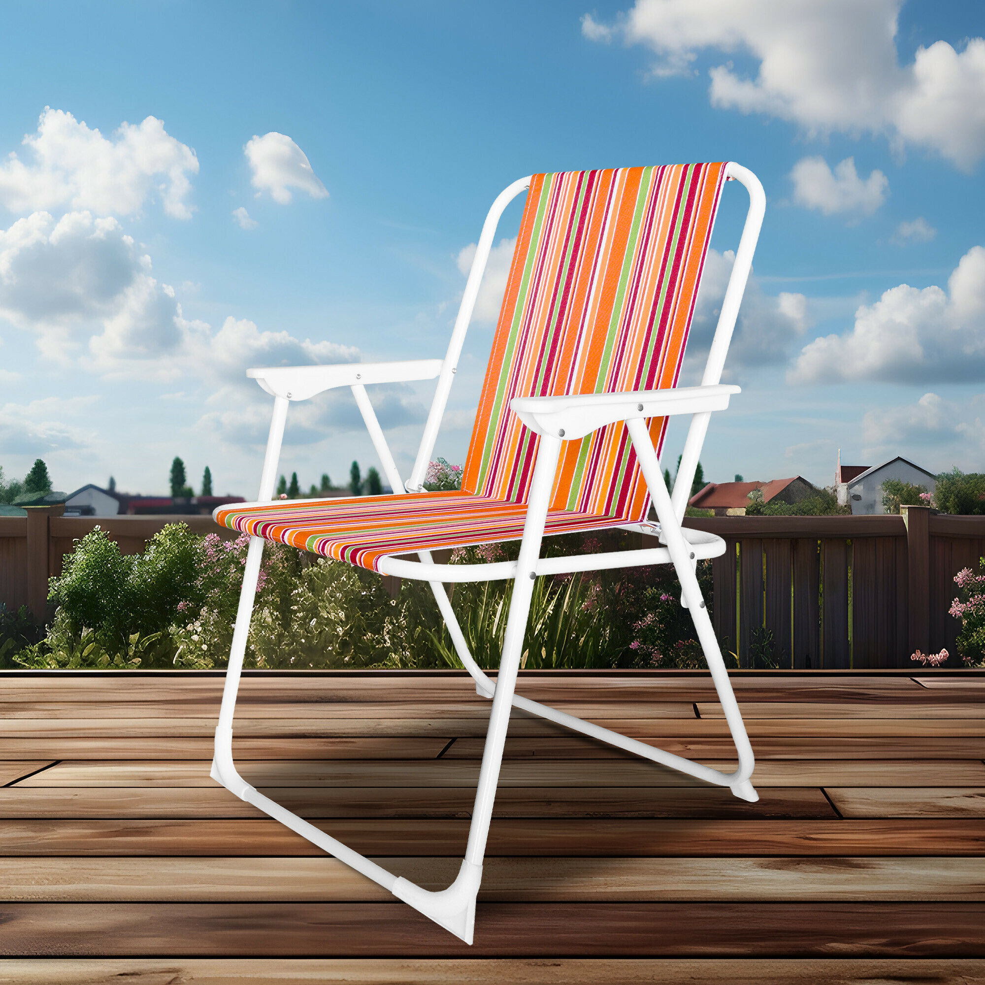 Scaun de grădină pliabil cu cotiere confortabile, ideal pentru camping, dar cu siguranță își va găsi utilizarea și la pescari, modelatori, proprietari de cabane și case de vacanță.