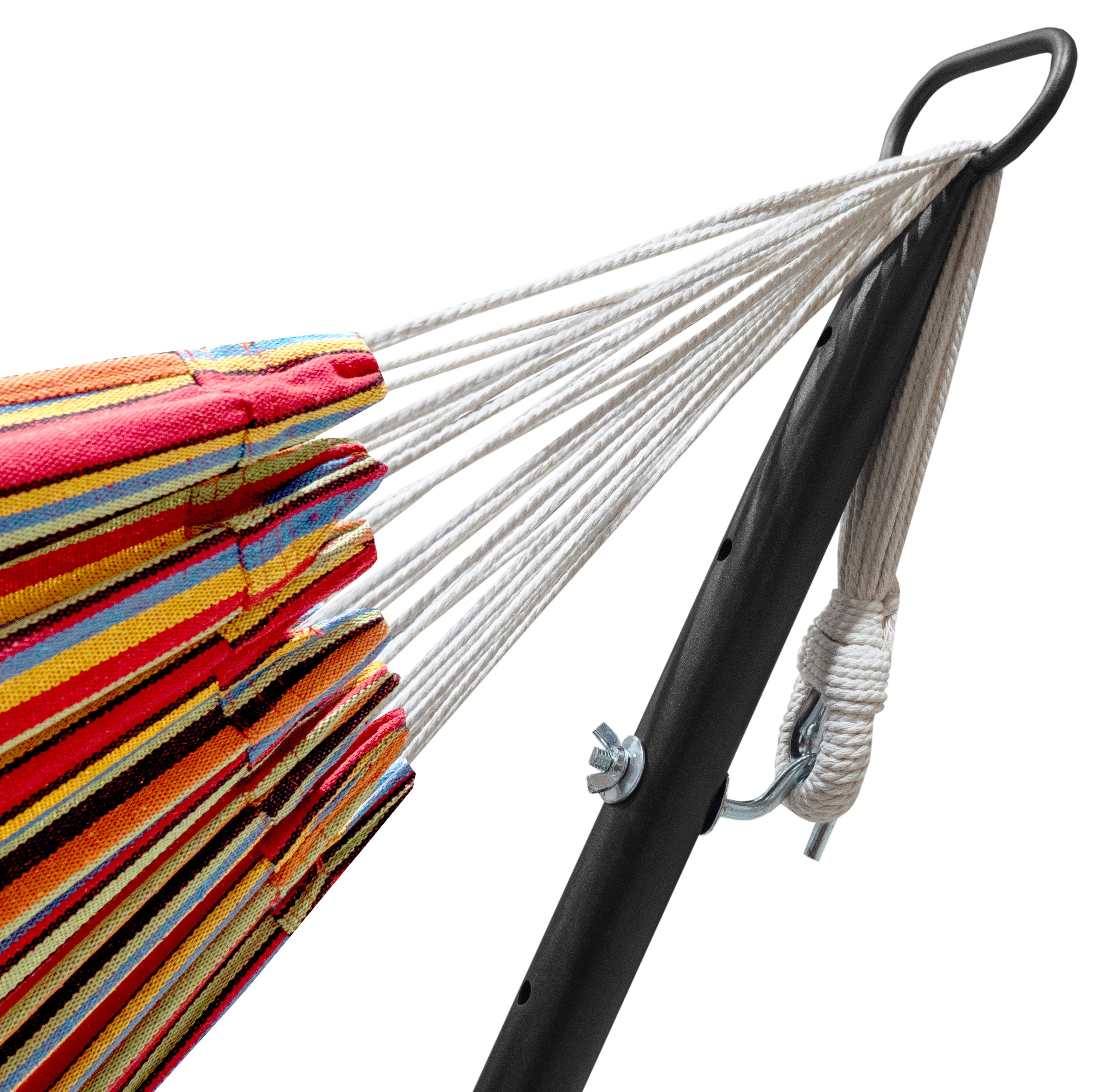Structură din cadru de oțel rezistent, vopsit prin metoda cu pulbere, care datorită construcției sale portante oferă o stabilitate deosebit de sigură. Datorită țesăturii confortabile din poliester, hamacul este foarte confortabil.Suprafața de dormit, datorită dimensiunilor de 150x200 cm, oferă suficient spațiu pentru oricine, chiar și pentru două persoane. Până la o capacitate maximă de 150 kg.