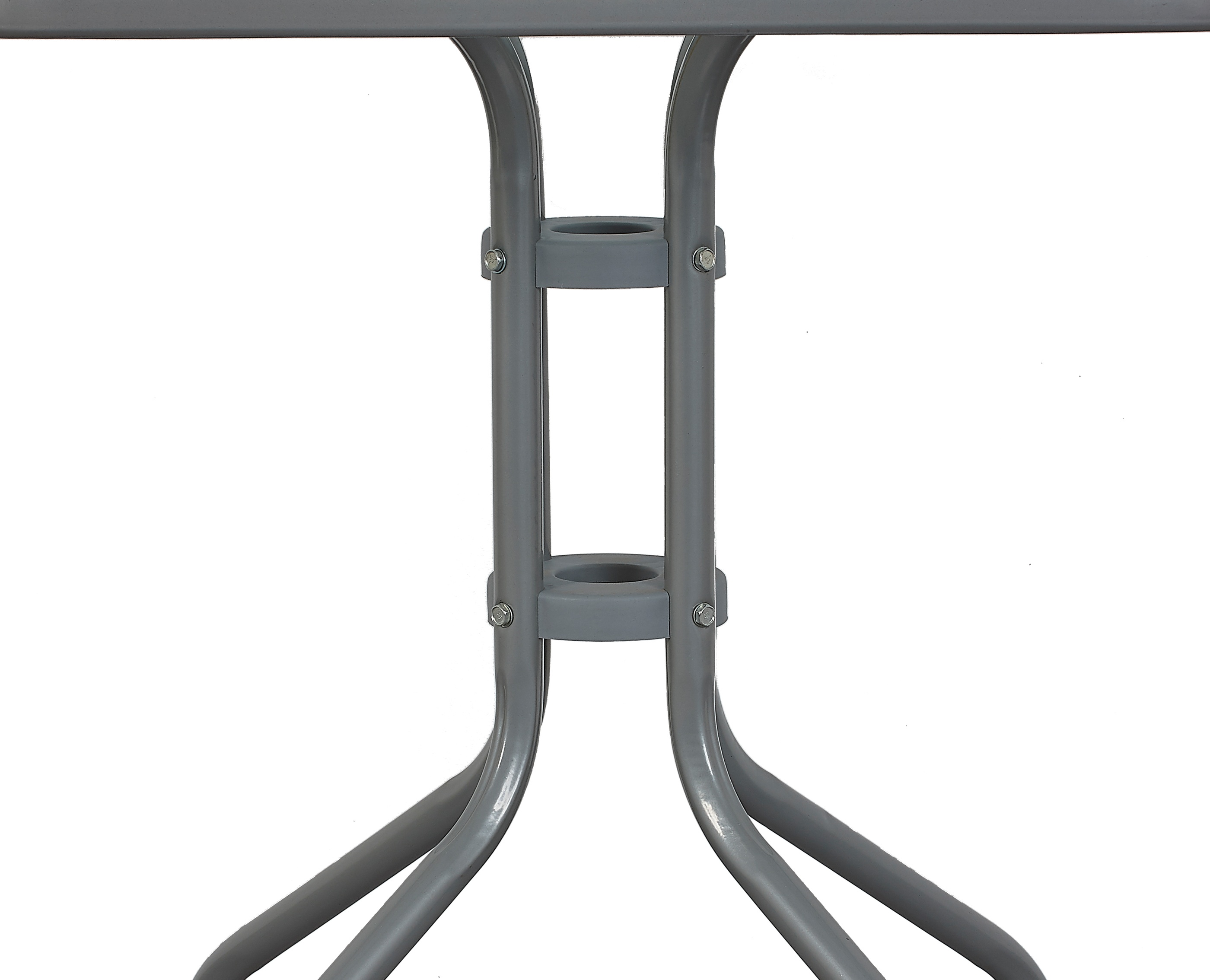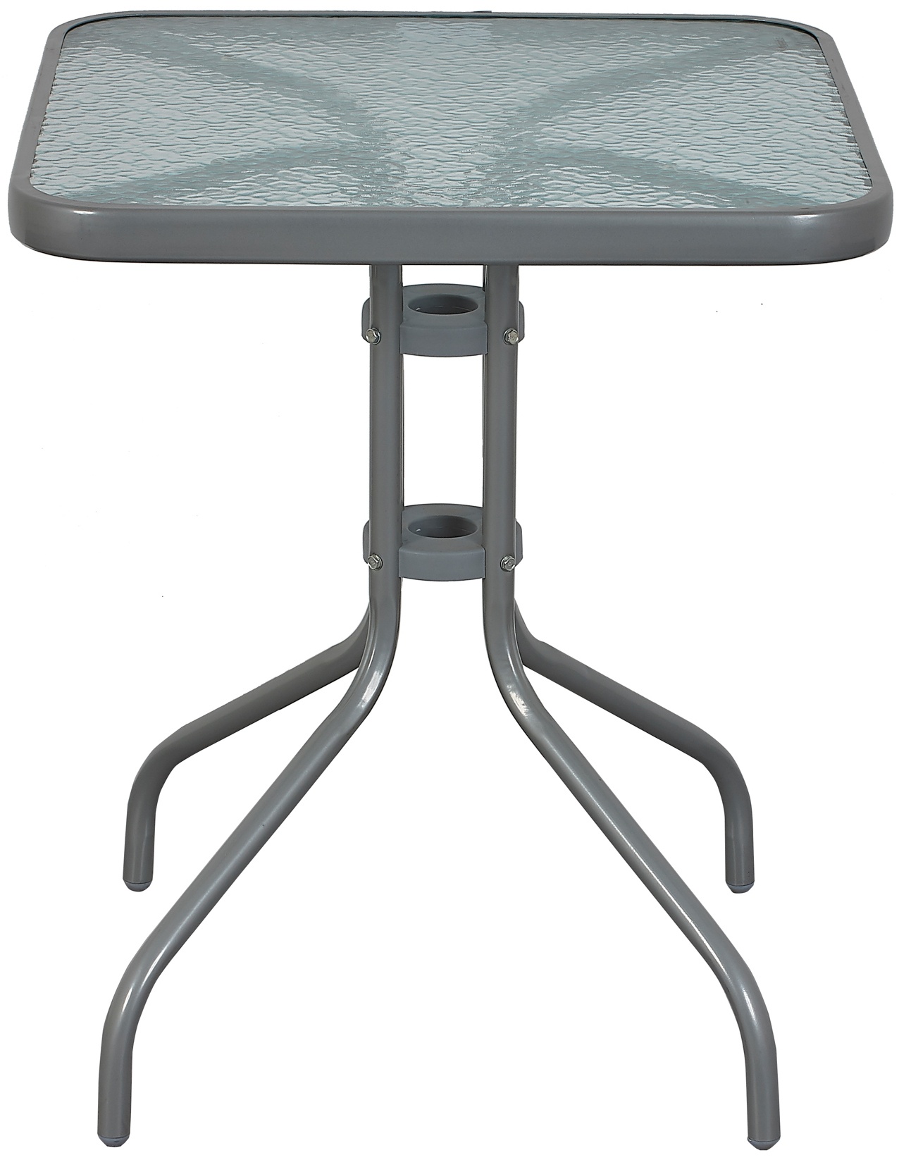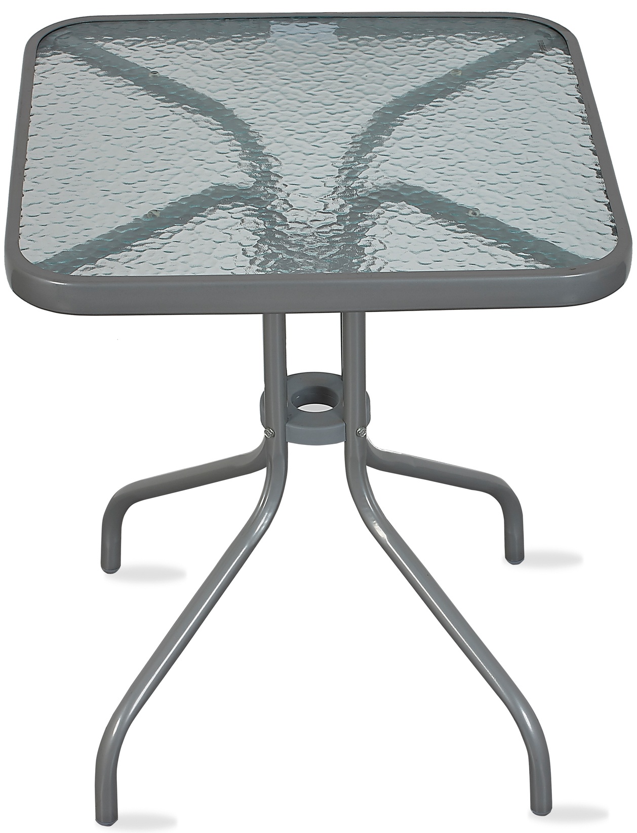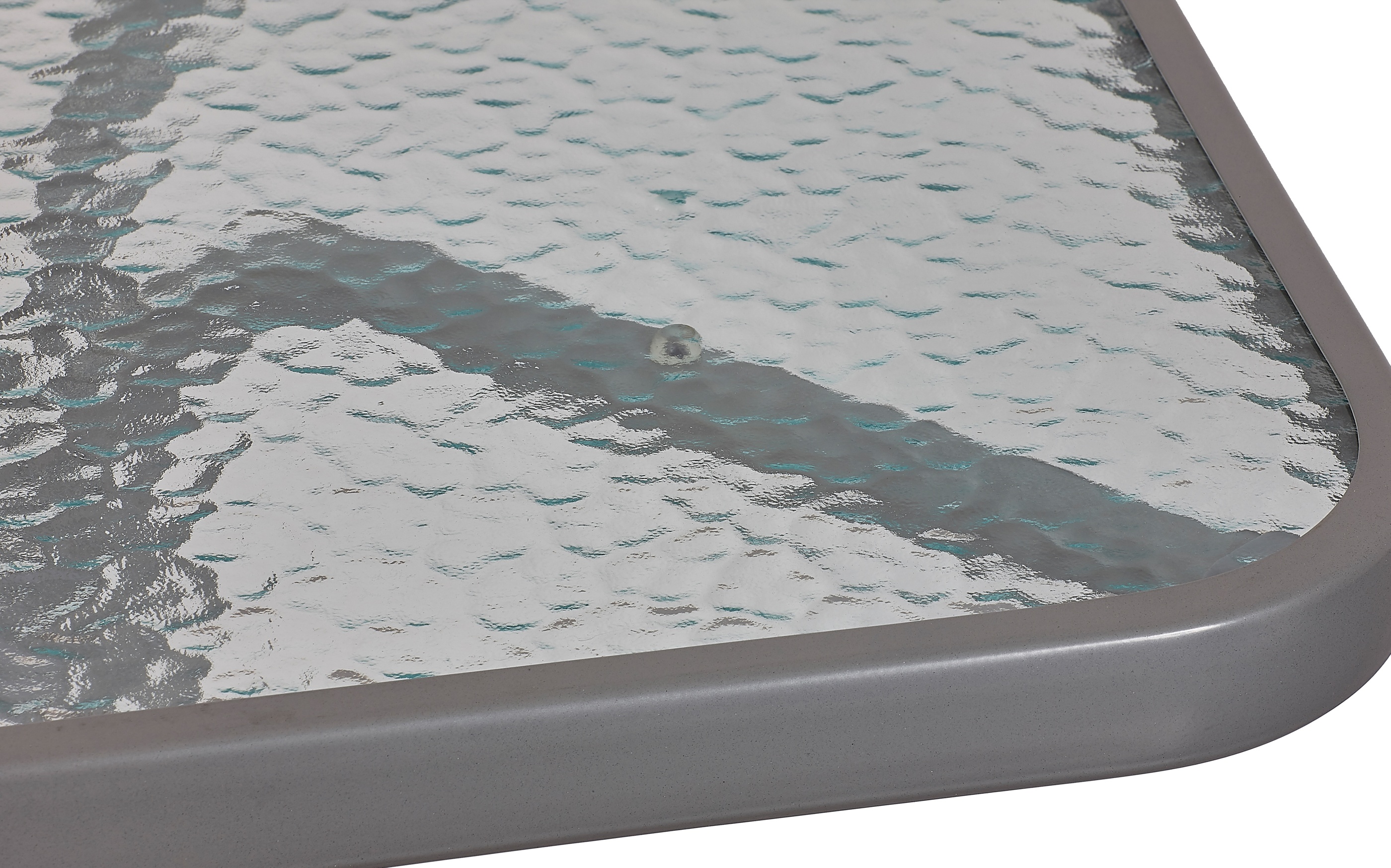 Masa de grădină BISTRO cu cadru metalic solid și blat din sticlă canelată într-un design modern, potrivită pentru grădini, terase, cafenele, foișoare, balcoane sau plaje.
