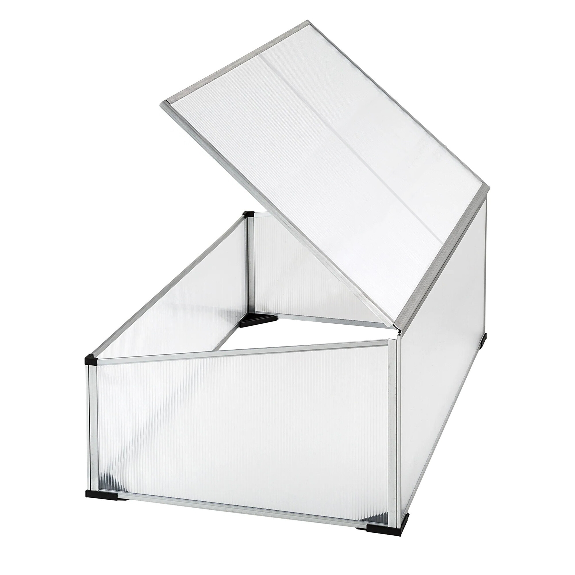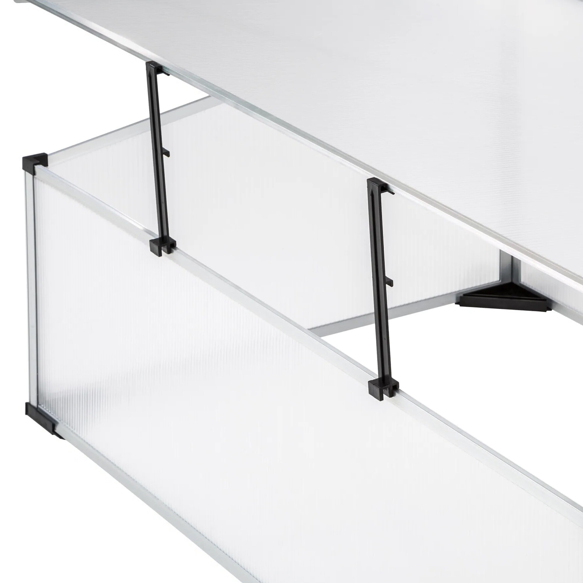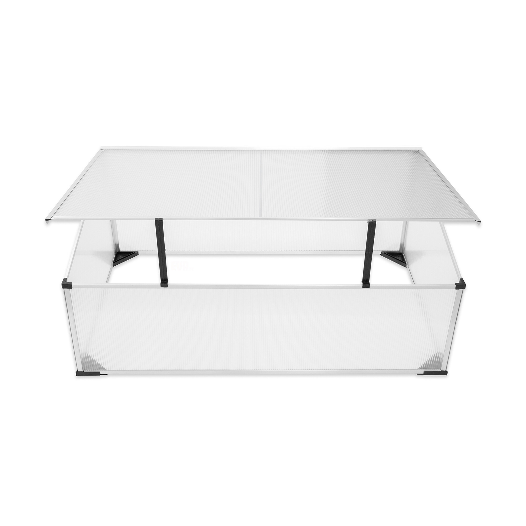 Seră de grădină cu proprietăți excelente de izolare termică, realizată din profile de aluminiu cu umplutură de policarbonat.Răsadnița este echipată cu un capac superior rabatabil pentru acces ușor și ventilație.