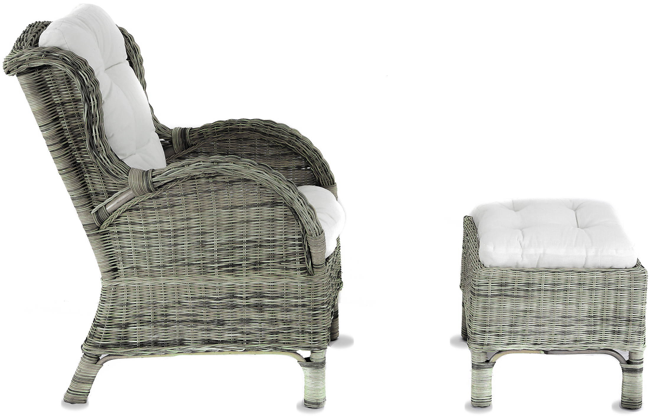 Colecția conține un fotoliu din ratan și un taburet din ratan.