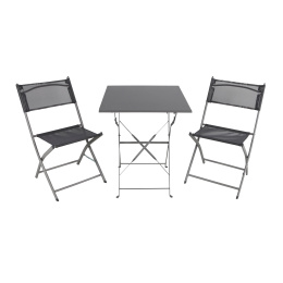 Setul include 2 fotolii și o masă de culoare gri.Masa de grădină are un cadru metalic și un mecanism pliabil al structurii, datorită căruia puteți desfășura sau plia masa foarte rapid.