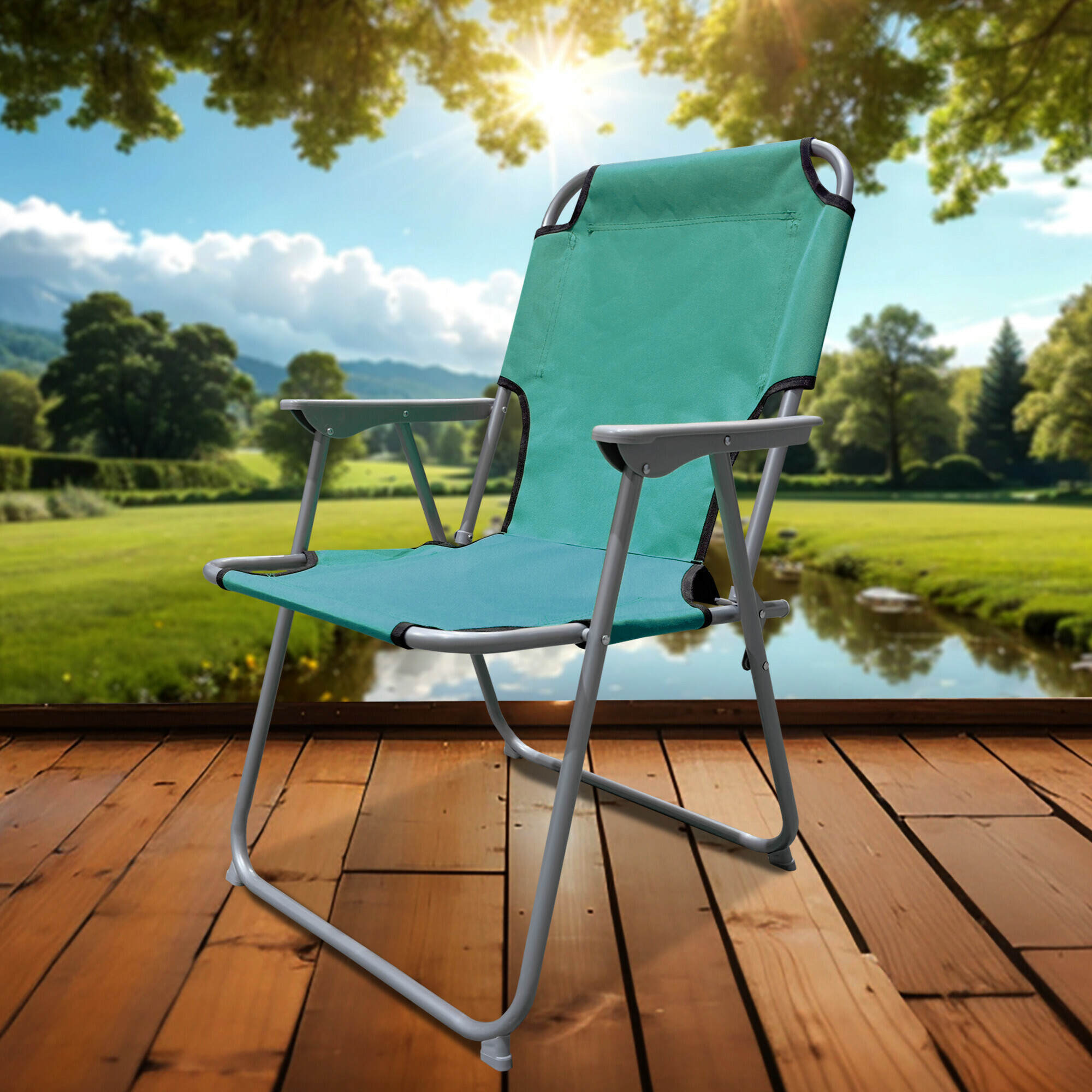 Scaun de grădină pliabil cu brațe confortabile, ideal pentru camping, dar cu siguranță își va găsi utilizarea și la pescari, modelatori, proprietari de cabane și case de vacanță.