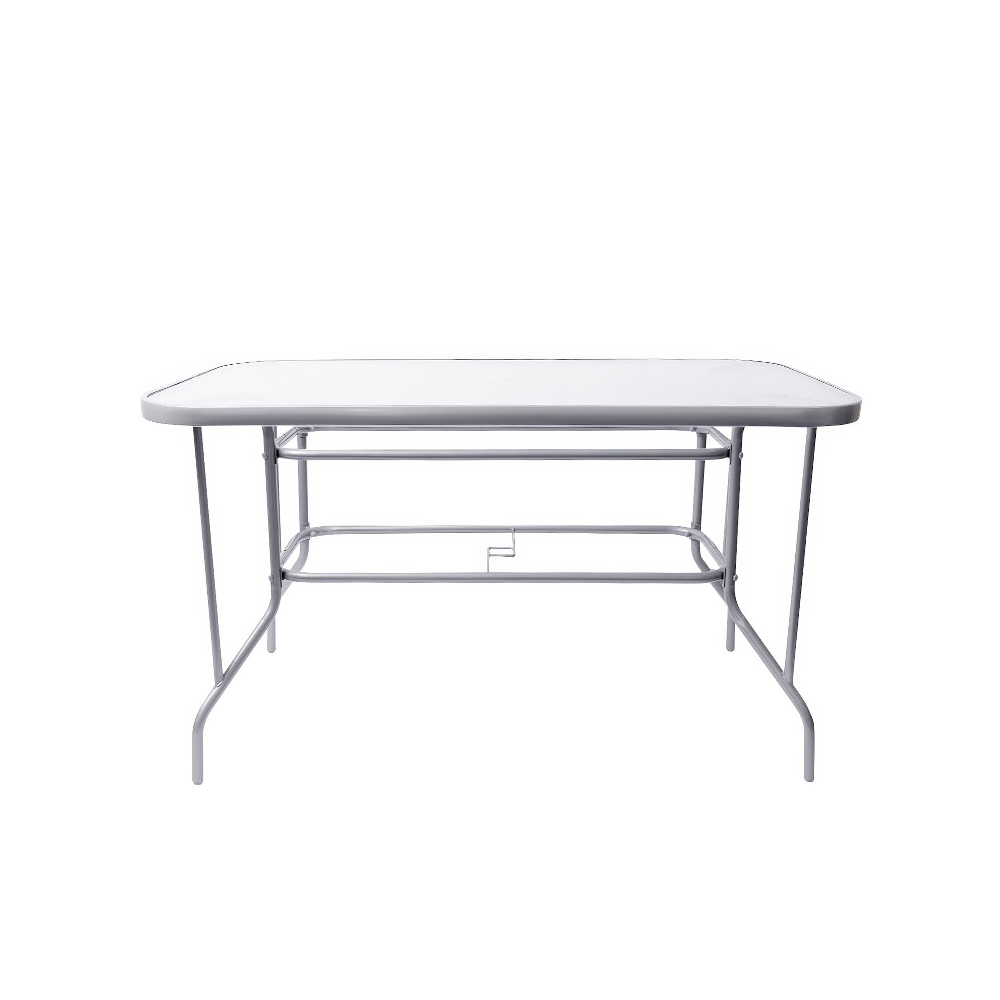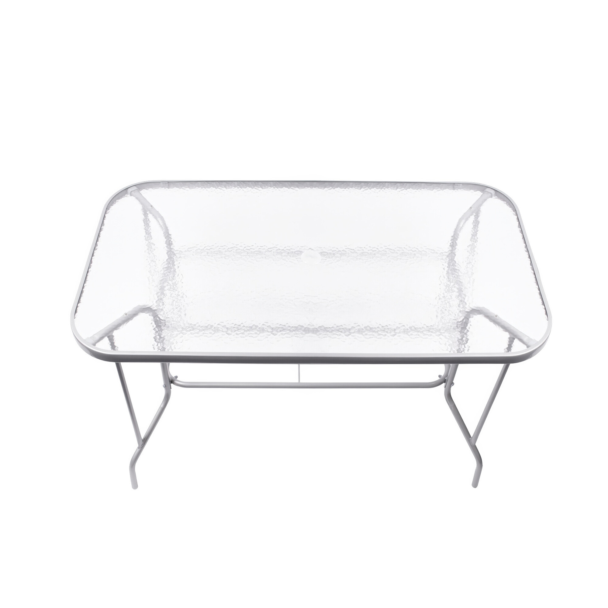 Masa de grădină MILANO cu cadru metalic solid și blat de sticlă texturată într-un design modern, potrivită pentru grădini, terase, cafenele, foișoare, balcoane sau plaje.