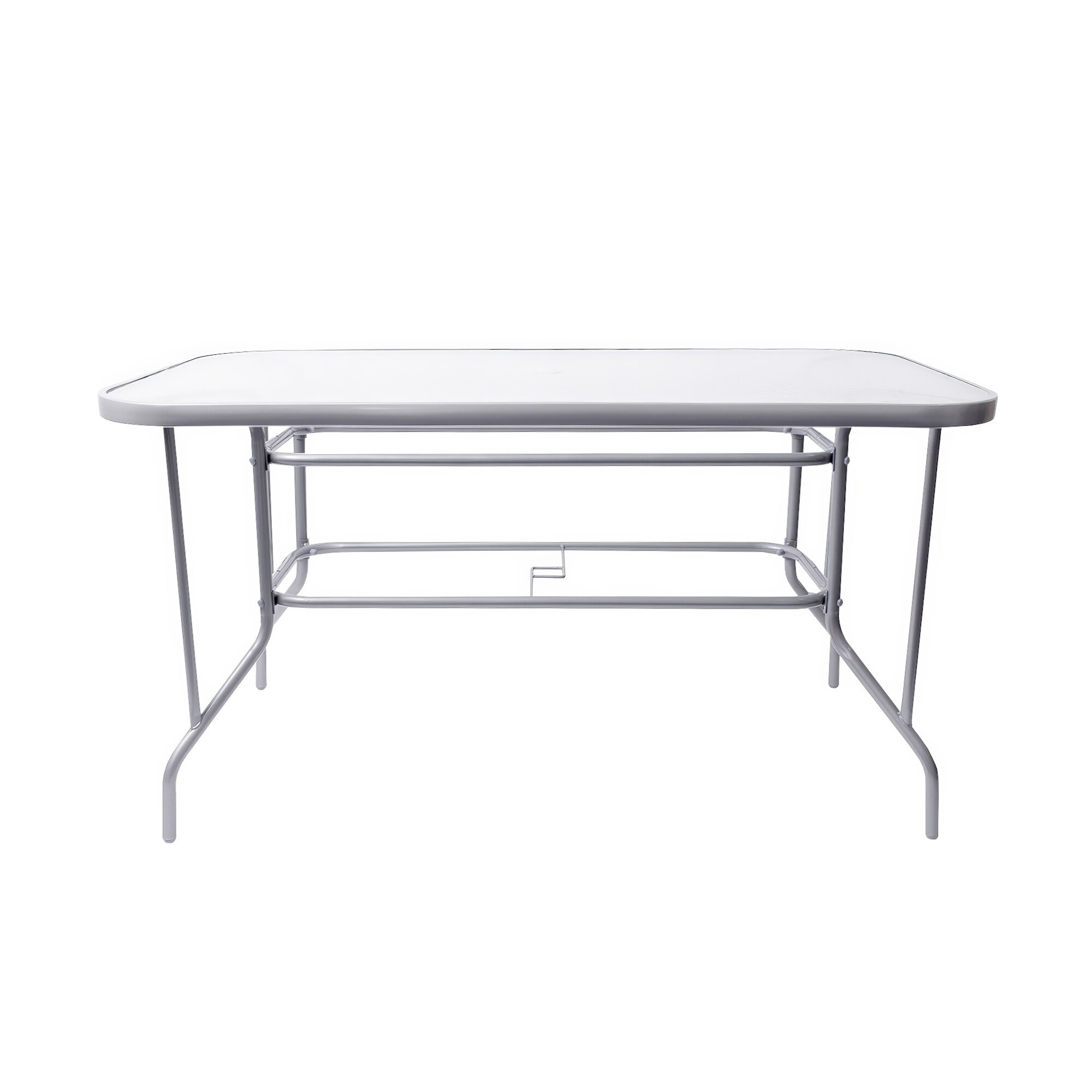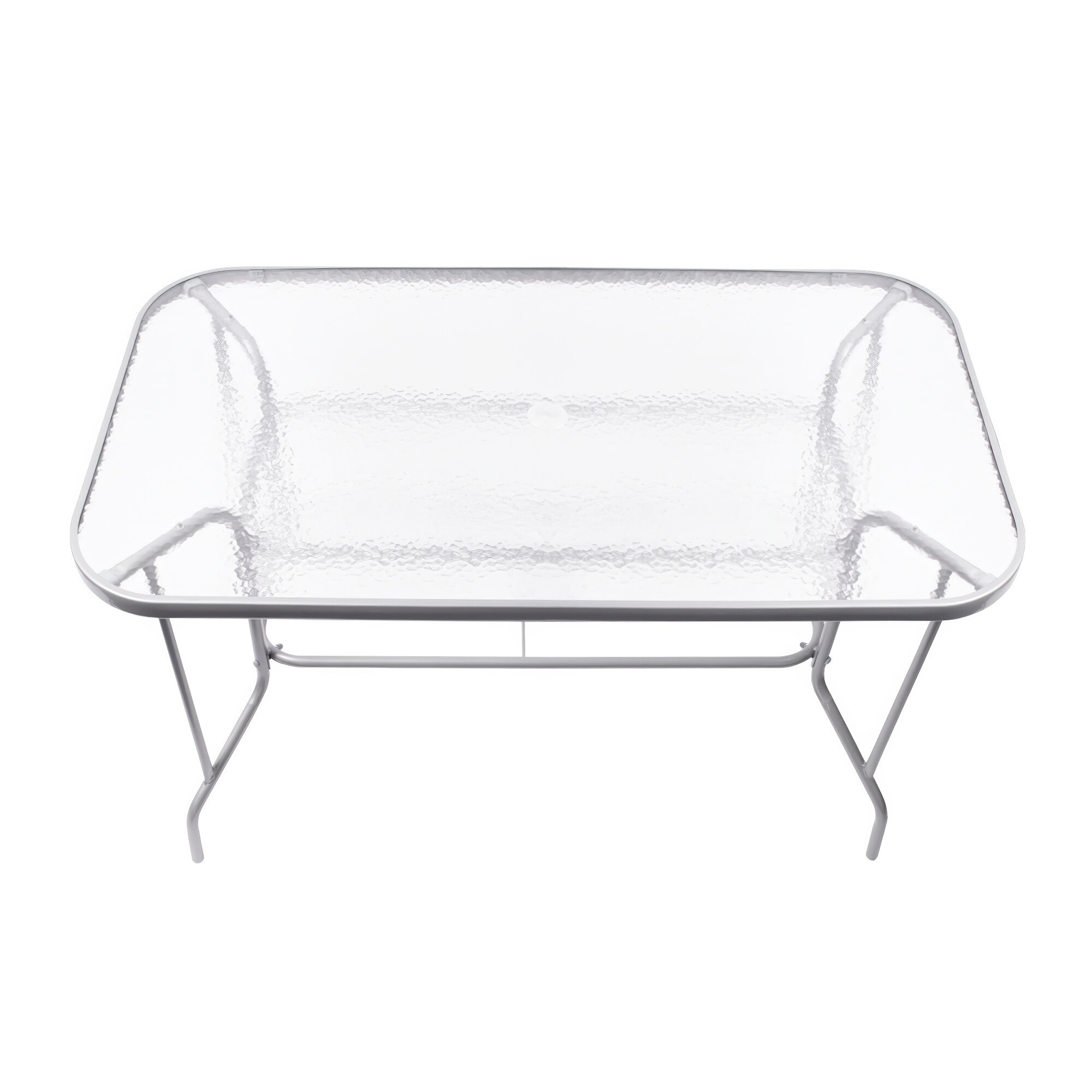 Masa de grădină MILANO cu cadru metalic solid și blat de sticlă texturată într-un design modern, potrivită pentru grădini, terase, cafenele, foișoare, balcoane sau plaje.