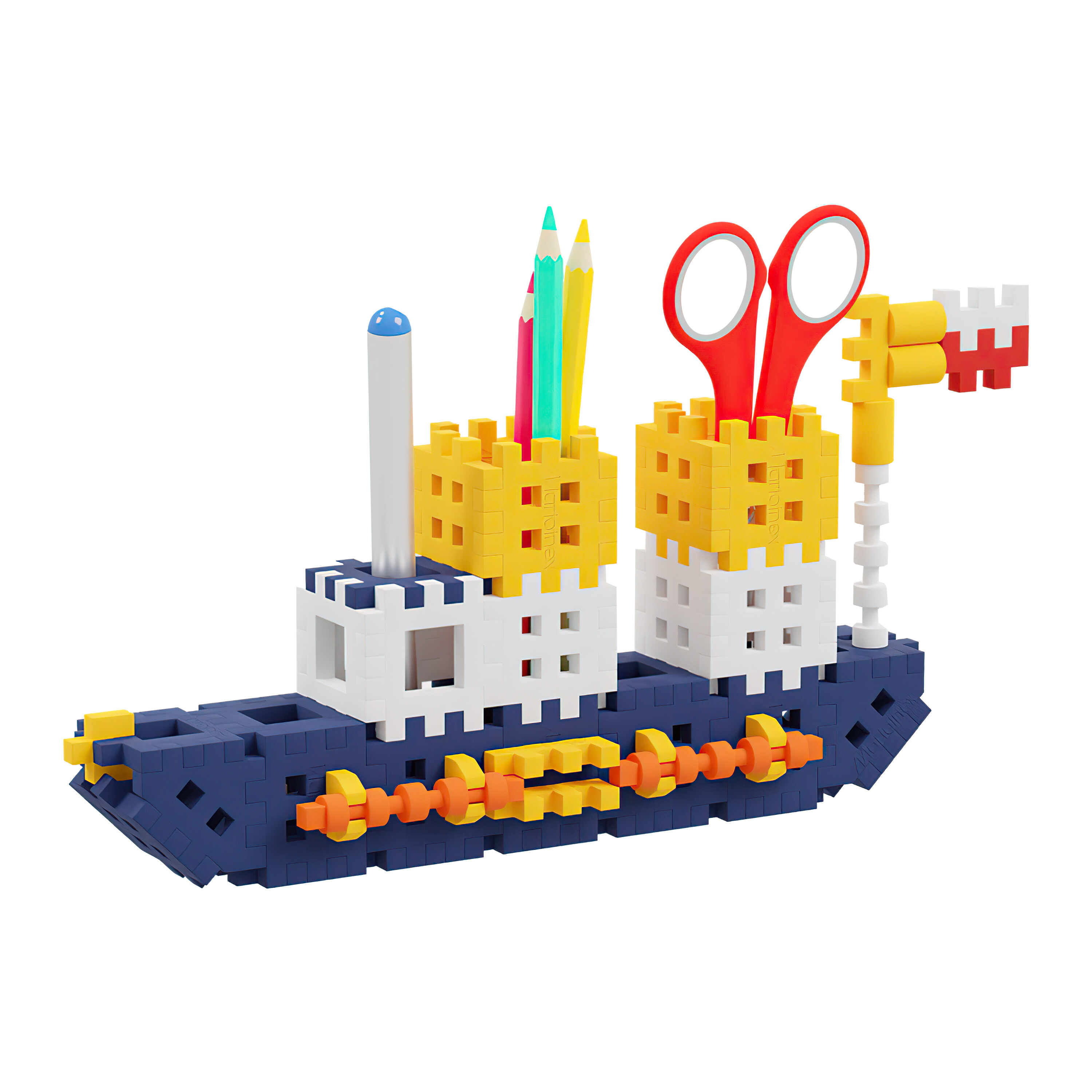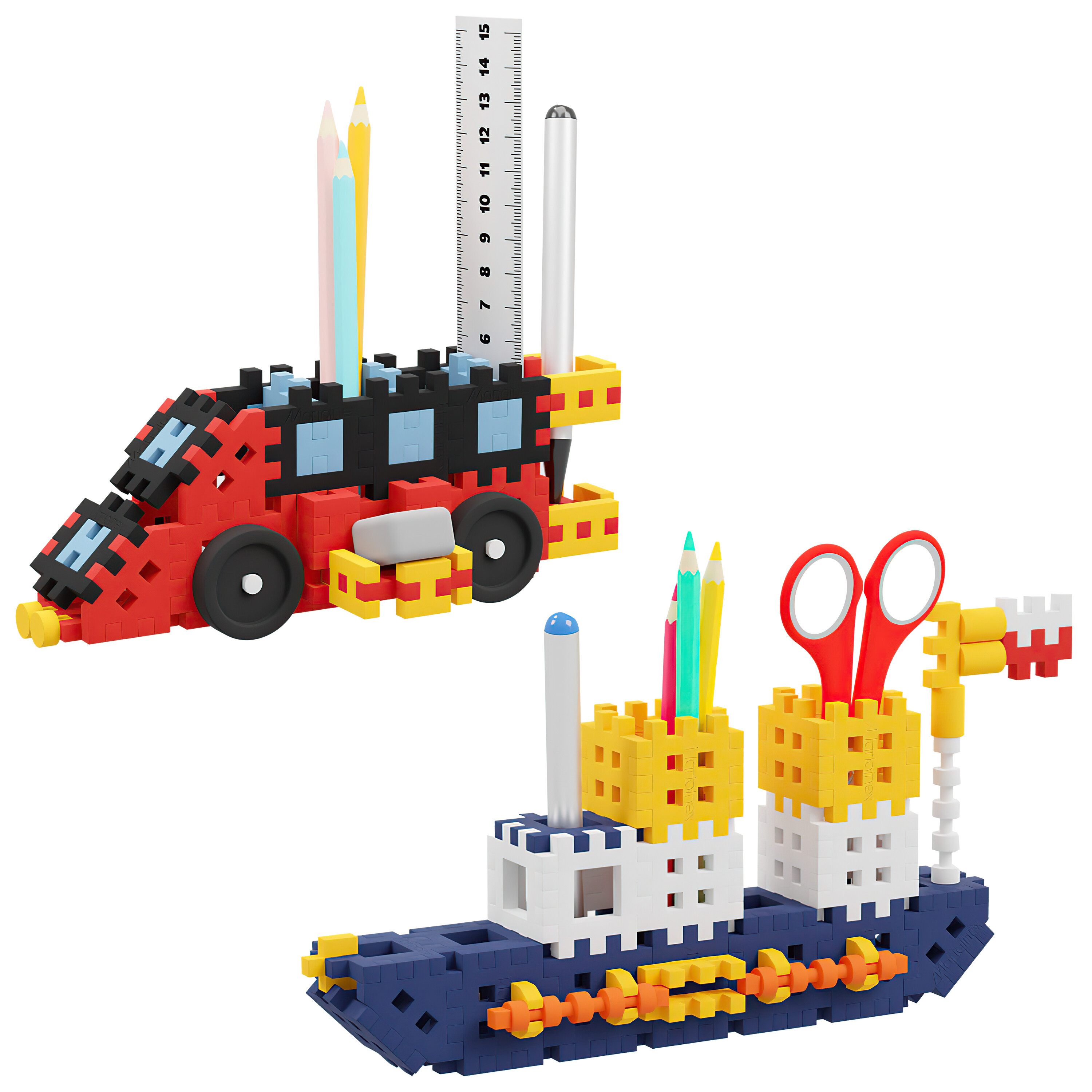 Construiți-vă propriile organizatoare pentru rechizite de scris și de artă. Veți obține astfel o decorațiune creativă și foarte practică pentru birou. Setul este compus din 140 de piese, din care puteți crea un organizator în formă de mașină și barcă, care va conține toate rechizitele școlare necesare.