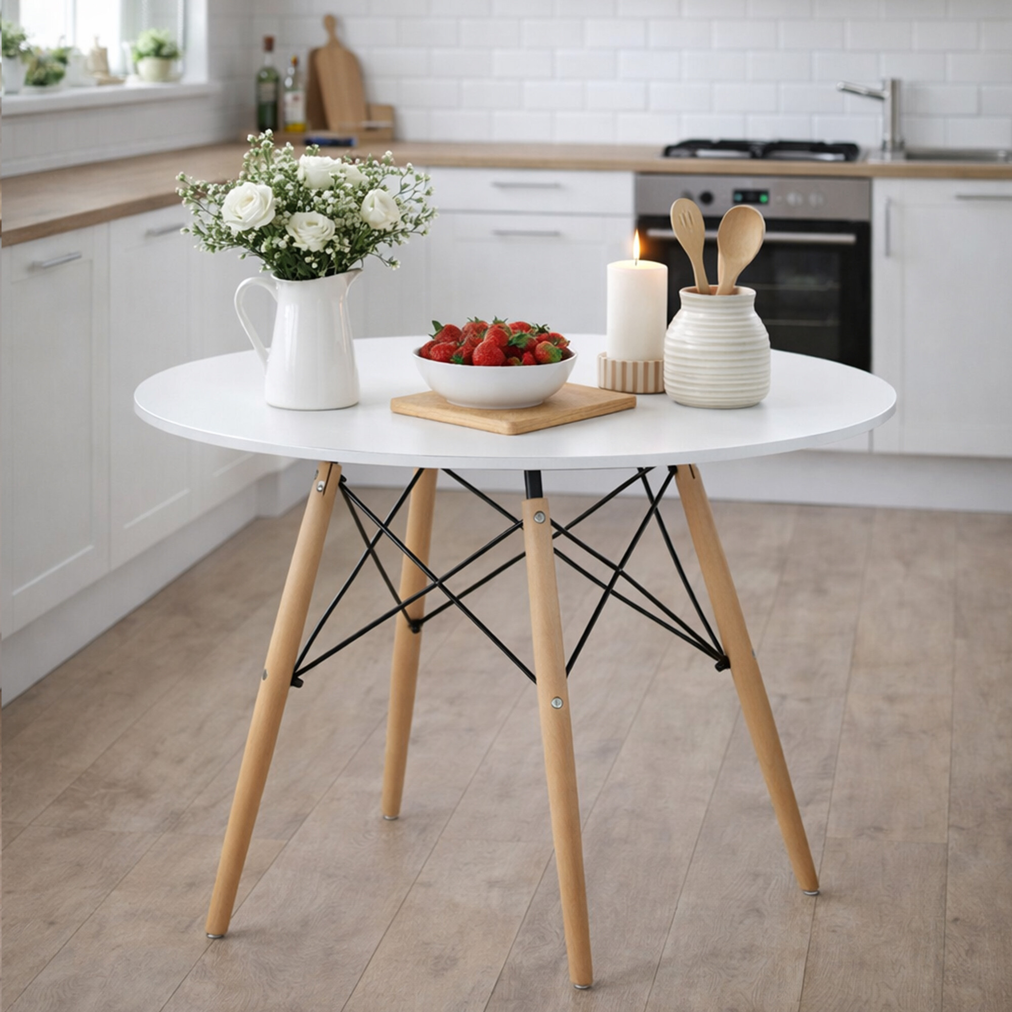 Masa de dining în stil scandinav se potrivește ușor cu interiorul bucătăriei sau al sălii de mese.