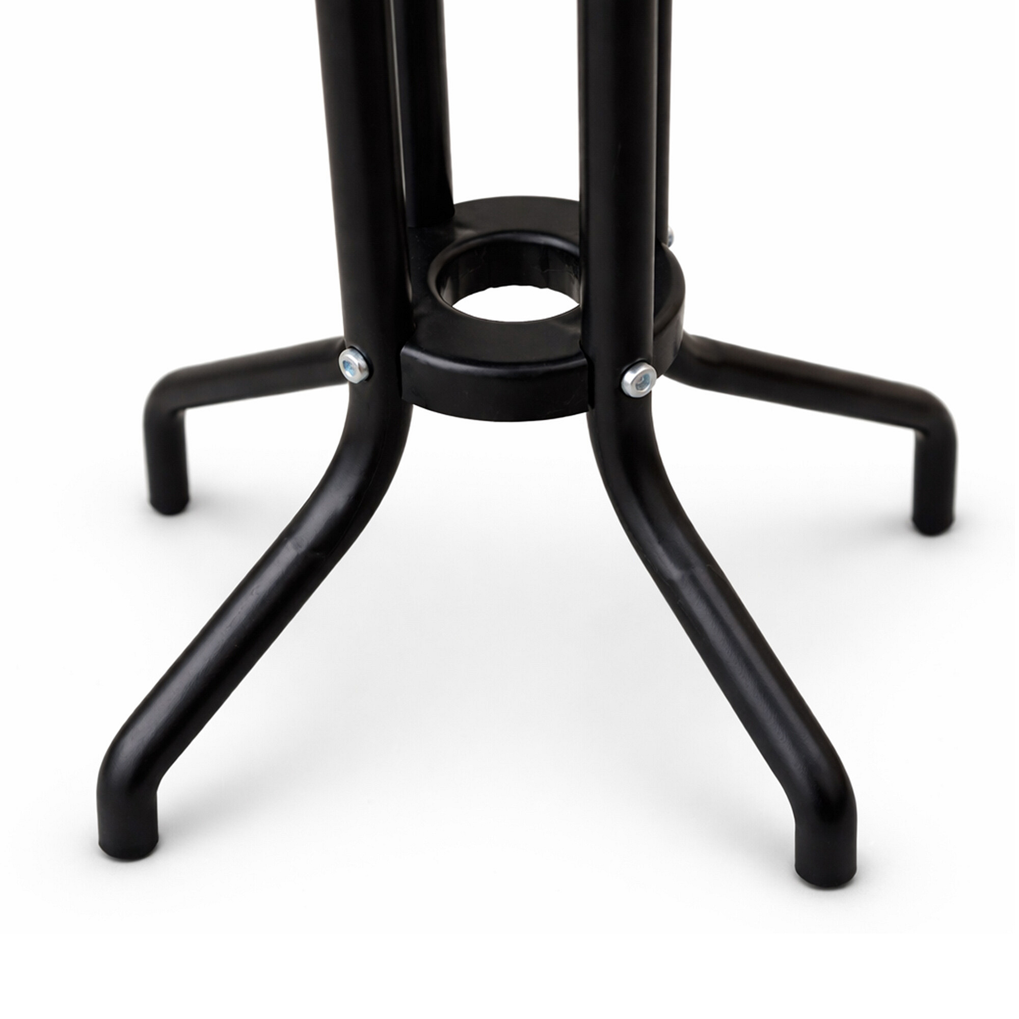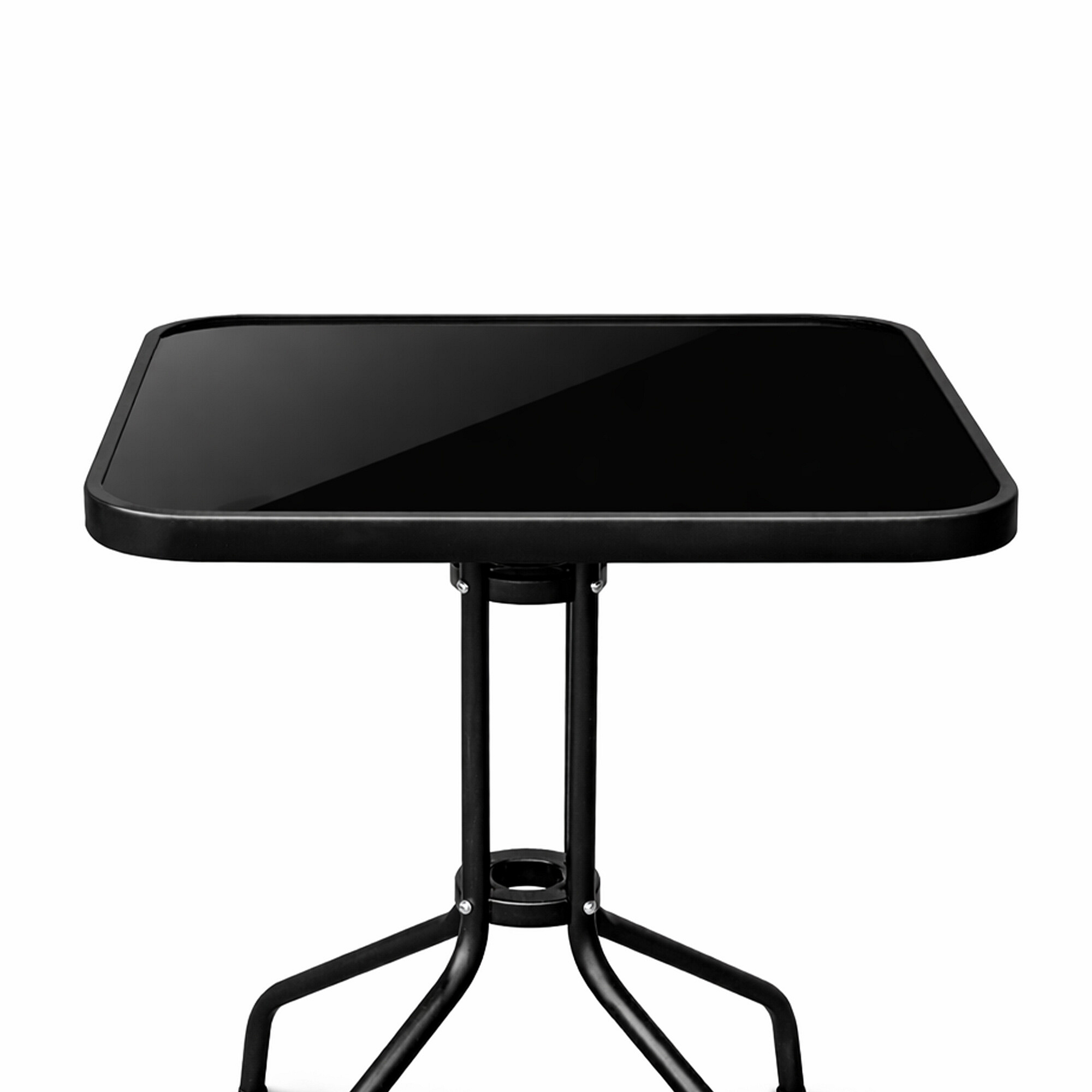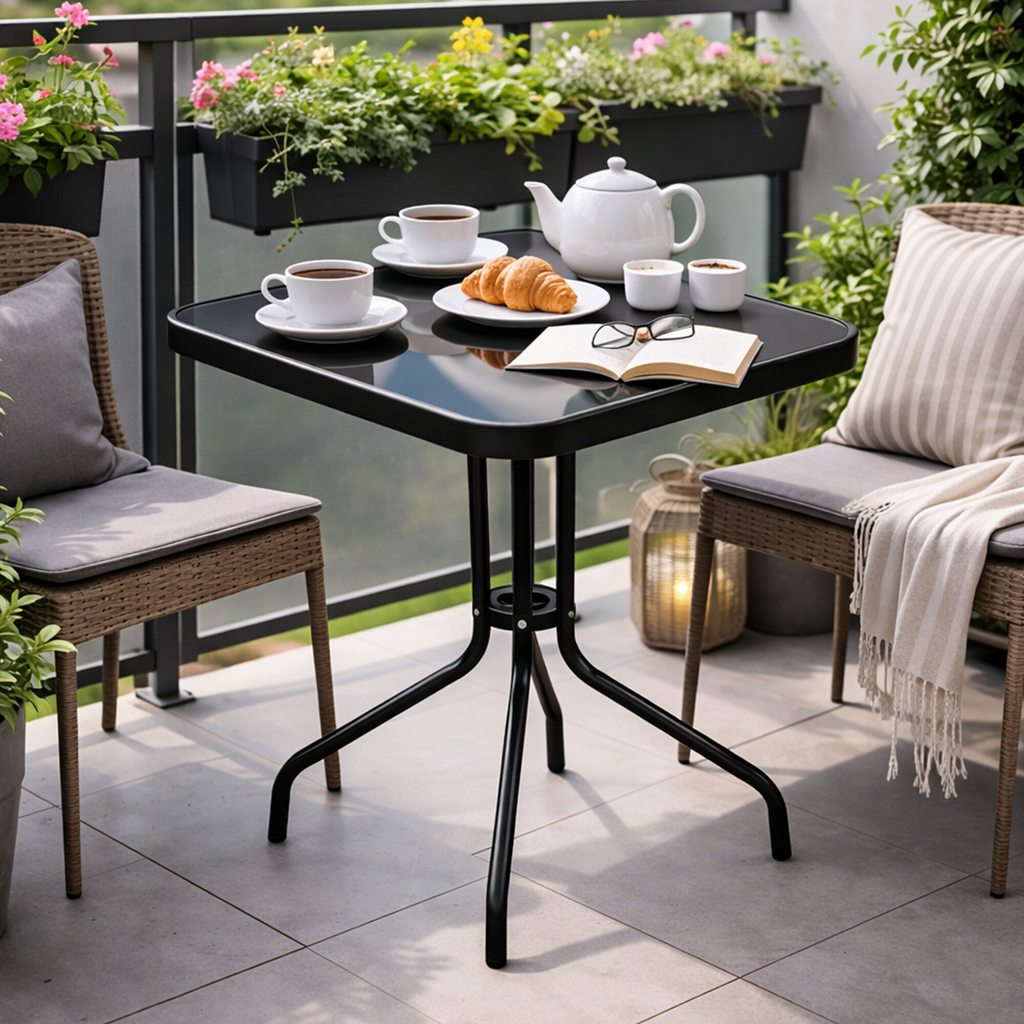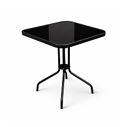 Masa de grădină BISTRO cu cadru metalic solid și blat de sticlă într-un design modern, potrivită pentru grădini, terase, cafenele, foișoare, balcoane sau plaje.