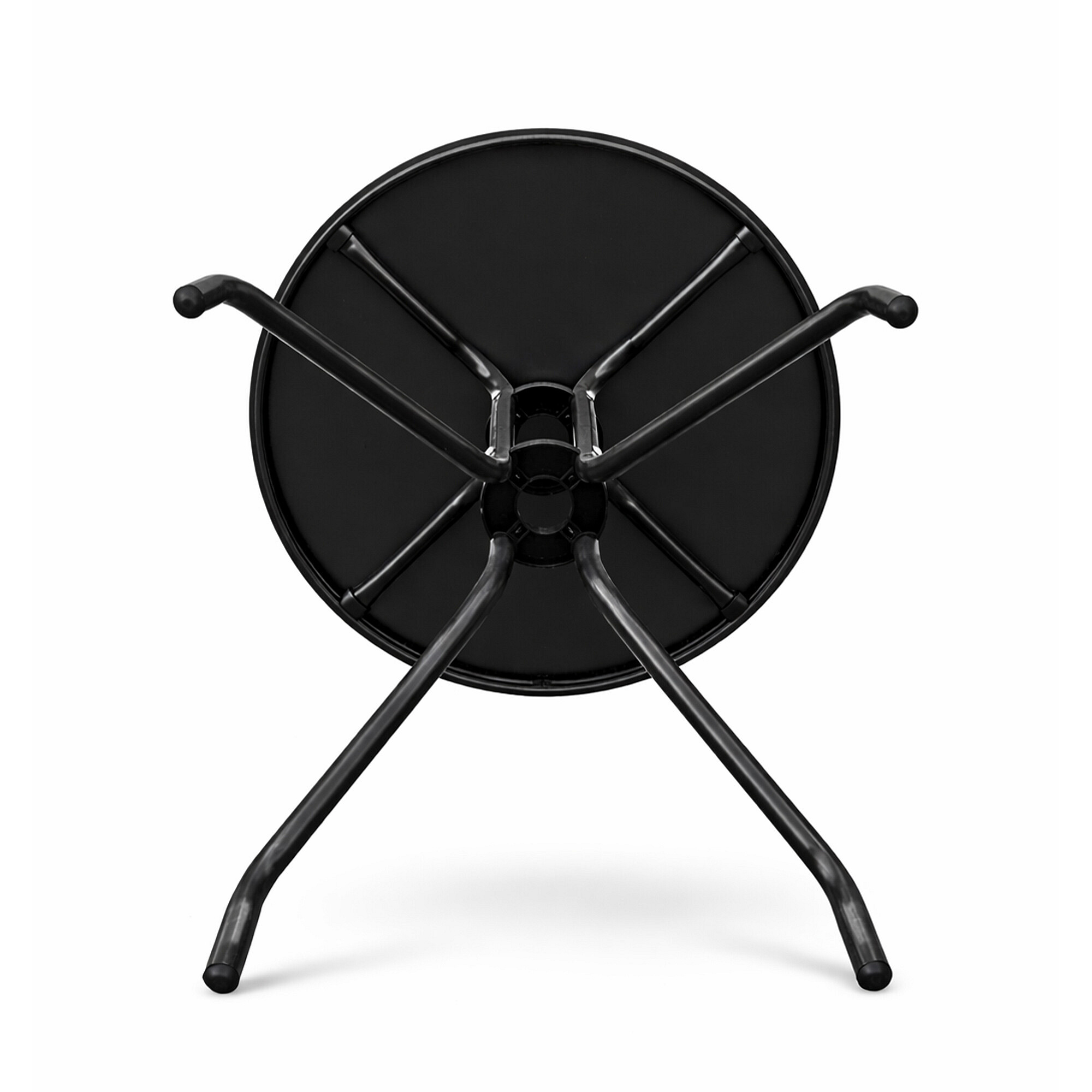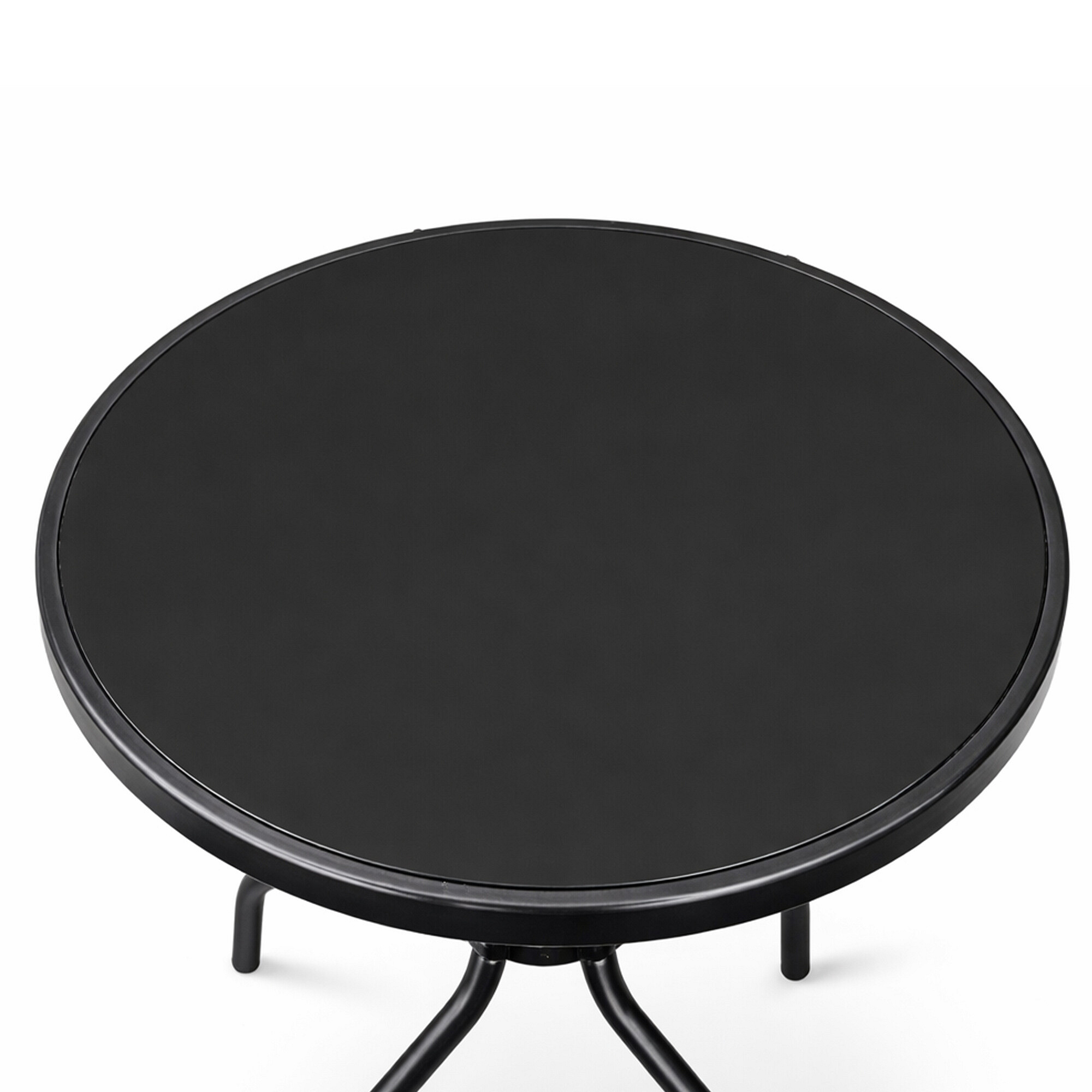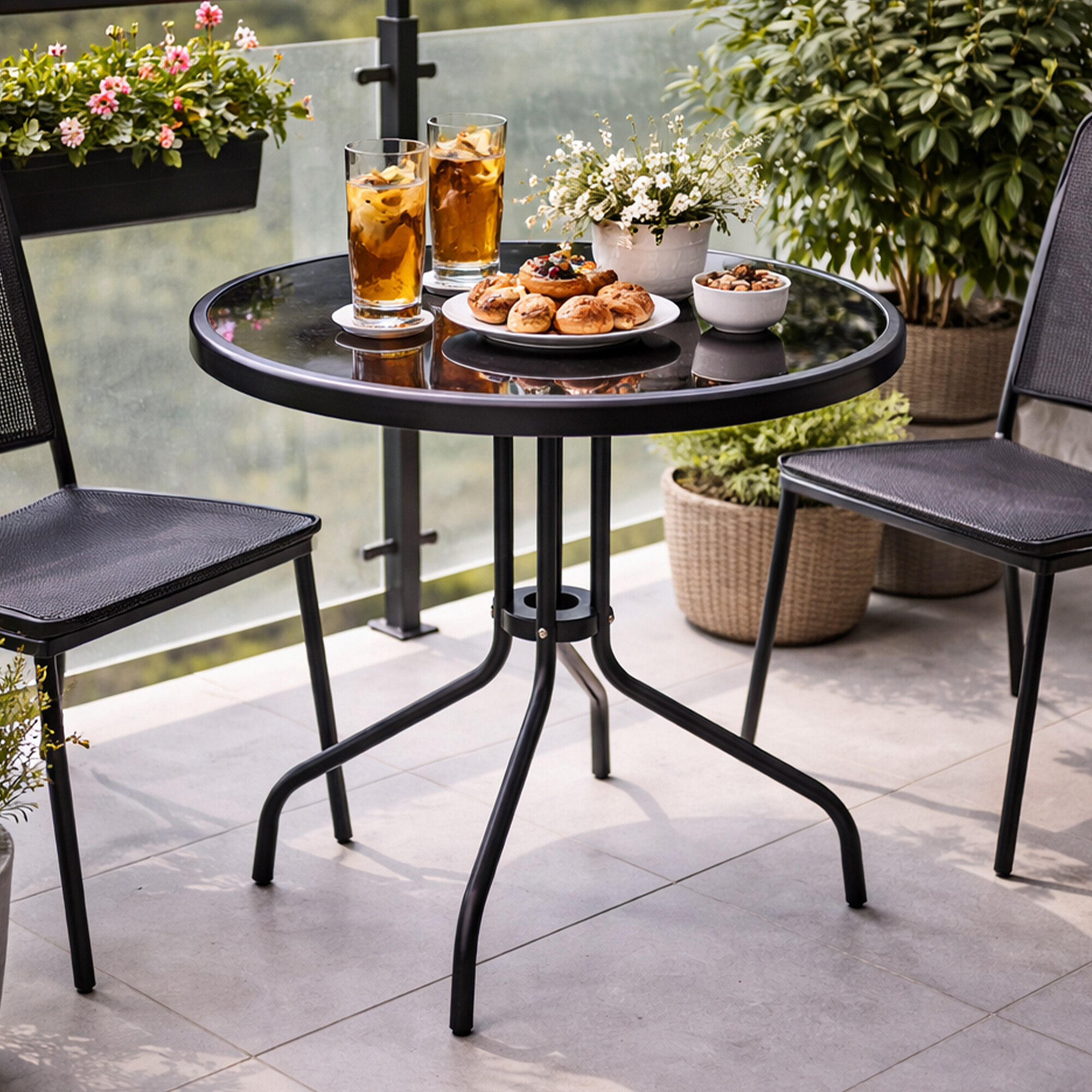 Masa de grădină rotundă cu cadru metalic solid și blat de sticlă, potrivită pentru grădini, terase, cafenele, foișoare, balcoane.