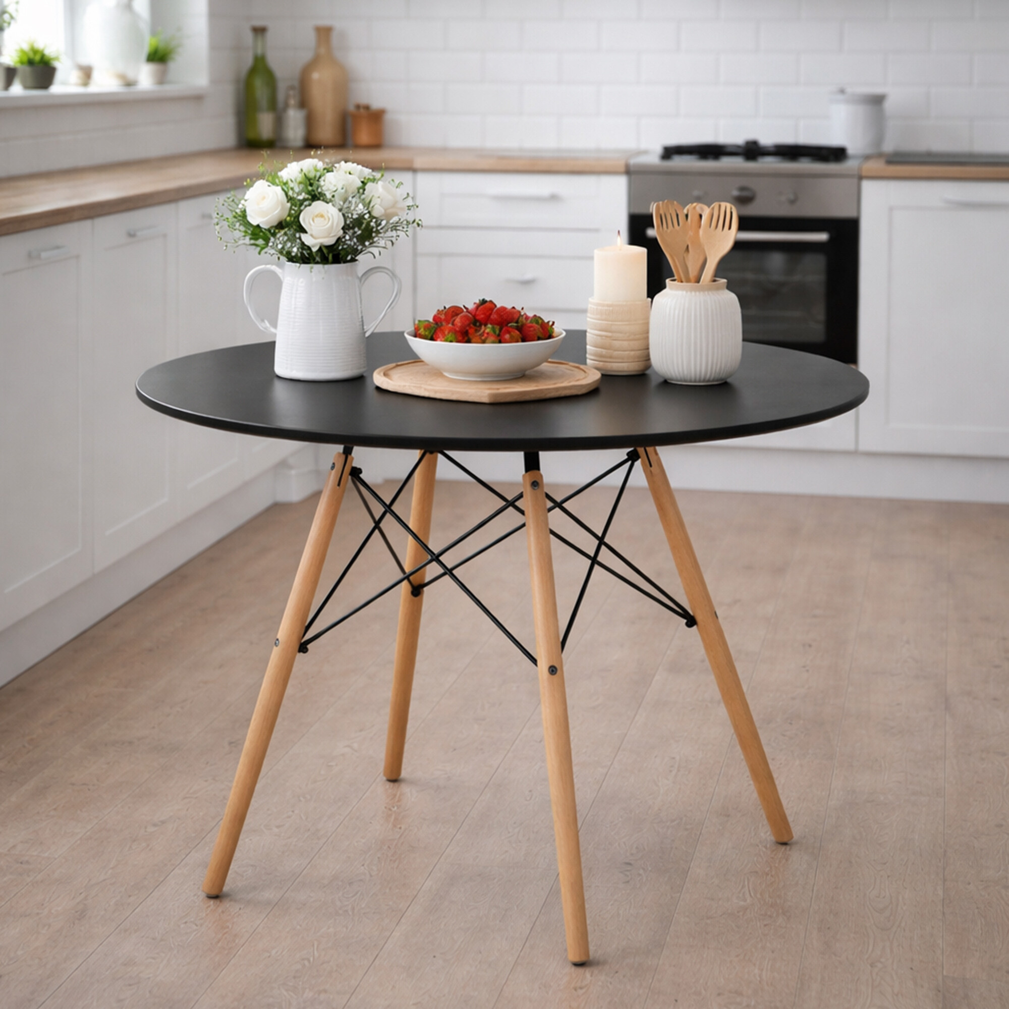 Masa de dining în stil scandinav se potrivește ușor cu interiorul bucătăriei sau al sălii de mese.