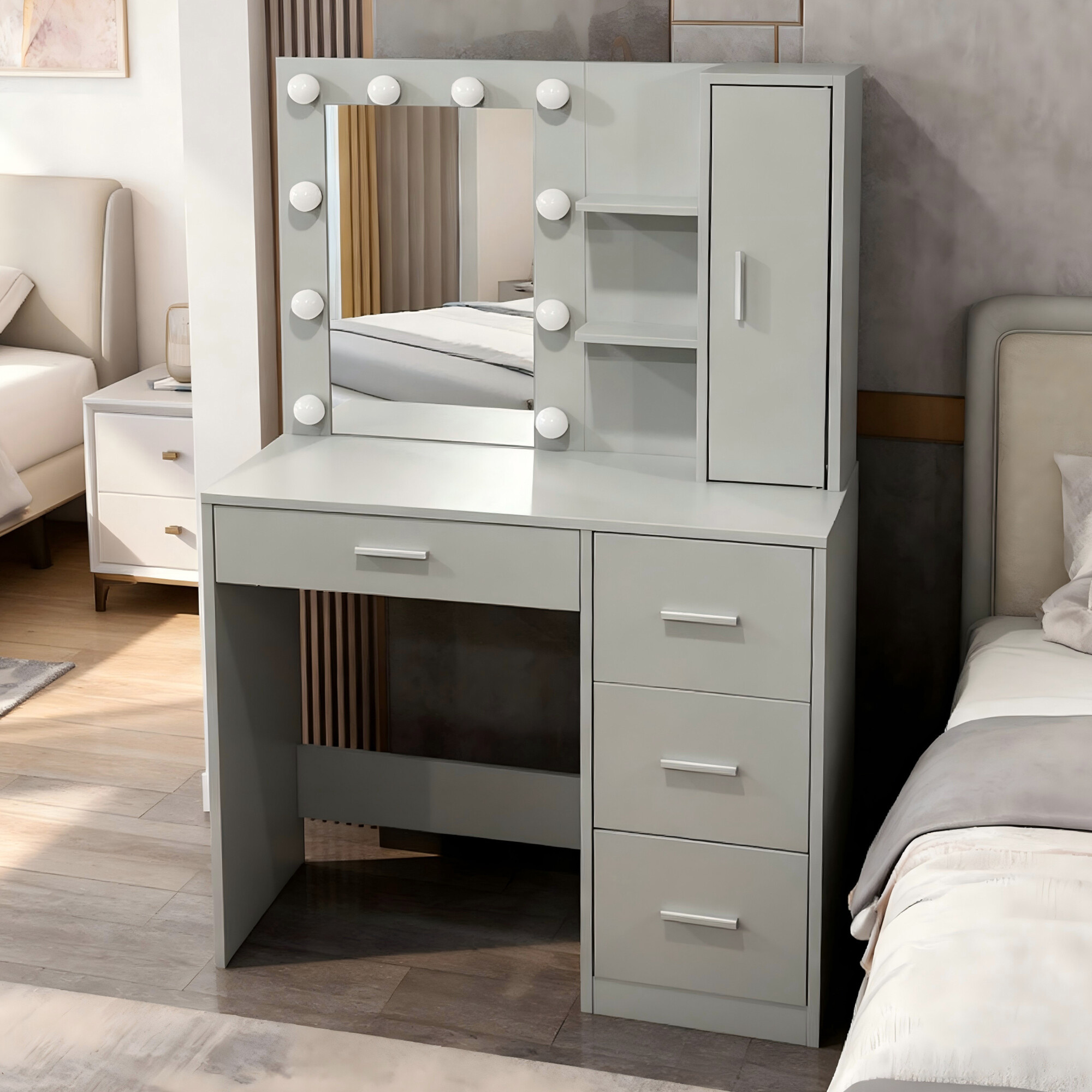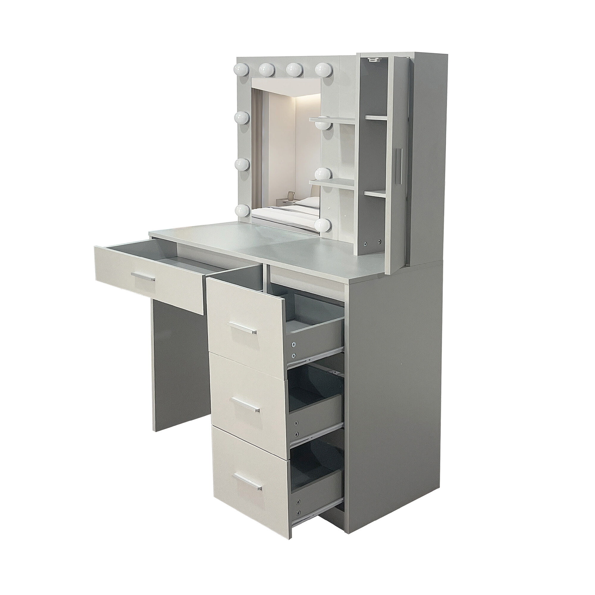 Lângă oglindă se află două rafturi deschise practice și un sertar, pe care vă puteți expune produsele cosmetice preferate, parfumurile sau decorațiunile. Cele patru sertare spațioase oferă suficient spațiu de depozitare pentru machiaj, bijuterii și alte accesorii, pe care astfel le veți avea întotdeauna la îndemână.