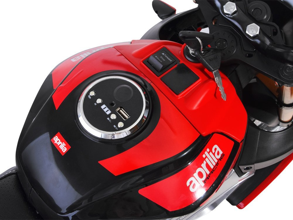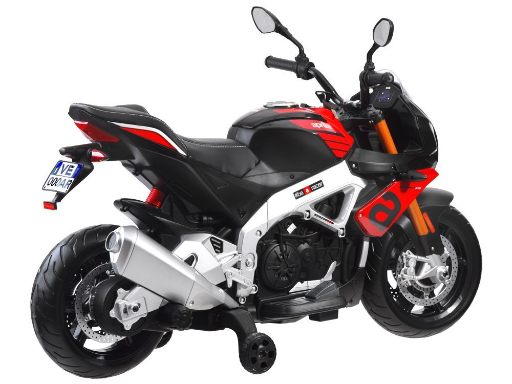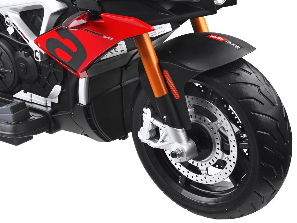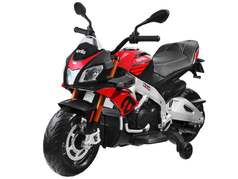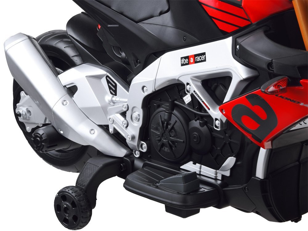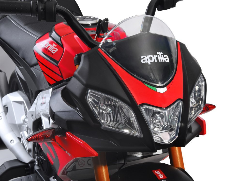 Motocicleta de curse Aprilia Tuono V4 este un vehicul cu baterii licențiat destinat micilor fani ai acestor vehicule, care a fost fabricat într-un mod foarte impresionant și realist, cu accent pe cele mai fine detalii.Motocicleta este destinată copiilor de la 3 ani. Designul excelent al motocicletei permite deplasarea pe alei drepte, pe trotuar și chiar pe teren plat.