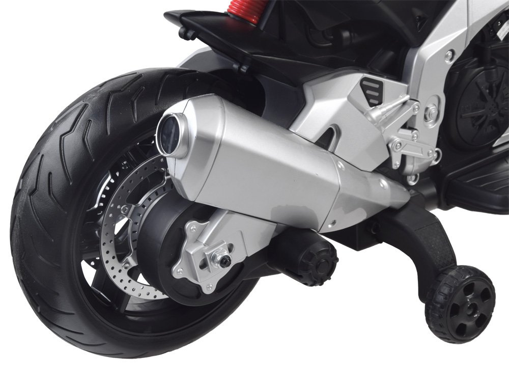Motocicleta se pornește cu cheia. Are un scaun confortabil tapițat cu piele ecologică, lumini strălucitoare și roți laterale pentru echilibru și o călătorie confortabilă.Cursa va aduce cu siguranță multă distracție fiecărui mic șofer.