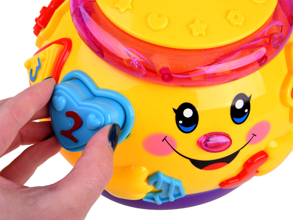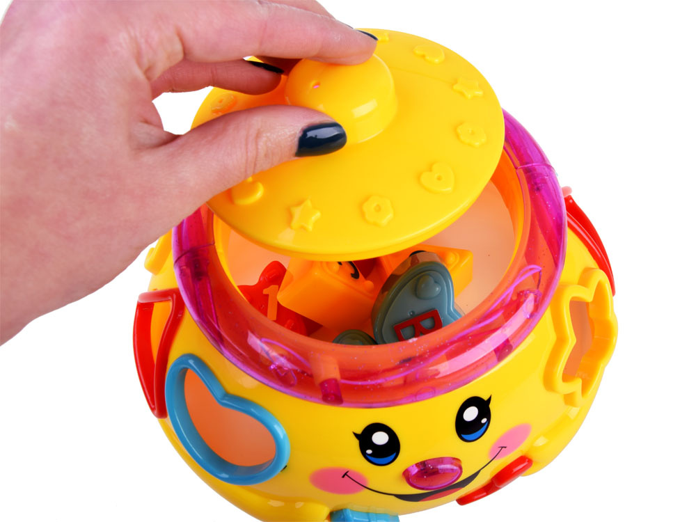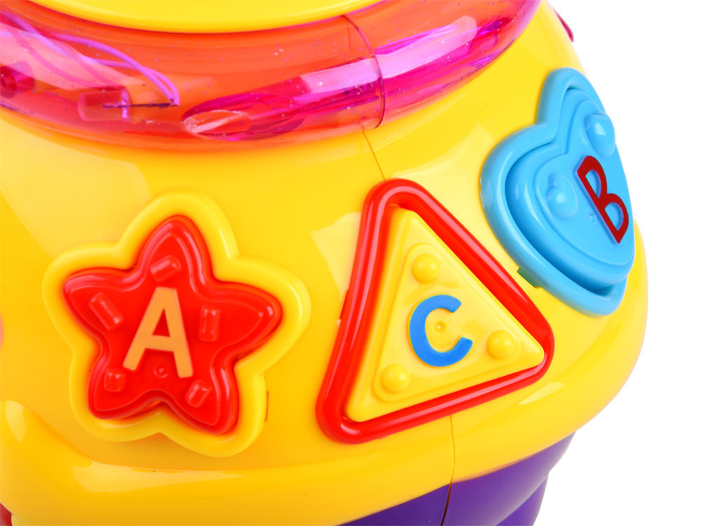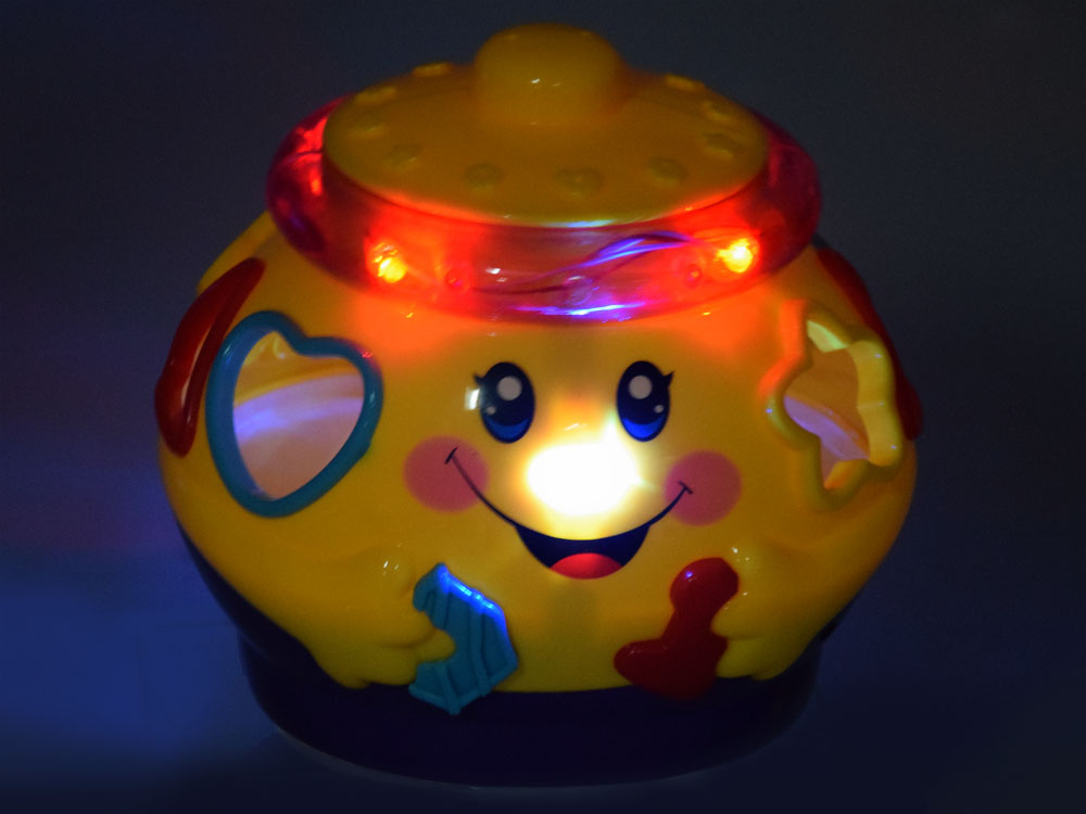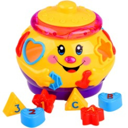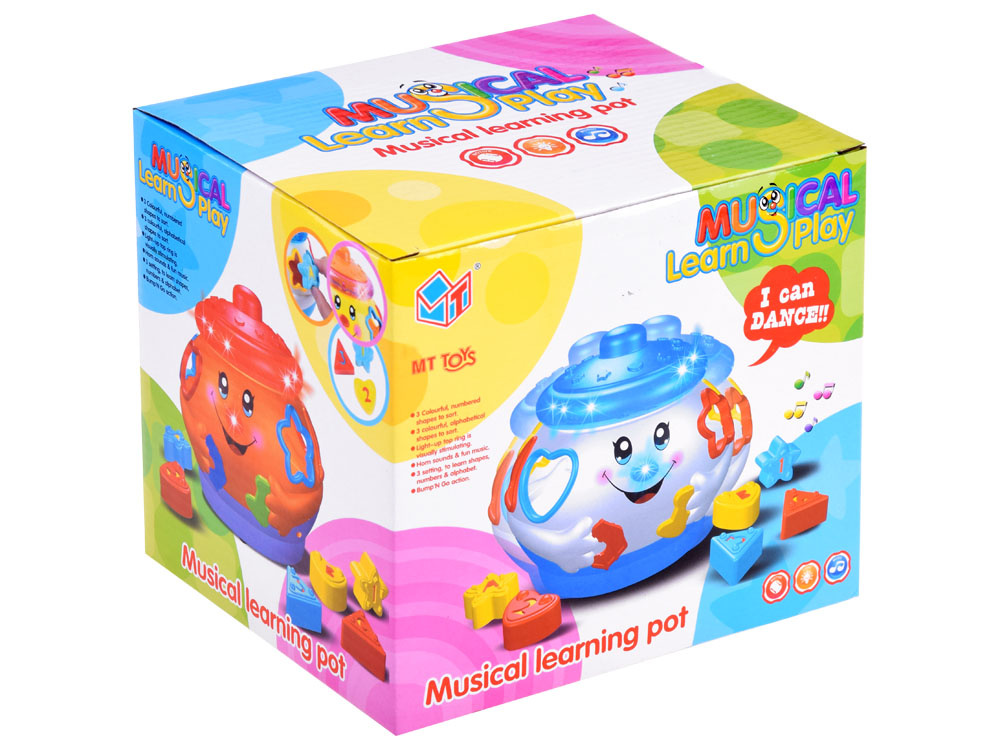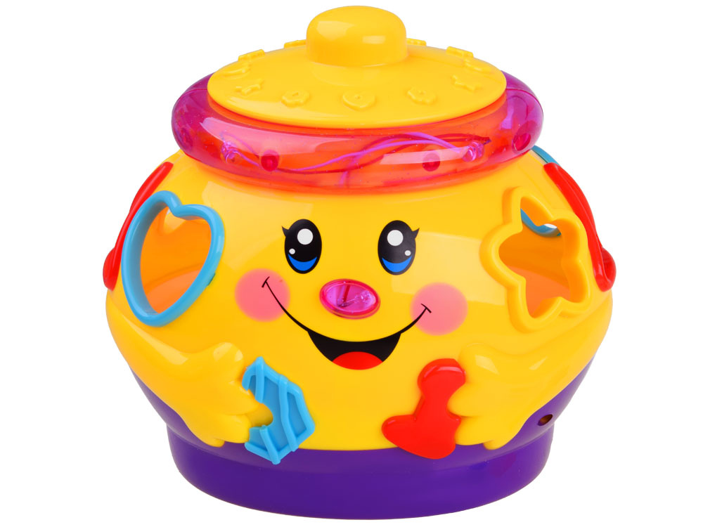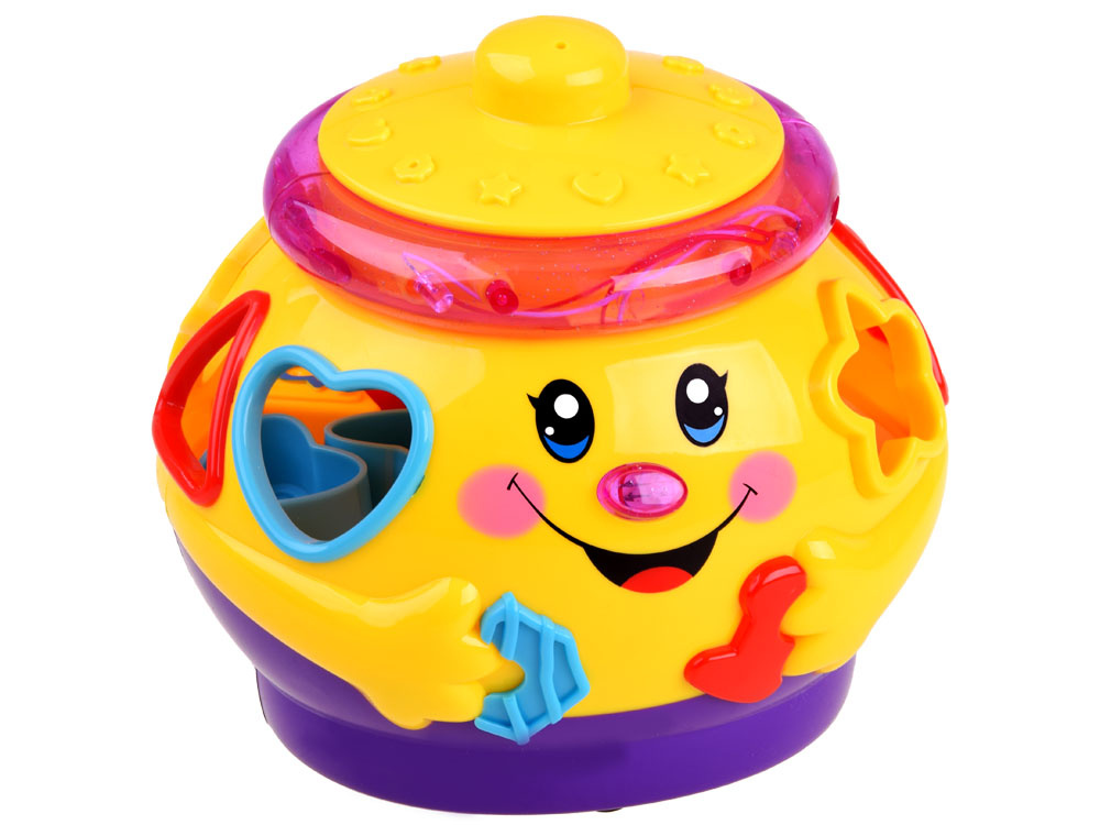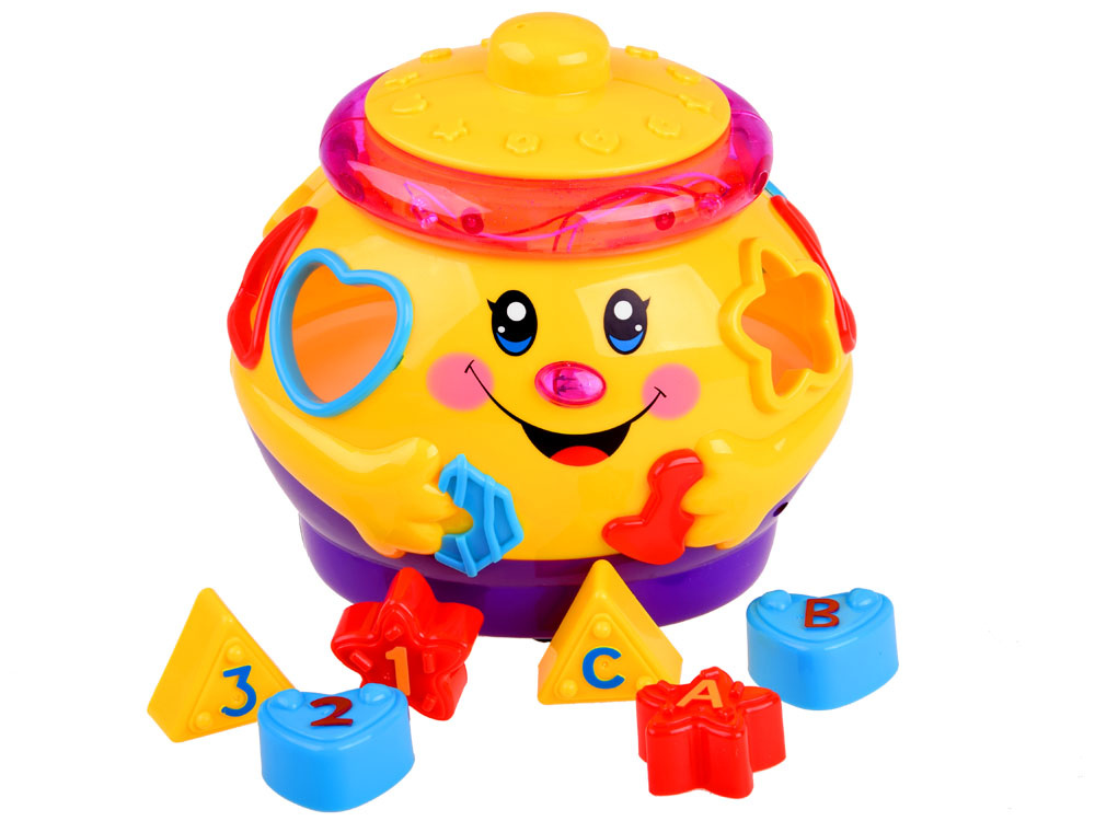 Jucărie interactivă din seria "învață și joacă-te", care se concentrează pe învățarea prin joc. Jucăria conține 6 cuburi colorate, care trebuie plasate în orificiile destinate acestora. Fiecare bloc are o formă diferită și este marcat cu un număr sau o literă. în timpul jocului, copilul învață să distingă formele, culorile. Oala veselă și colorată, după ce este pornită, cântă muzică veselă, se deplasează pe roți și se leagănă vesel, marginea luminează și clipește cu luminițe colorate. după introducerea blocurilor în sortatoare, acestea sunt plasate în burta oalei. Burtica voluminoasă a oalei poate găzdui nu doar cuburi, ci probabil și alte comori necesare pentru un copil mic.