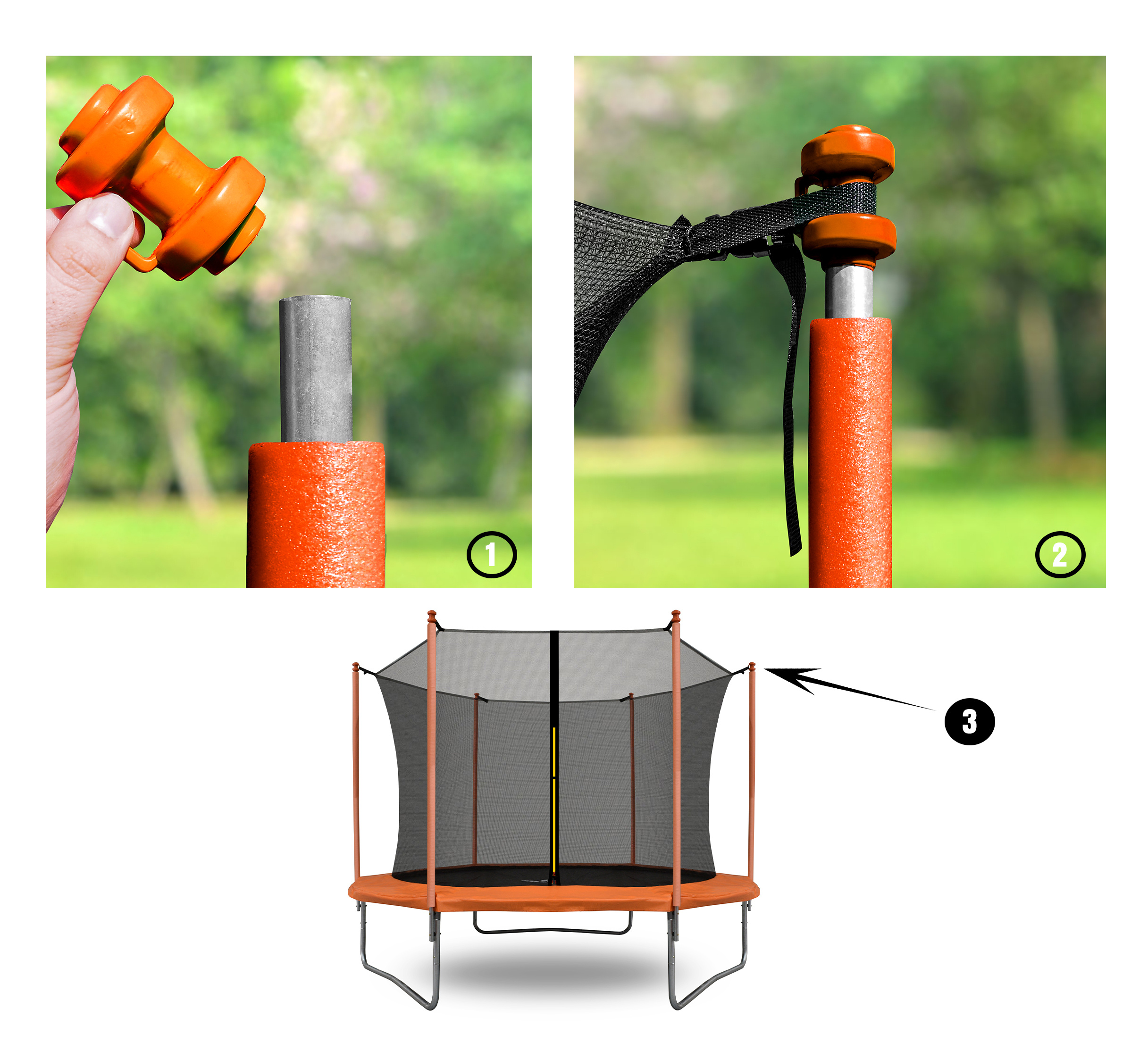 Capacul se montează pe bara superioară de protecție a plasei trambulinei, iar principala sa sarcină este de a preveni rănirea de marginea ascuțită.