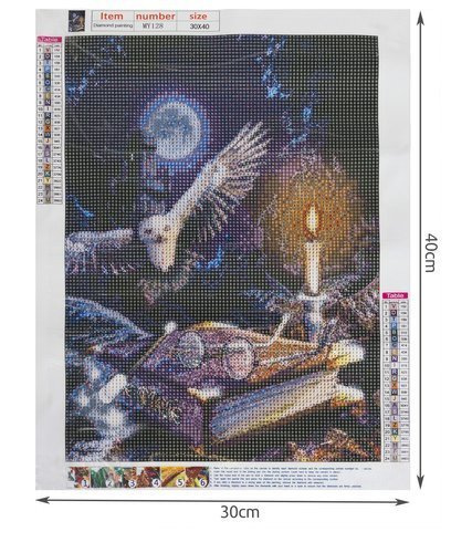 SPECIFICAȚII – model: bufniță; pânză acoperită cu strat adeziv: da; în set: diamante colorate, aplicator, adeziv uscat, recipient; dimensiune: 30x40 cm; dimensiunea imaginii: 25x35cm; greutate: 0,1 kg; greutate în ambalaj: 0,103 kg
