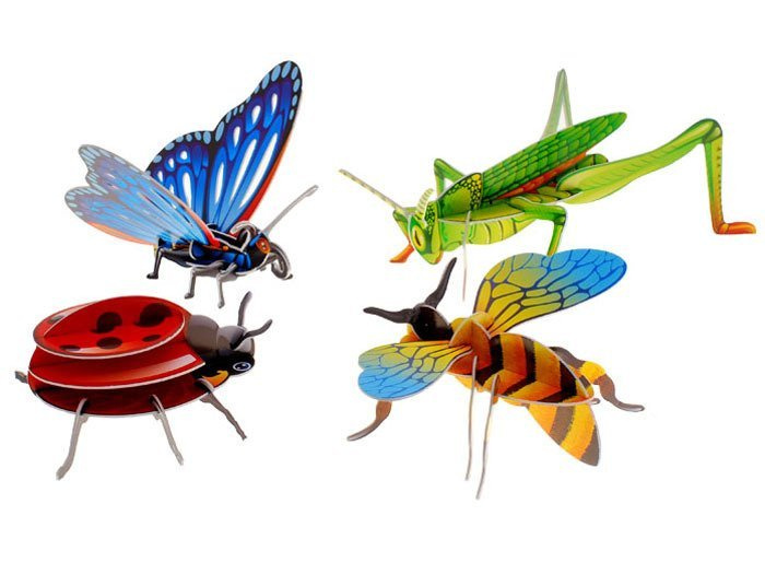 Set fantastic de puzzle 3D, din care puteți asambla insecte frumoase și colorate. Este o distracție grozavă atât pentru începătorii în puzzle-uri, cât și pentru modelatori. Prin asamblarea insectelor, dezvoltăm imaginația spațială și, în același timp, ne familiarizăm cu acest grup de animale care nu este întotdeauna pe deplin îndrăgit :) Jocul aduce o mare satisfacție, învață răbdarea și necesită precizie și delicatețe. Vârsta recomandată 3+
