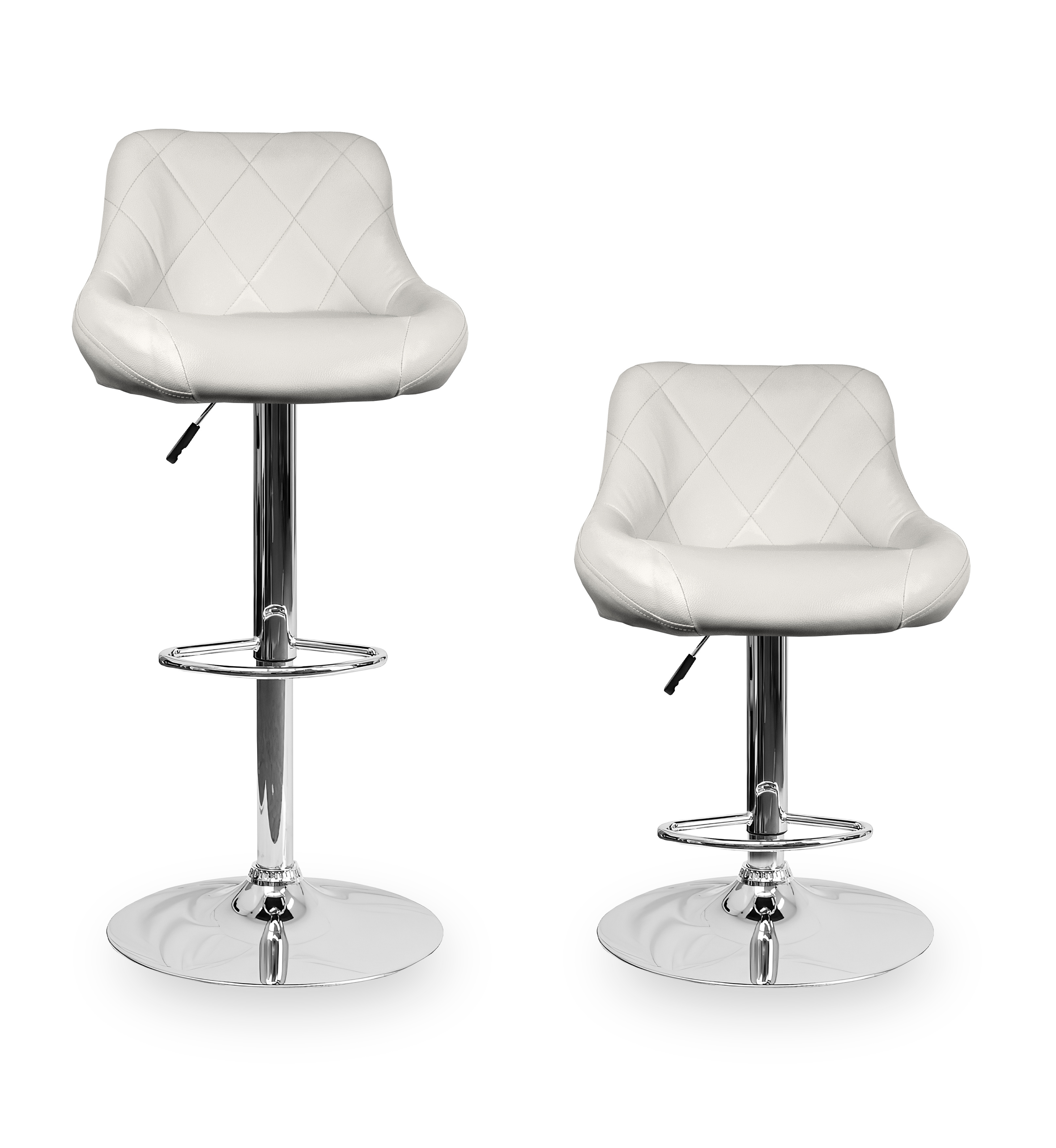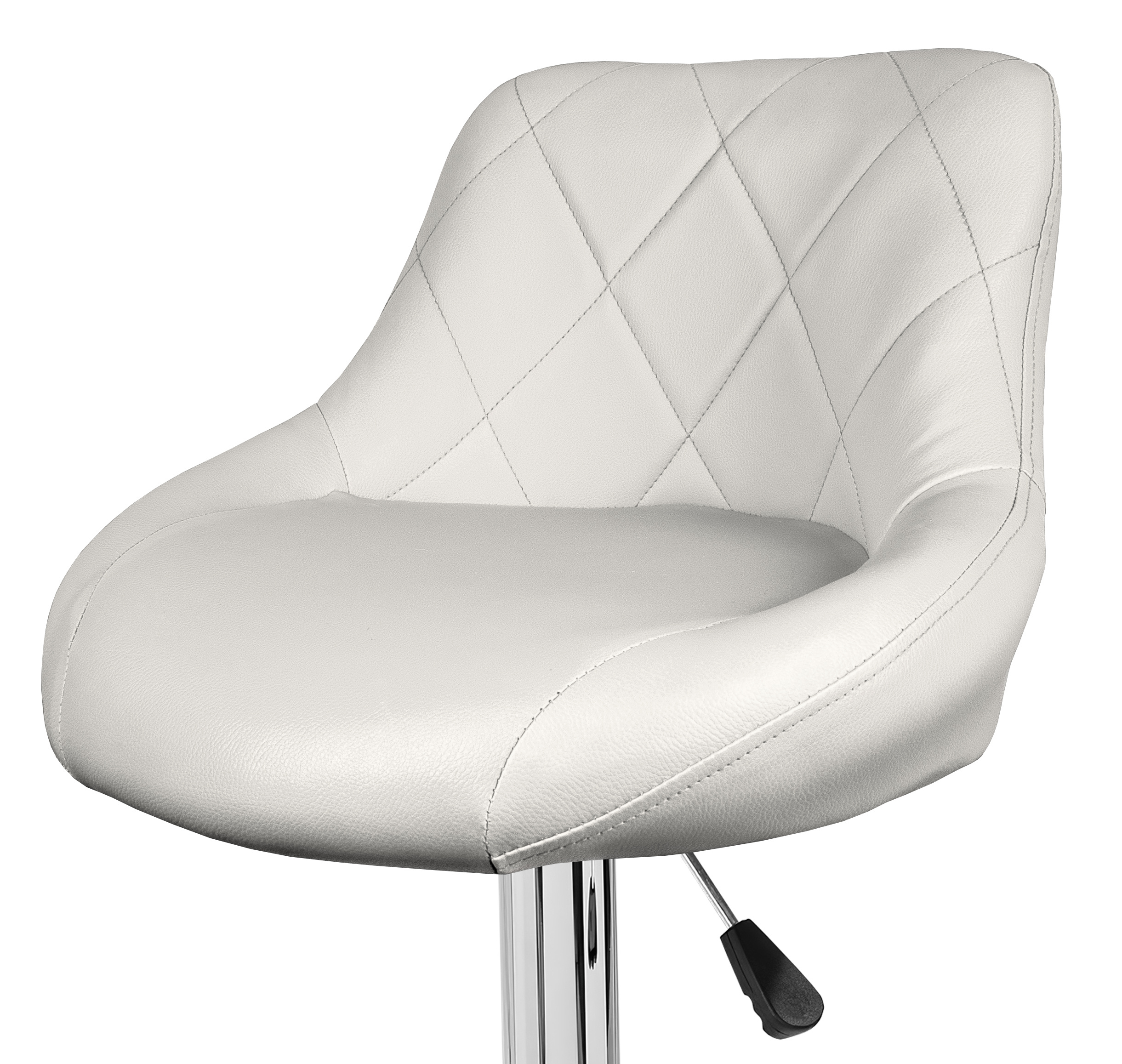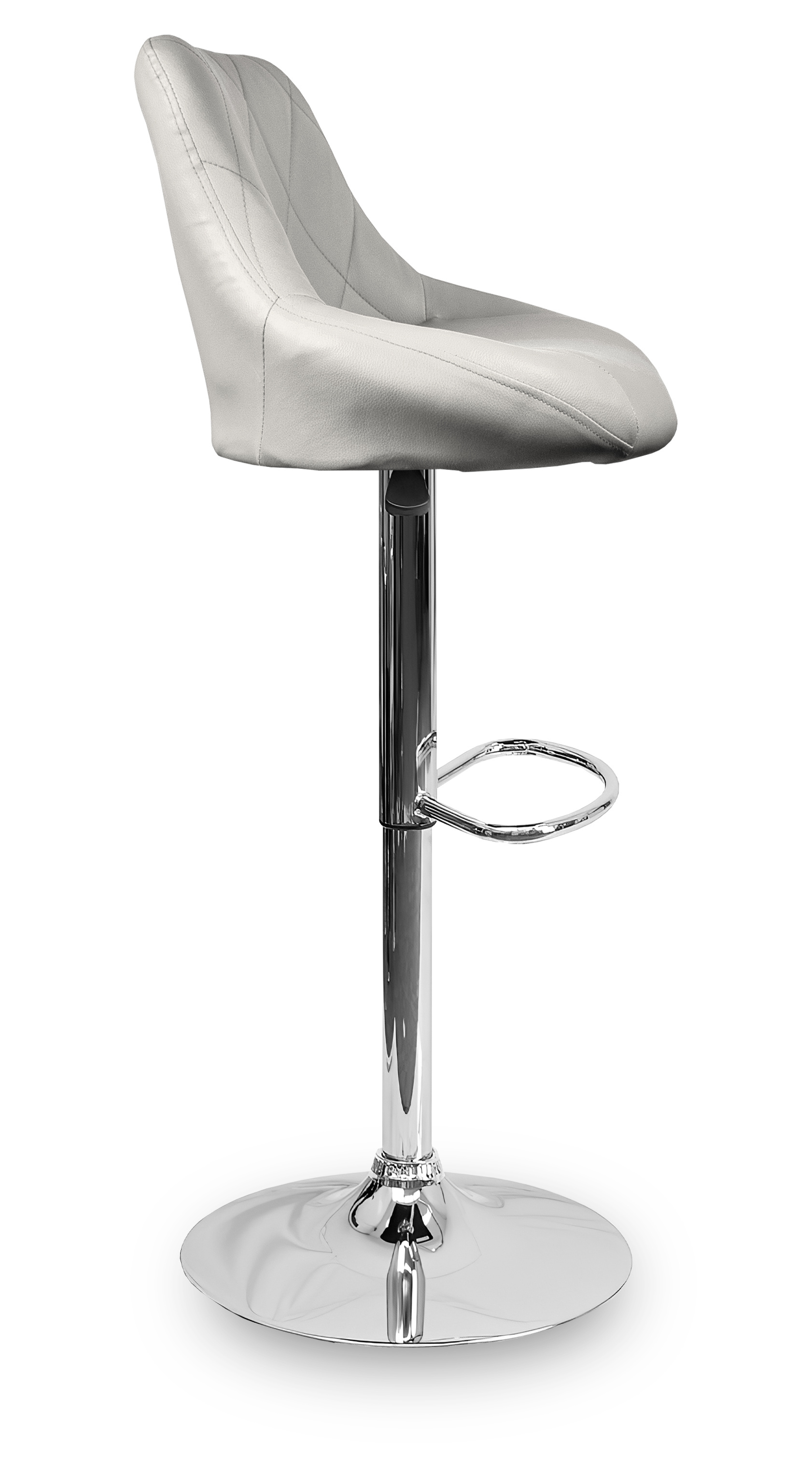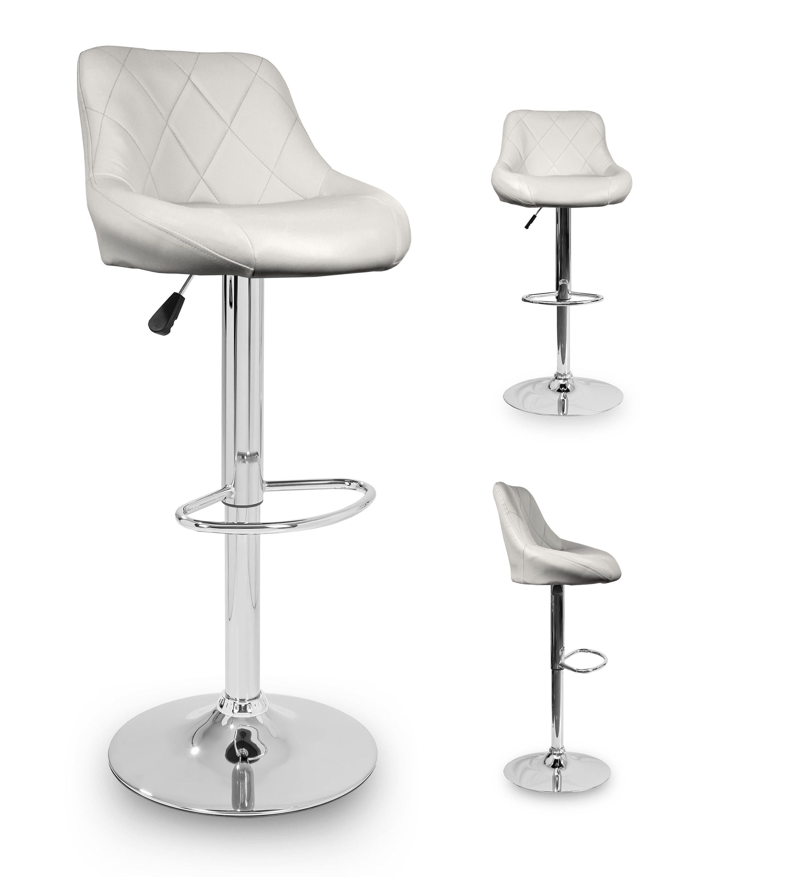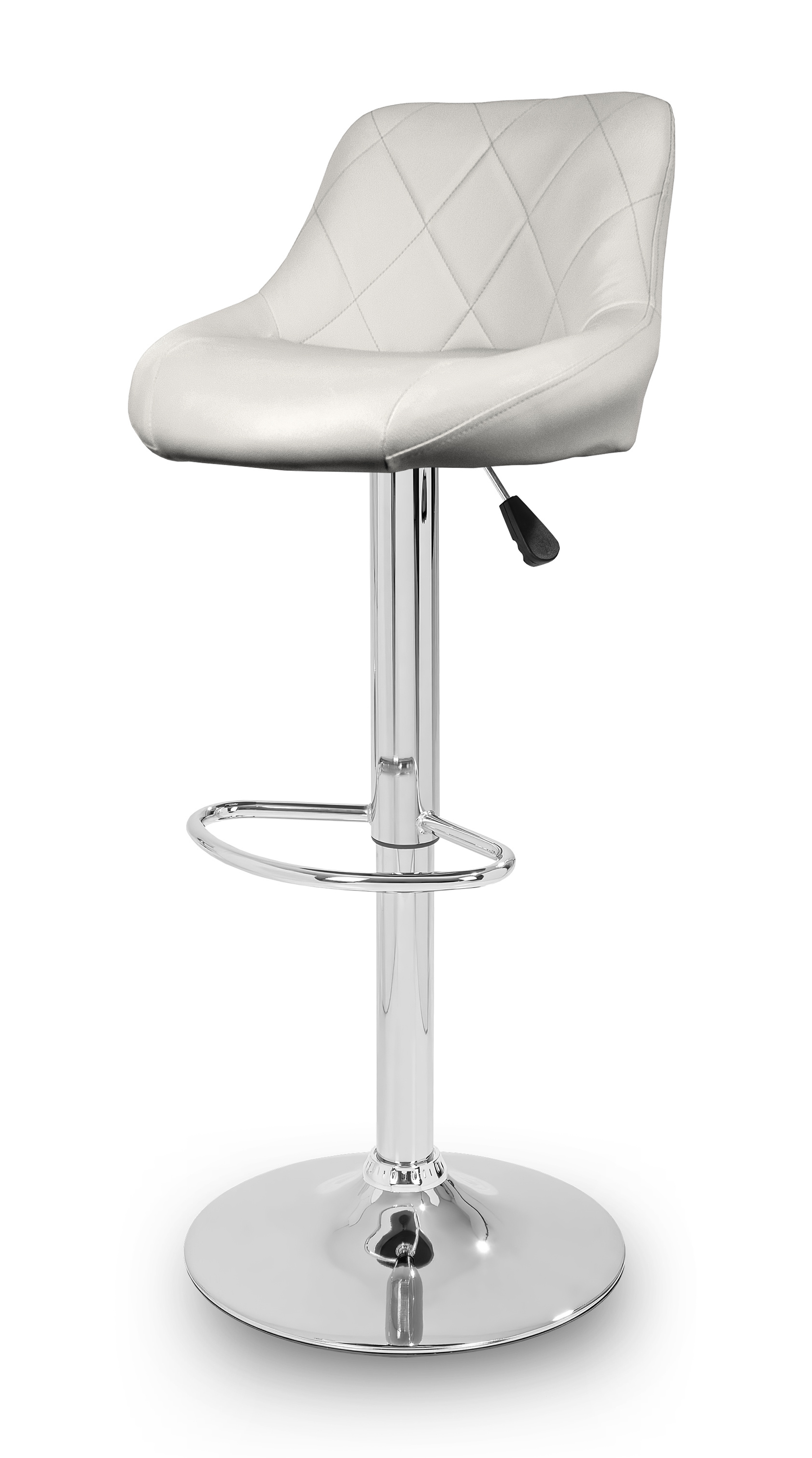Scaunul are un suport practic pentru picioare din metal cromat. Baza circulară și piciorul central sunt din crom lucios.
