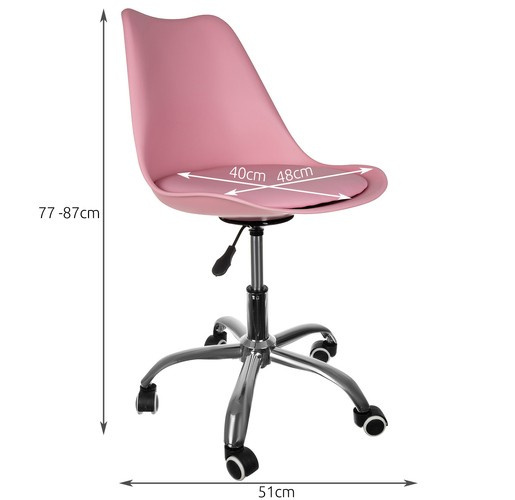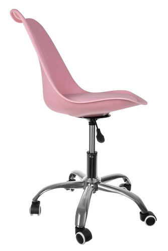 SPECIFICAȚII - culoare: roz + crom; material: polipropilenă + pernă din piele ecologică; roți: din cauciuc;mecanism: pârghie; sarcină maximă 150 kg; dimensiuni pernă (lungime / lățime): 44 x 38 cm; dimensiuni șezut (lungime / lățime): 48 x 40 cm; dimensiuni spătar (lățime / lungime): sus 30 - jos 47 x 40 cm; reglare înălțime scaun: 77-87cm;greutate fotoliu: 5,15 kg; greutate cu ambalaj: 7,16 kg.