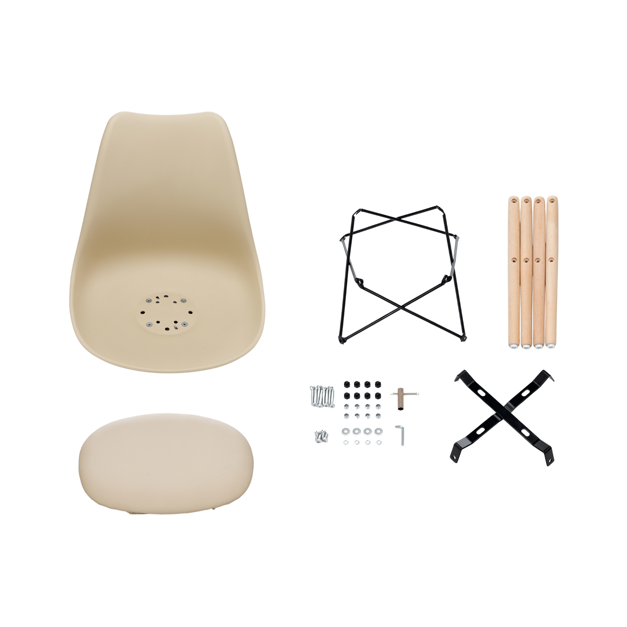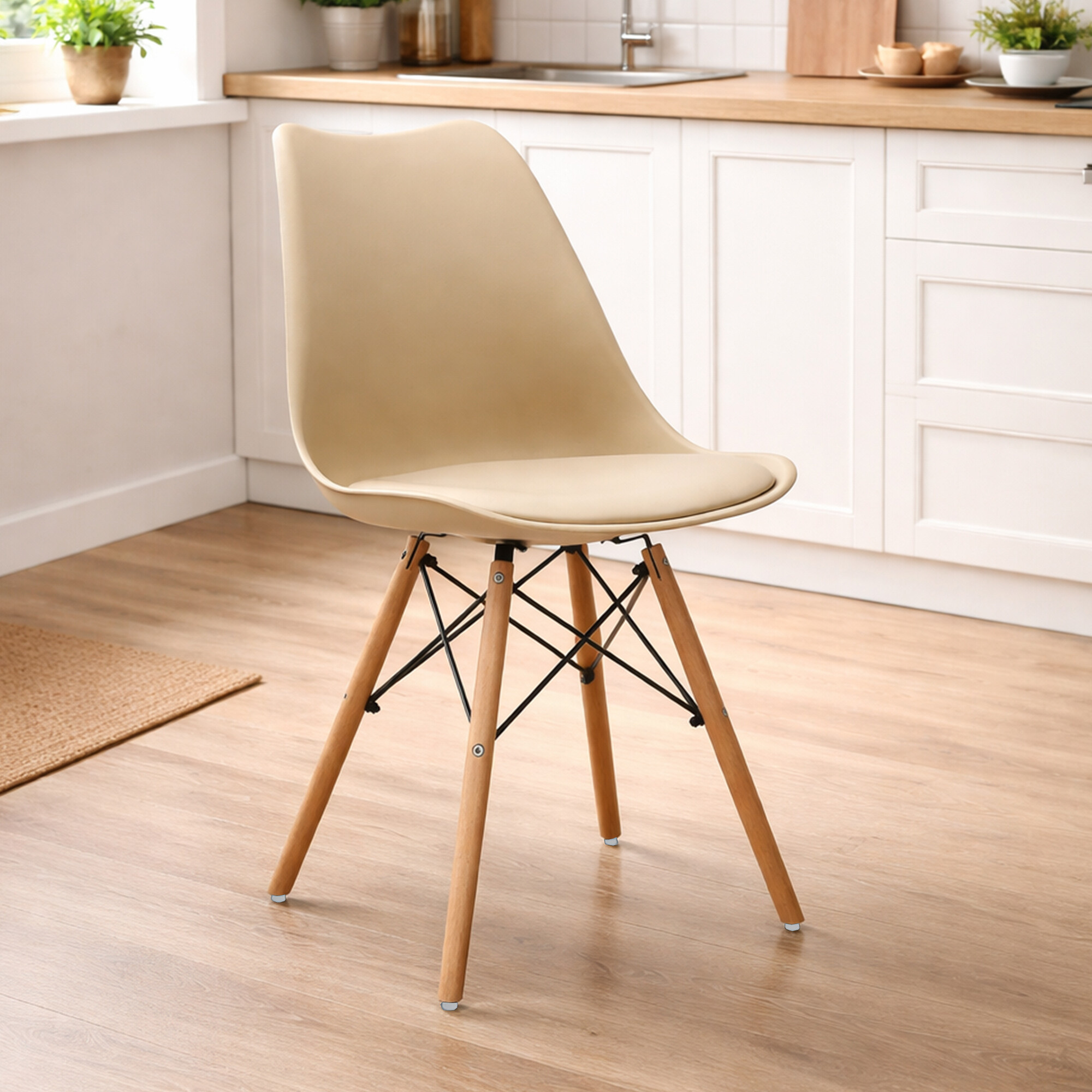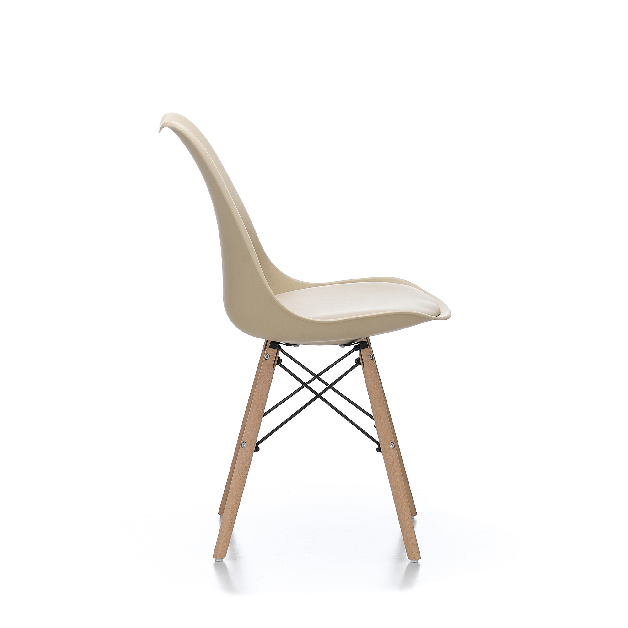 Scaunul este fabricat din polipropilenă de calitate și durabilă, cu o pernă acoperită cu piele artificială, în combinație cu picioare din lemn de fag.
