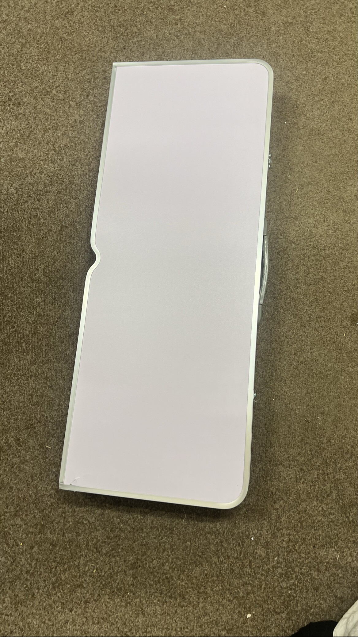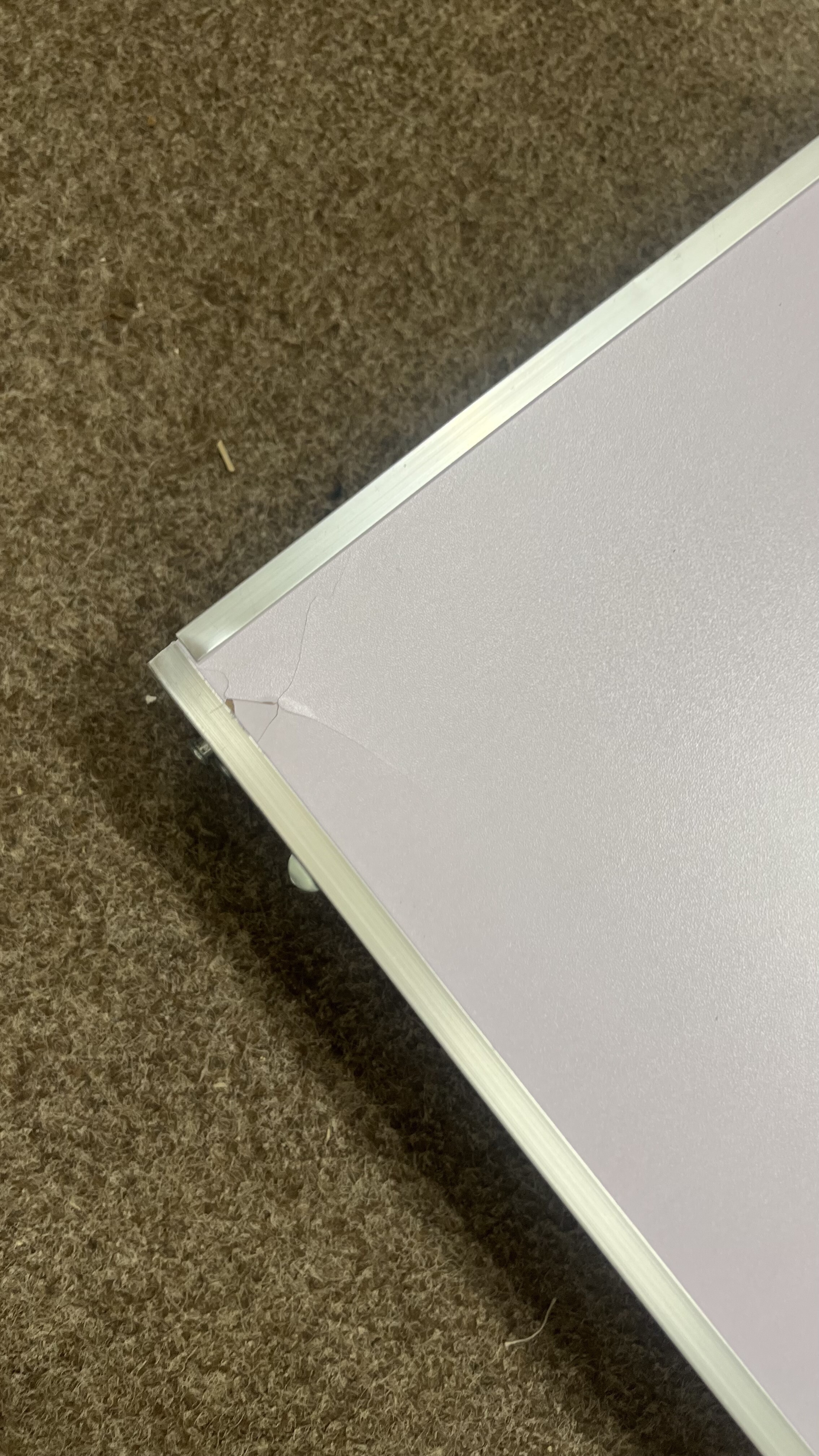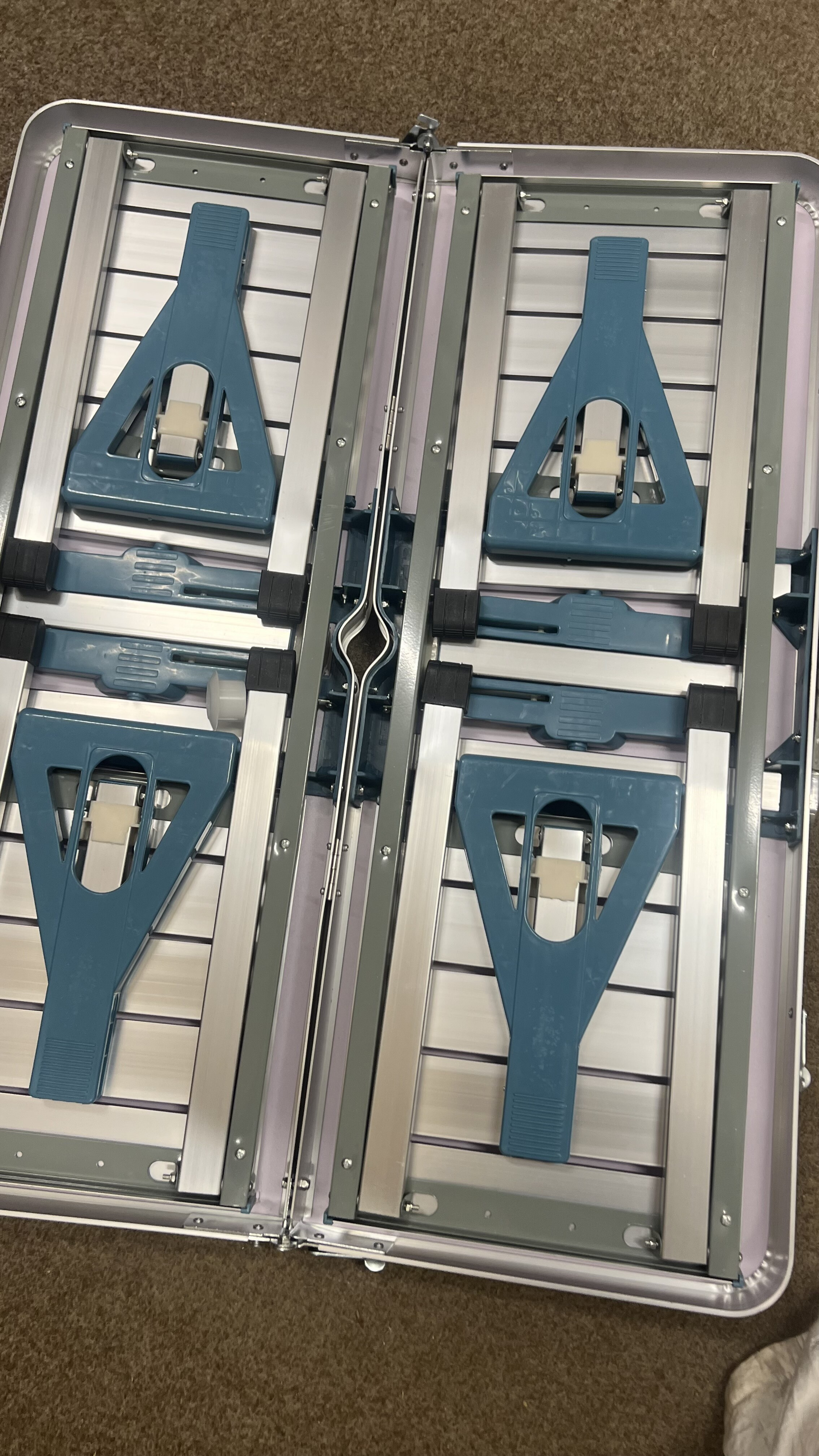 Setul de camping pliabil este complet și pe deplin funcțional. Defectul constă în fisuri pe placă în două colțuri, iar suprafața este, de asemenea, ușor zgâriată și prăfuită în unele locuri.