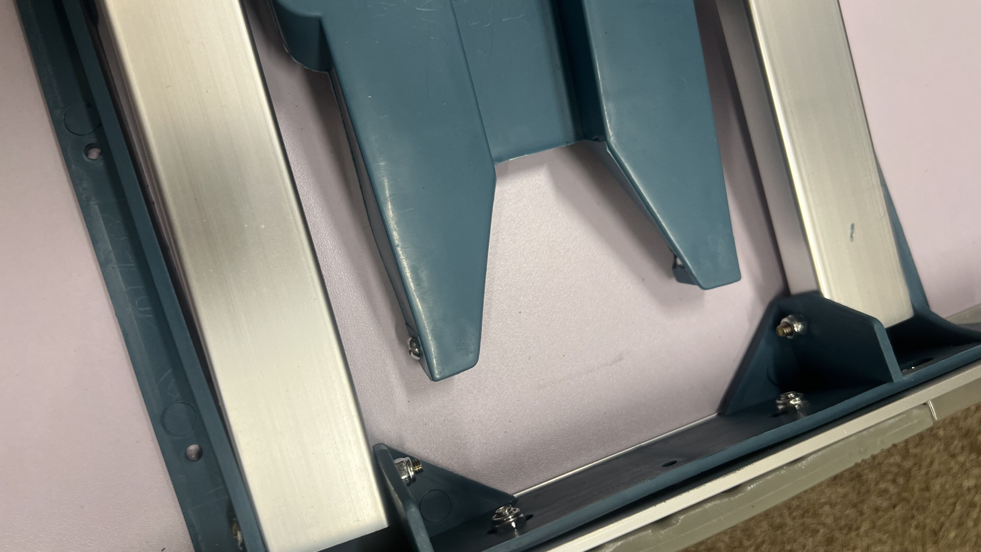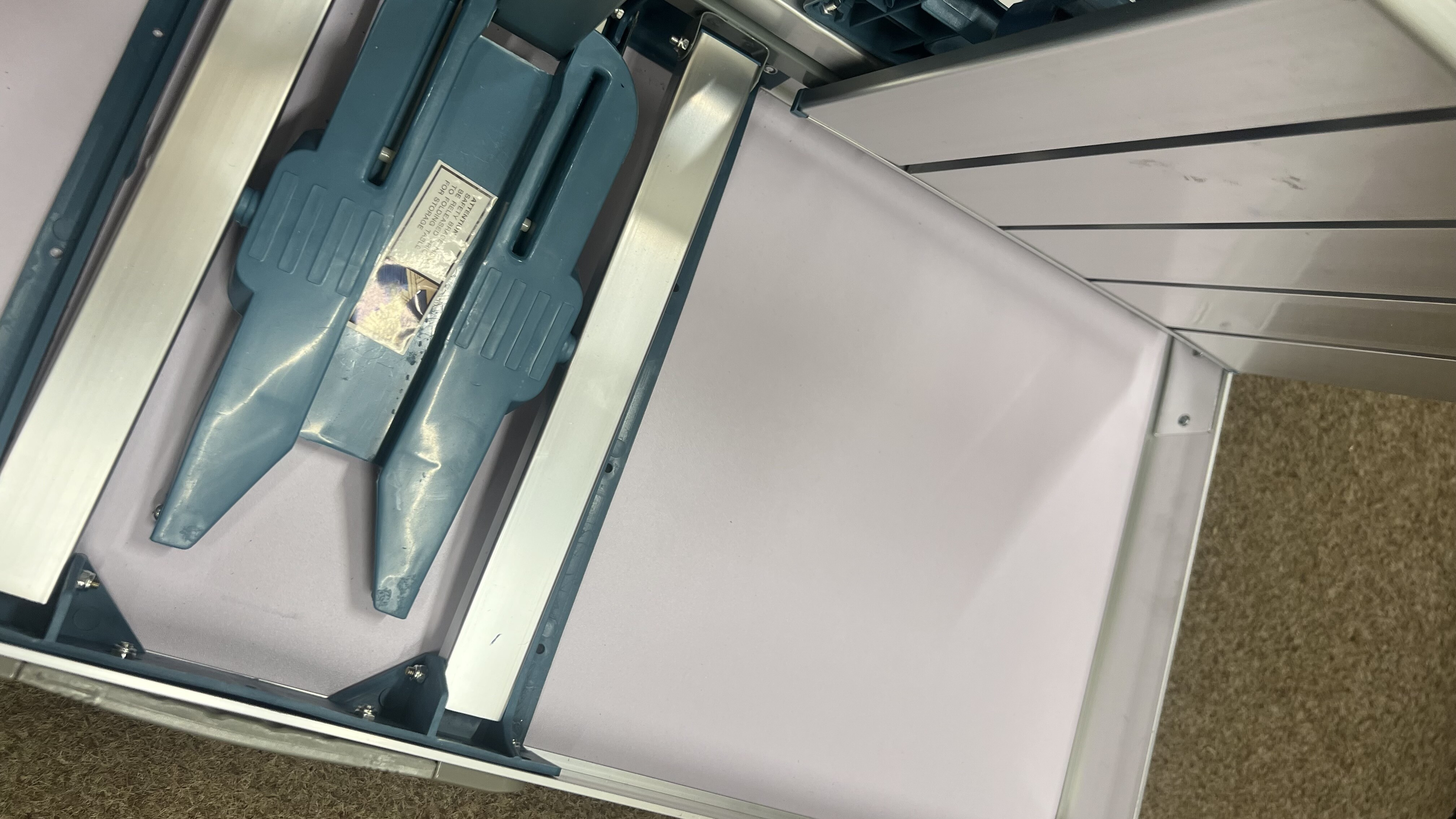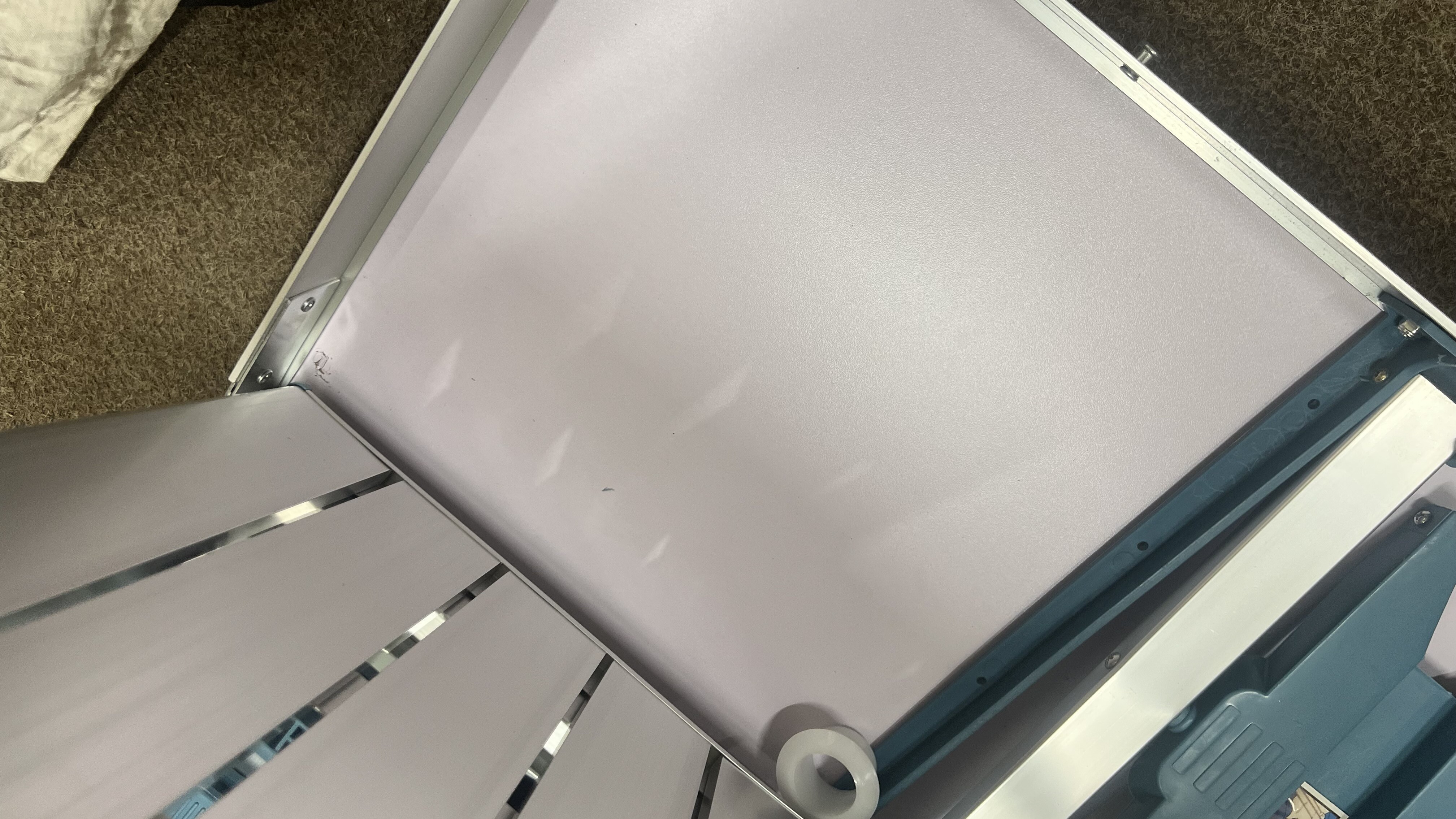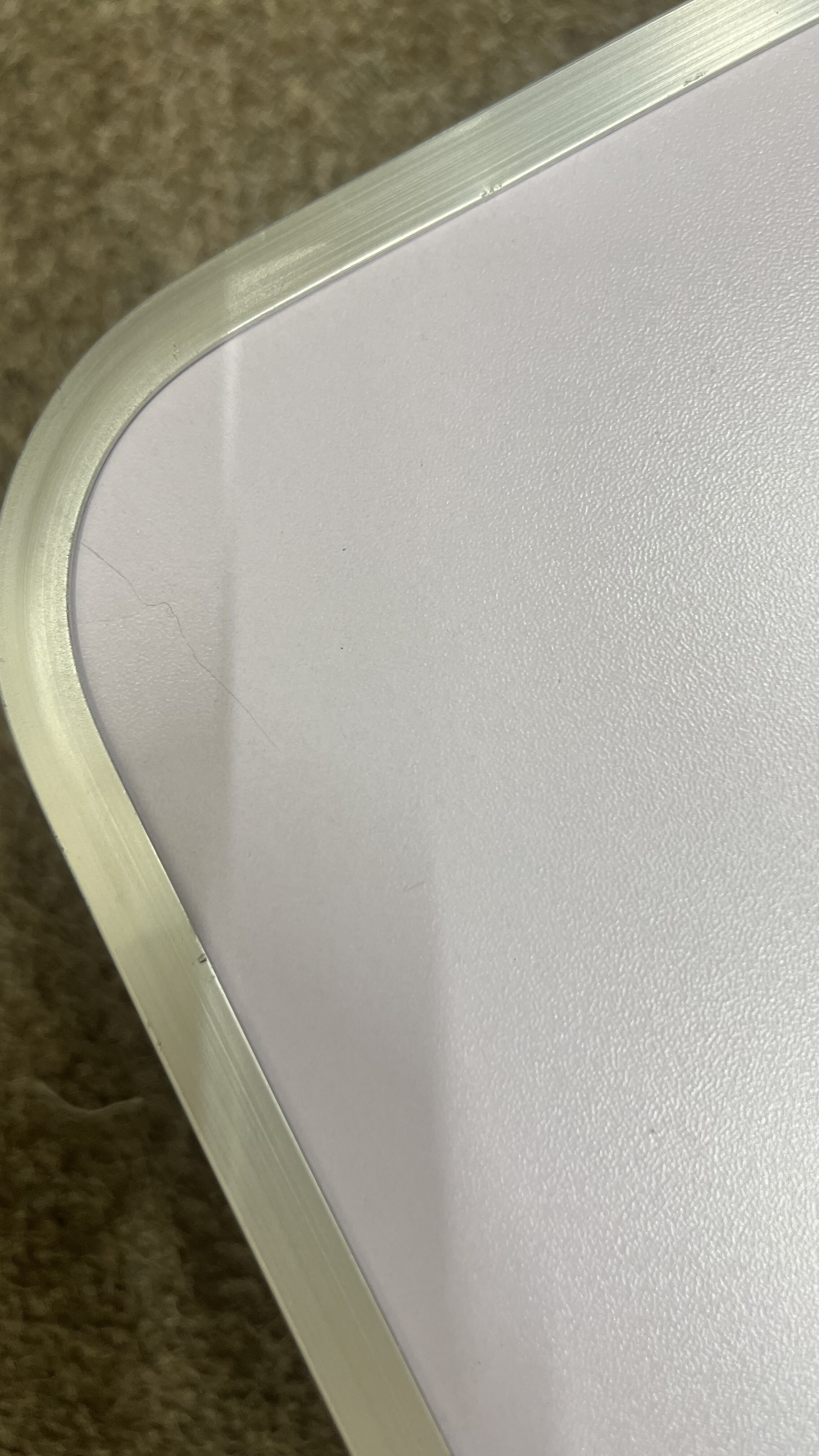 Setul de camping pliabil este complet și pe deplin funcțional. Defectul constă în fisuri pe placă în două colțuri, iar suprafața este, de asemenea, ușor zgâriată și prăfuită în unele locuri.