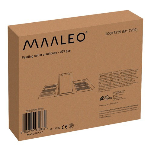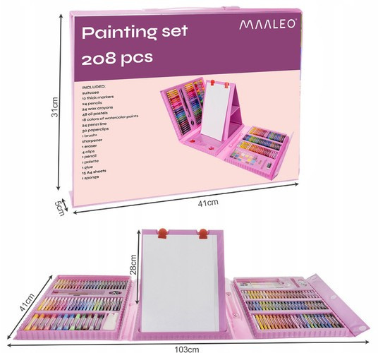 GSET GIGANTIC- setul de pictură în valiză are până la 208 elemente, inclusiv: valiză cu 12 markere groase, 24 creioane, 24 creioane cerate, 48 pasteluri uleioase, 18 culori acuarelă, 24 markere, 1 riglă, 30 agrafe de birou, 1 pensulă, 1 ascuțitoare, gumă de șters, 4 cleme, 1 creion, 1 paletă, 1 lipici, 15 foi A4, 1 burete.