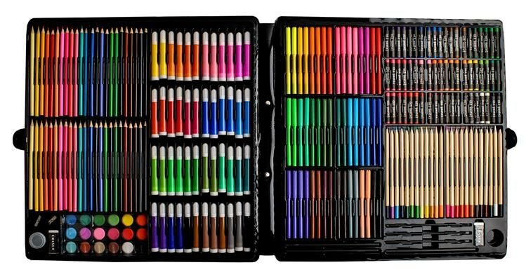 288 PIESE - Cu ajutorul unei selecții uriașe de 72 de creioane colorate, 96 de markere, 60 de pasteluri uleioase, 18 culori de acuarelă, 3 creioane, 3 pensule cu recipient pentru apă, 30 de agrafe de birou, ascuțitori și 2 gume, putem crea cu ușurință cele mai exigente, creative și originale lucrări.