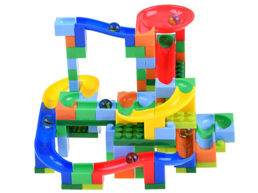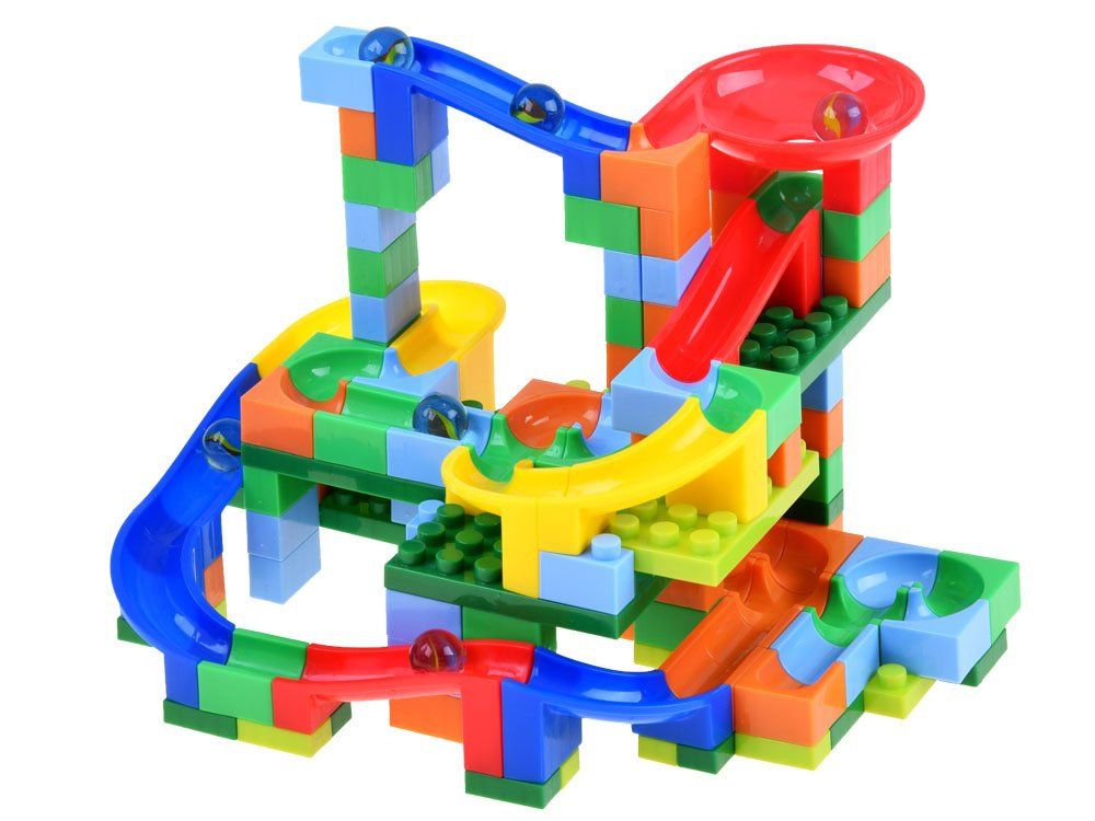 Setul conține cuburi de diferite forme și culori, din care se poate construi o pistă de bile în spirală.