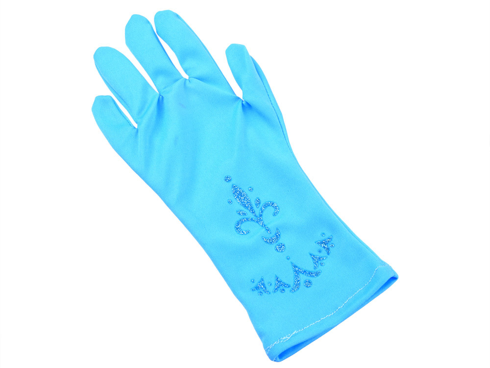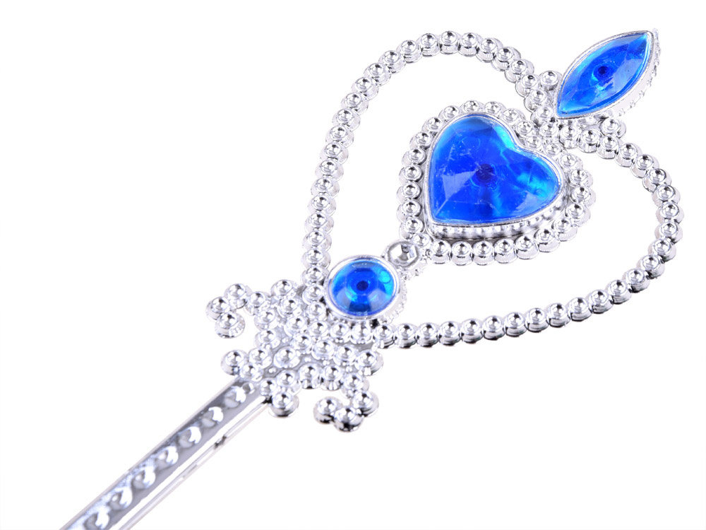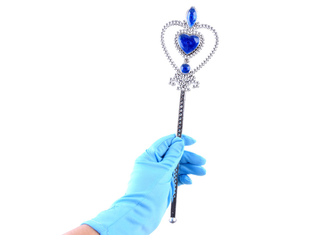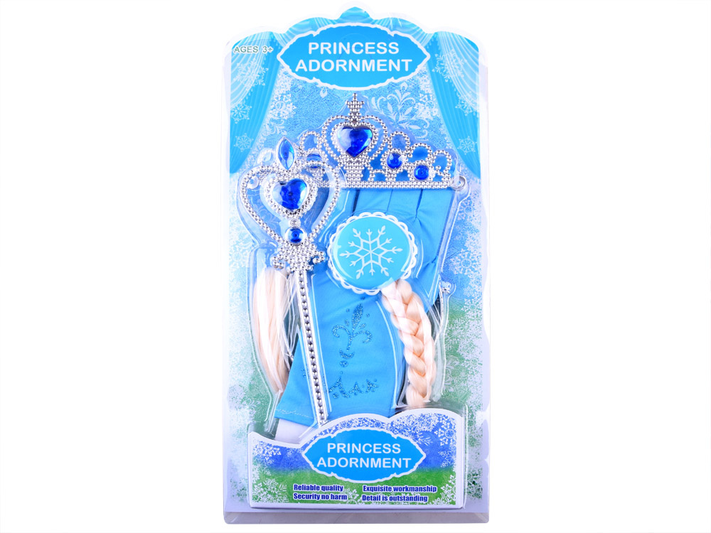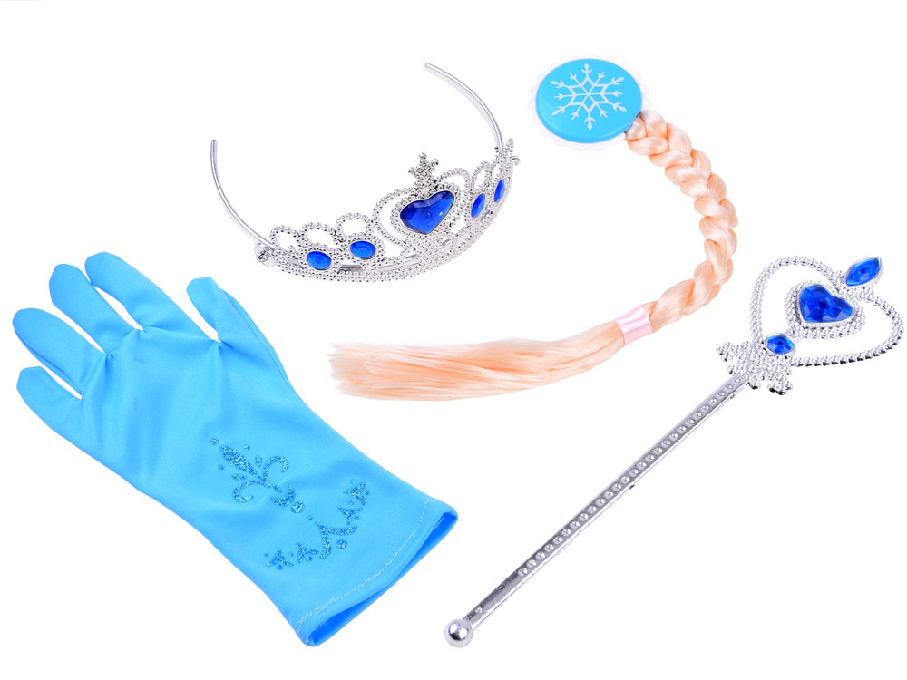 O agrafă decorativă albastră cu o coadă lungă blondă atașată se fixează ușor și, mai ales, vă ajută să vă asemănați cu frumoasa prințesă din basmul preferat. Coroana și sceptrul sunt accesorii indispensabile pentru orice regină, prințesă sau prințesă, de aceea au fost realizate cu măiestrie și frumos decorate cu cristale de plastic albastre. Mănușa albastră cu un decor frumos și elegant va completa perfect ținuta unei fetițe.