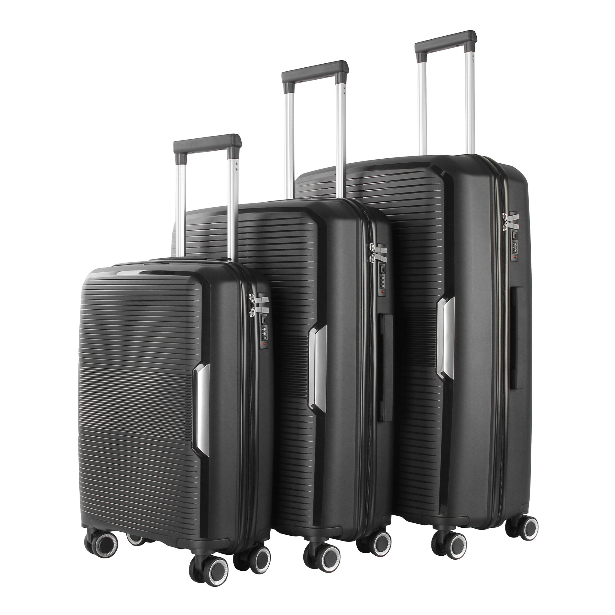 Fiecare valiză este echipată cu 4 roți pivotante și duble, care permit o manipulare ușoară și lină în toate direcțiile. Datorită acestor roți, puteți muta cu ușurință valizele chiar și în spații înguste, cum ar fi holurile aeroporturilor sau coridoarele hotelurilor. În plus, roțile duble asigură o stabilitate mai mare și rezistență la uzură.