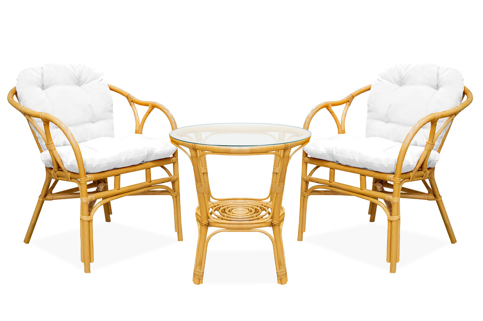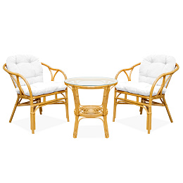 - Setul conține: Fotolii din ratan, masă cu sticlă și set complet de perne