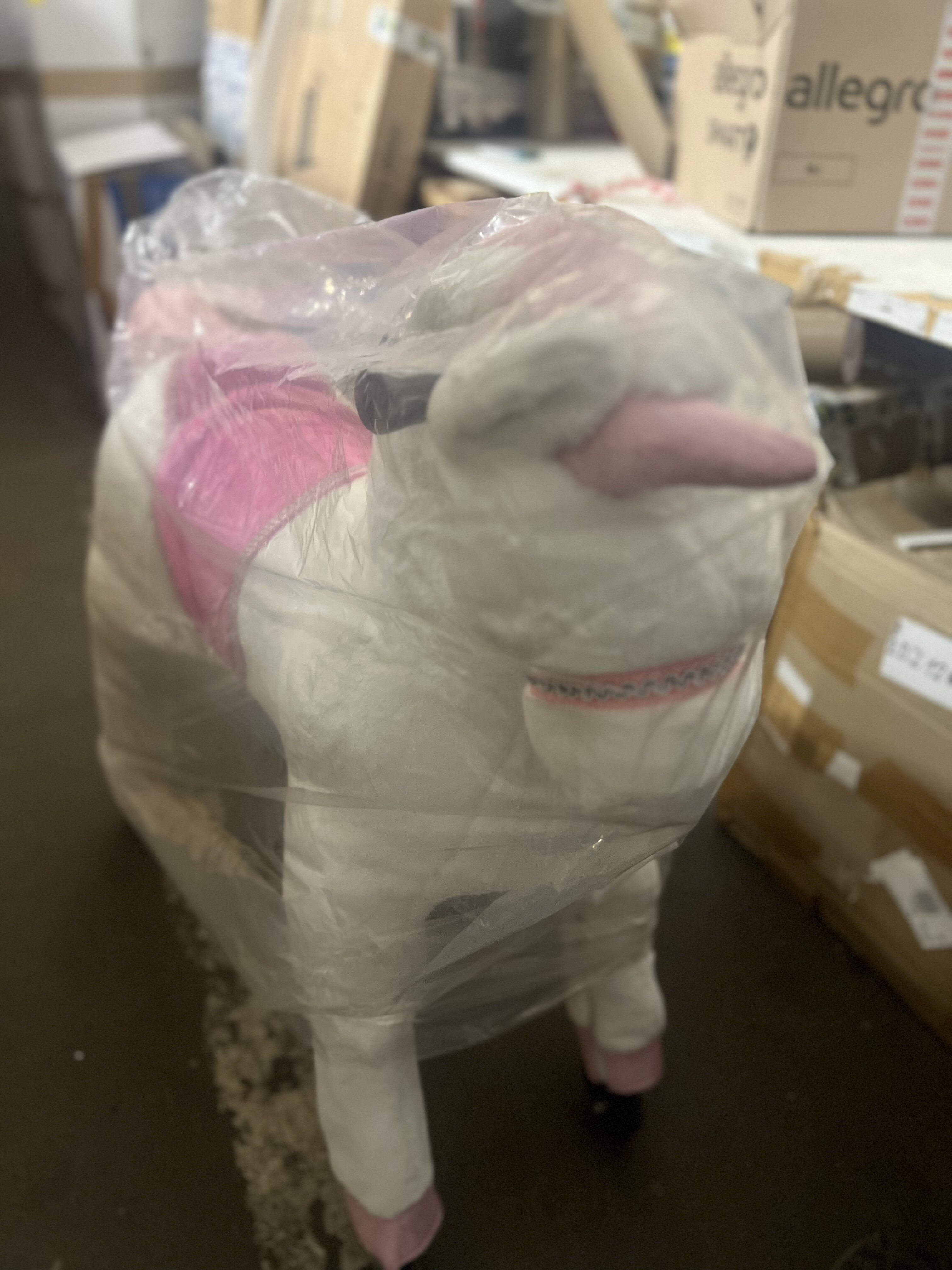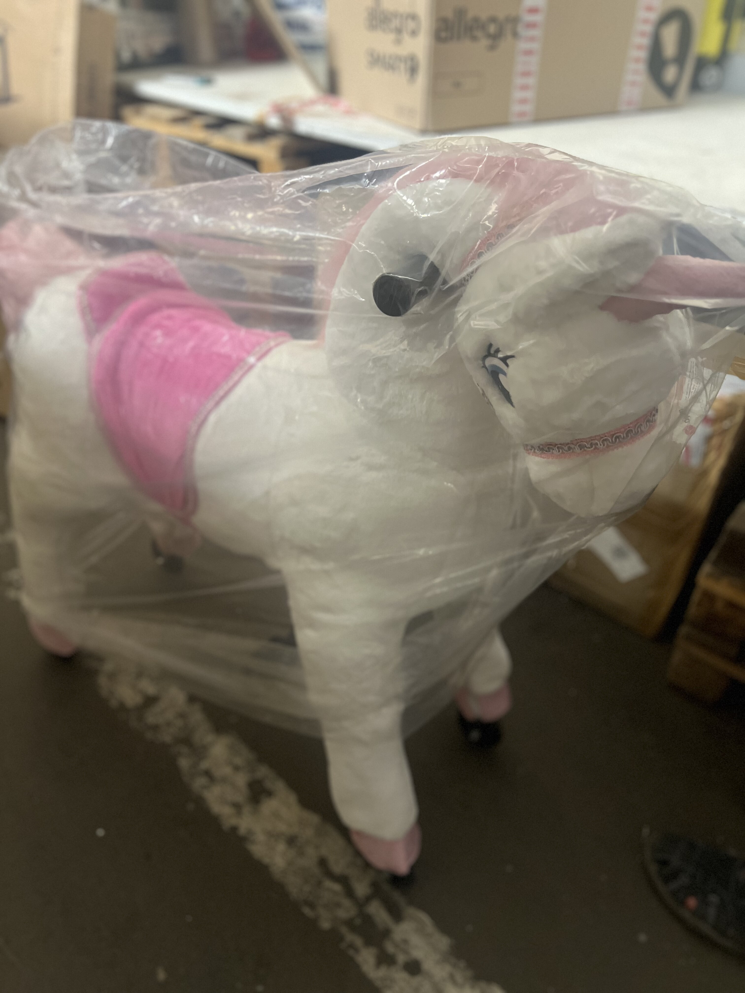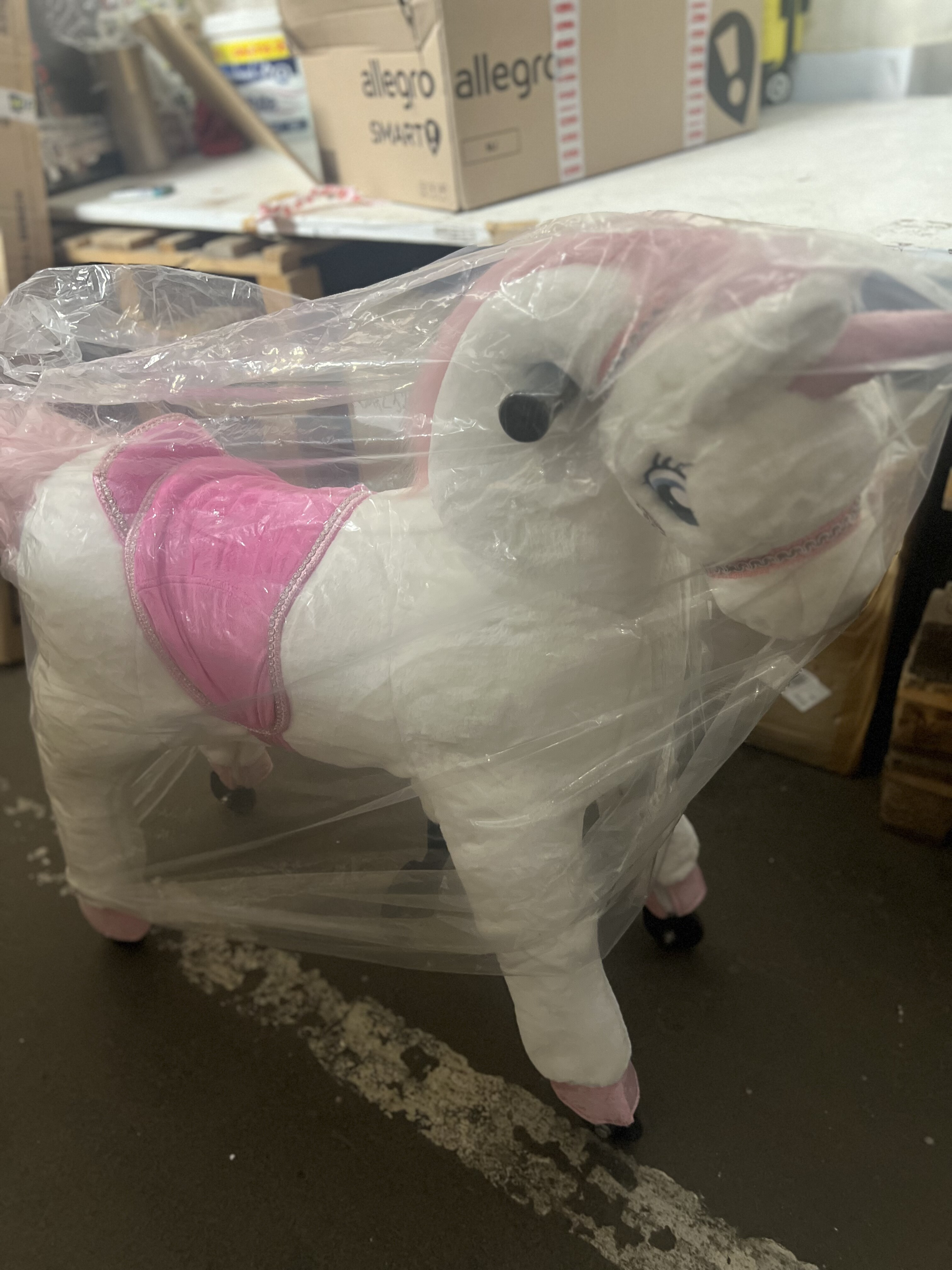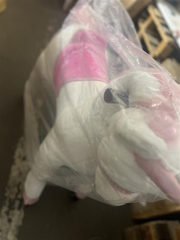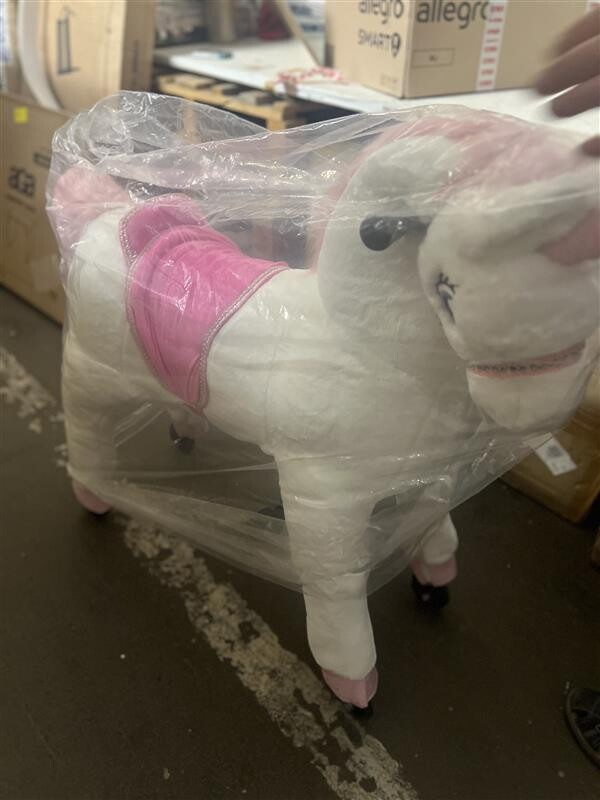 Cal mândru de călărie unicorn Unicorn pe roți. Calul pornește la galop atunci când călărețul se mișcă corect. Poneiul poate fi direcționat atât spre dreapta, cât și spre stânga. Calul este acoperit la suprafață cu pluș moale și este astfel foarte plăcut la atingere. Echipat cu fermoare și husă exterioară detașabilă. Calul este echipat cu mânere și pedale pentru picioare. Construcția robustă din metal asigură stabilitate și siguranță în utilizare. Capacitate minimă de încărcare. 25 kg maxim. 65 kg.Principalele caracteristici: înălțimea șeii 68 cm mișcările de balansare în timpul mersului antrenează echilibrul, coordonarea și agilitatea