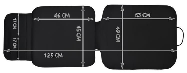 SPECIFICAȚII - dimensiuni totale (lungime / lățime) 125 / 49cm, dimensiuni șezut (lungime / lățime) 46 / 45cm, dimensiuni spătar (lungime / lățime) 63 / 49cm, greutate 240g.