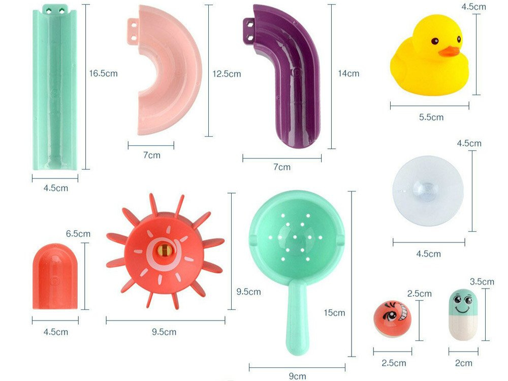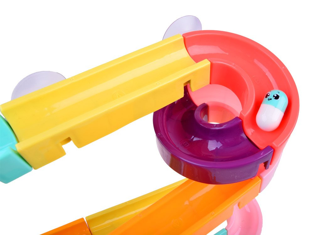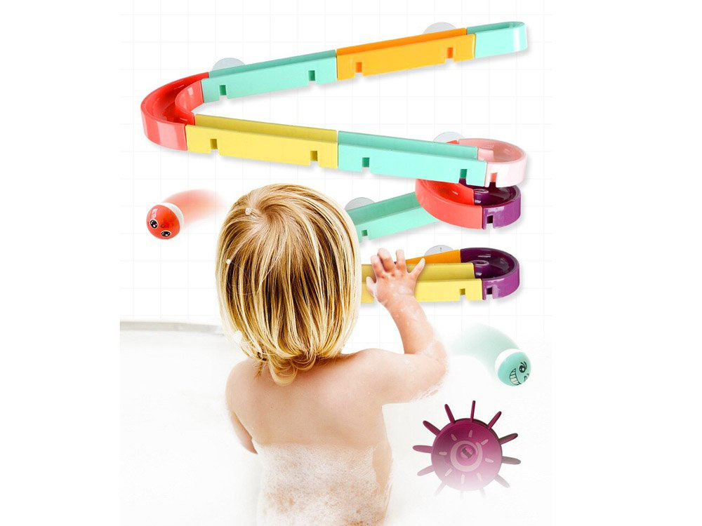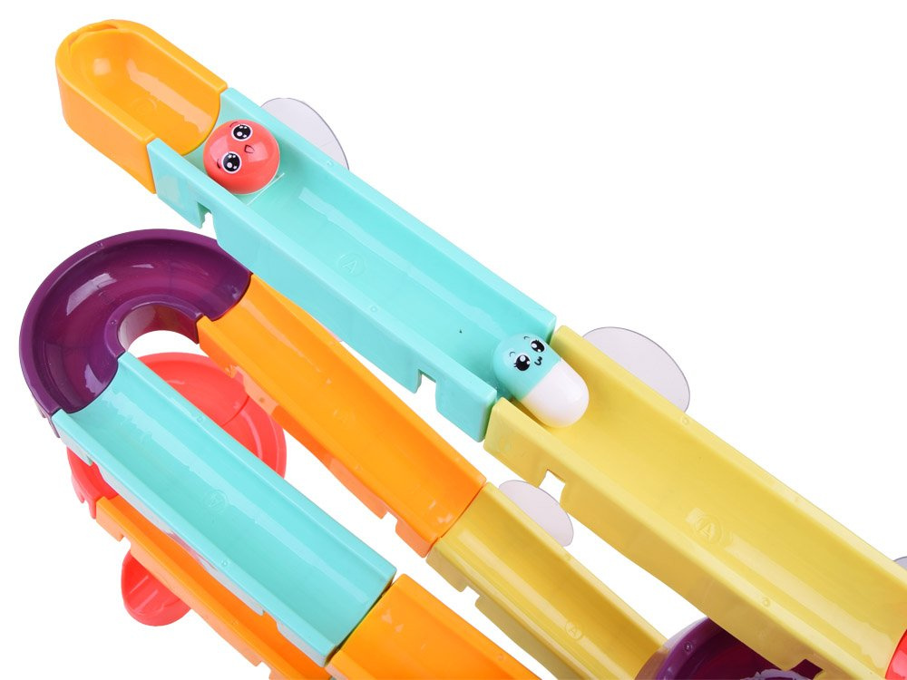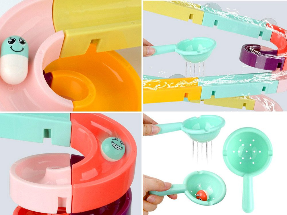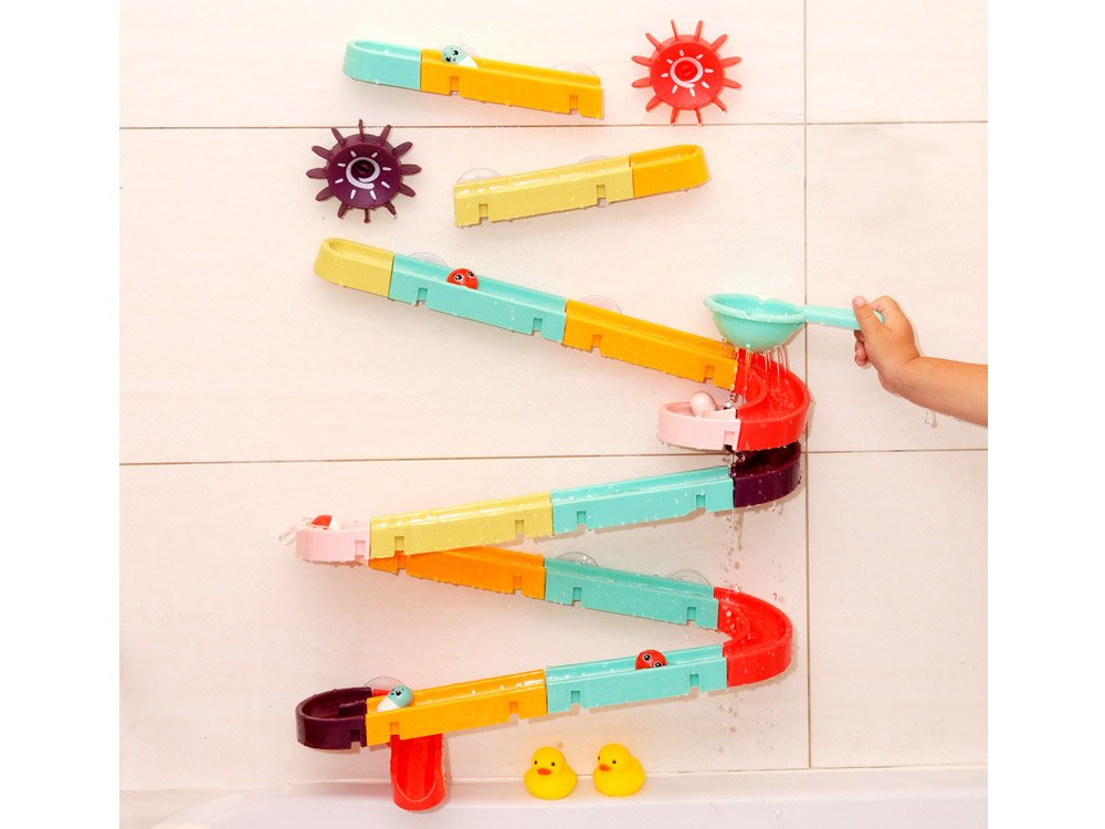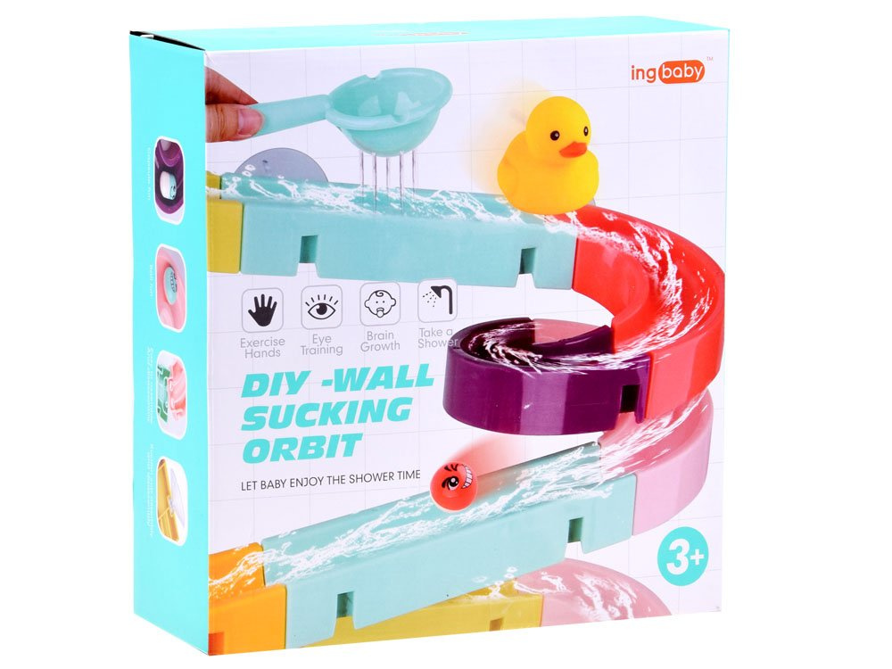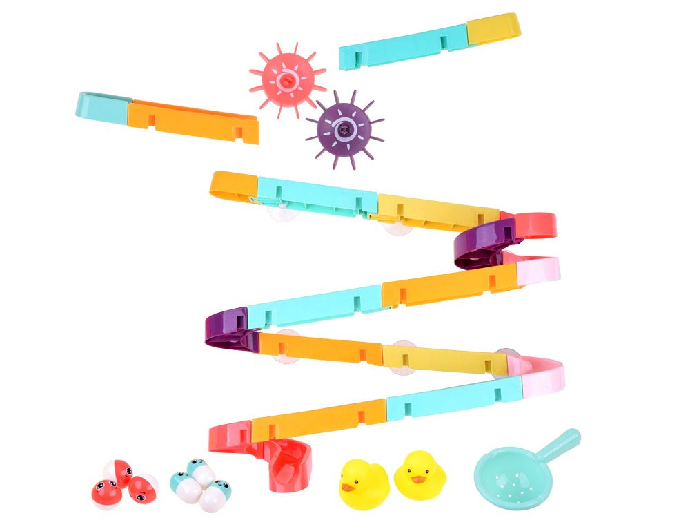 Setul este fabricat din plastic și are ventuze din silicon, astfel încât pista poate fi fixată pe faianța din baie. Pachetul include piese colorate pentru asamblarea unei piste în spirală, rațe de cauciuc, mingi, boabe și o sită. În timpul băii, copilul poate inventa jocuri fantastice cu o rățușcă fugară, o minge care se rostogolește și cilindri care pot fi lipiți unul lângă altul, astfel încât copilul să le poată roti pe amândouă simultan. Setul este compus din 44 de piese, din care puteți construi un tobogan.