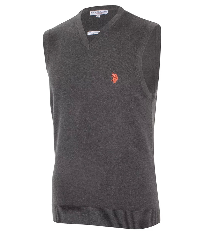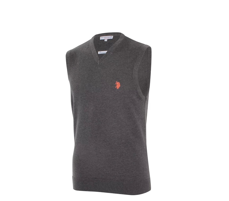 Vestă de marcă pentru bărbați de la firma U.S. Polo Assn. fabricat din 100% bumbac cu decolteu în V la gât, manșete elastice, nervuri pe mâneci șilogo brodat pe partea stângă a pieptului.